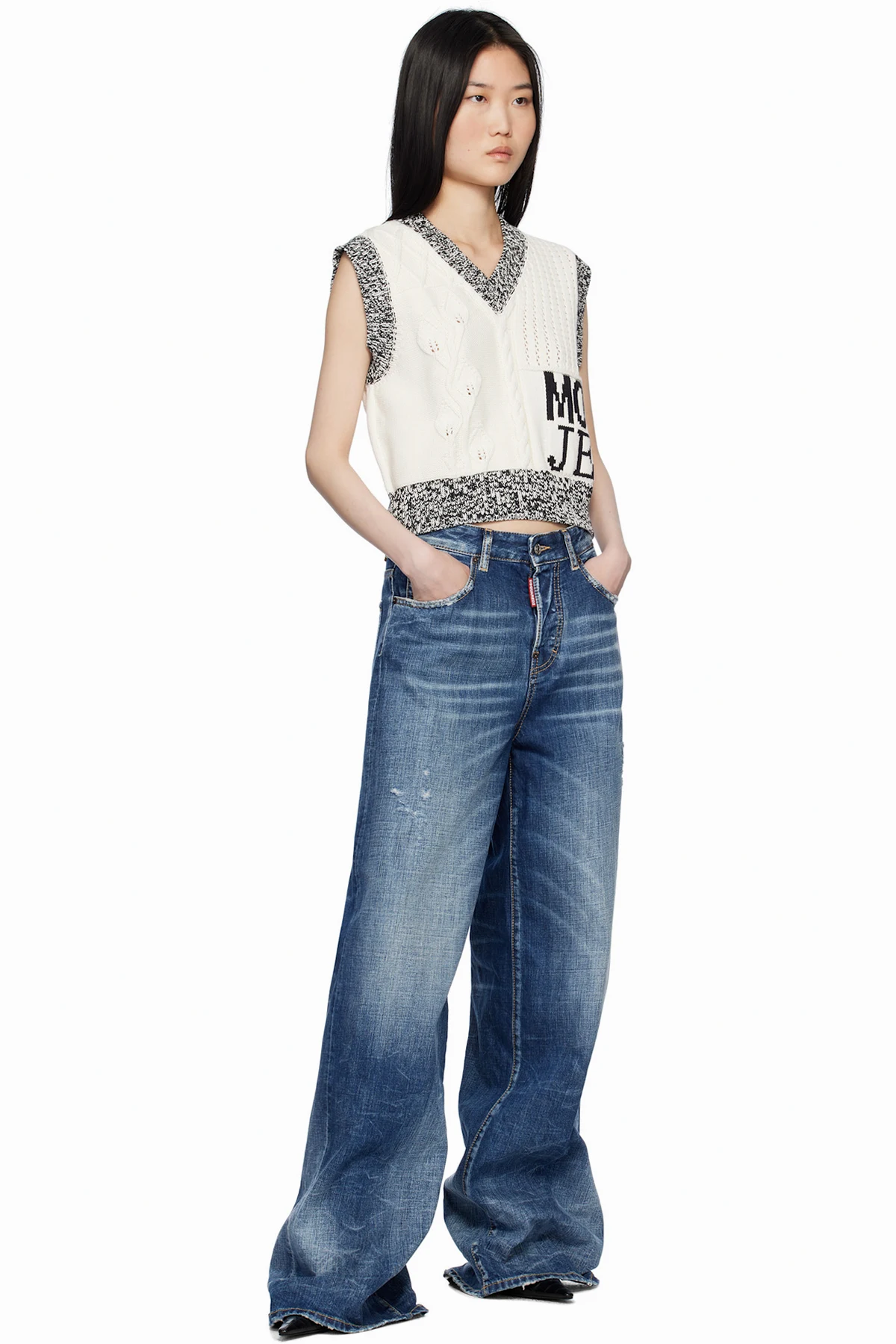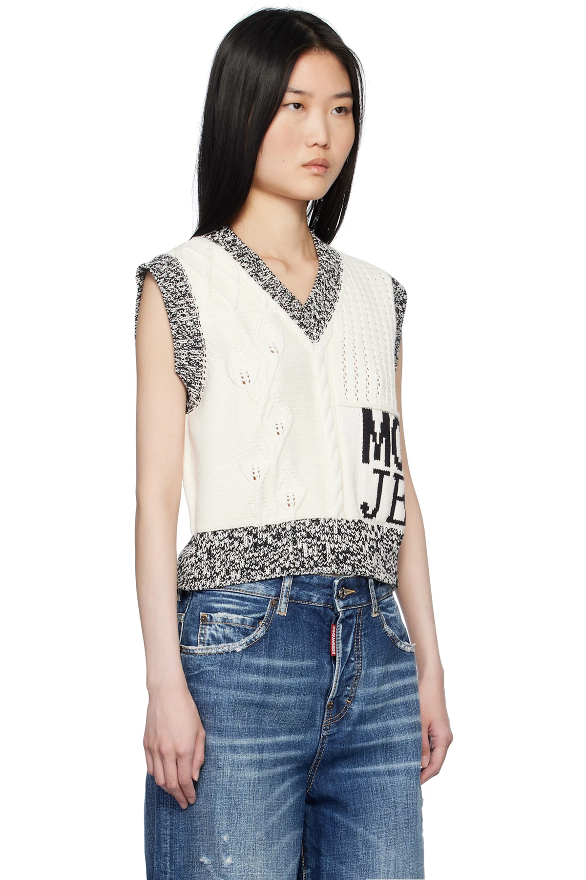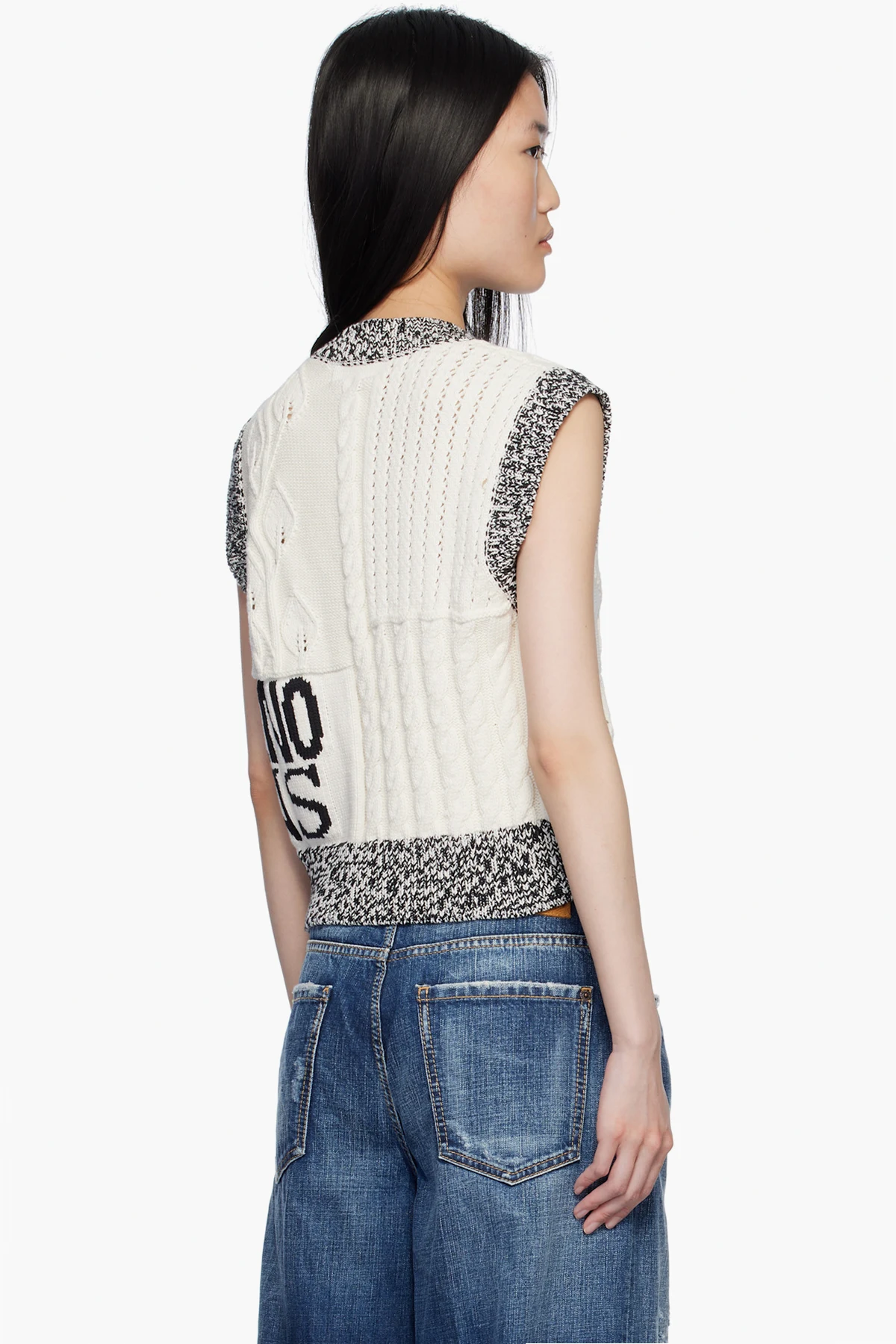 Knit cotton-blend vest. Cable-knit and open-knit detailing throughout.