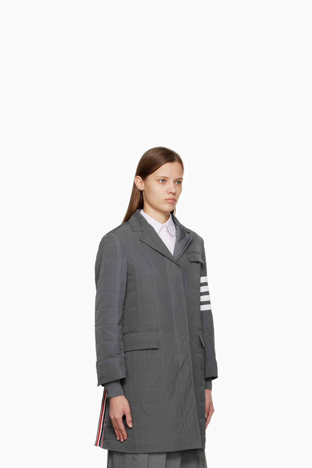 Down-filled quilted polyester twill coat. Concealed tricolor grosgrain trim throughout.
