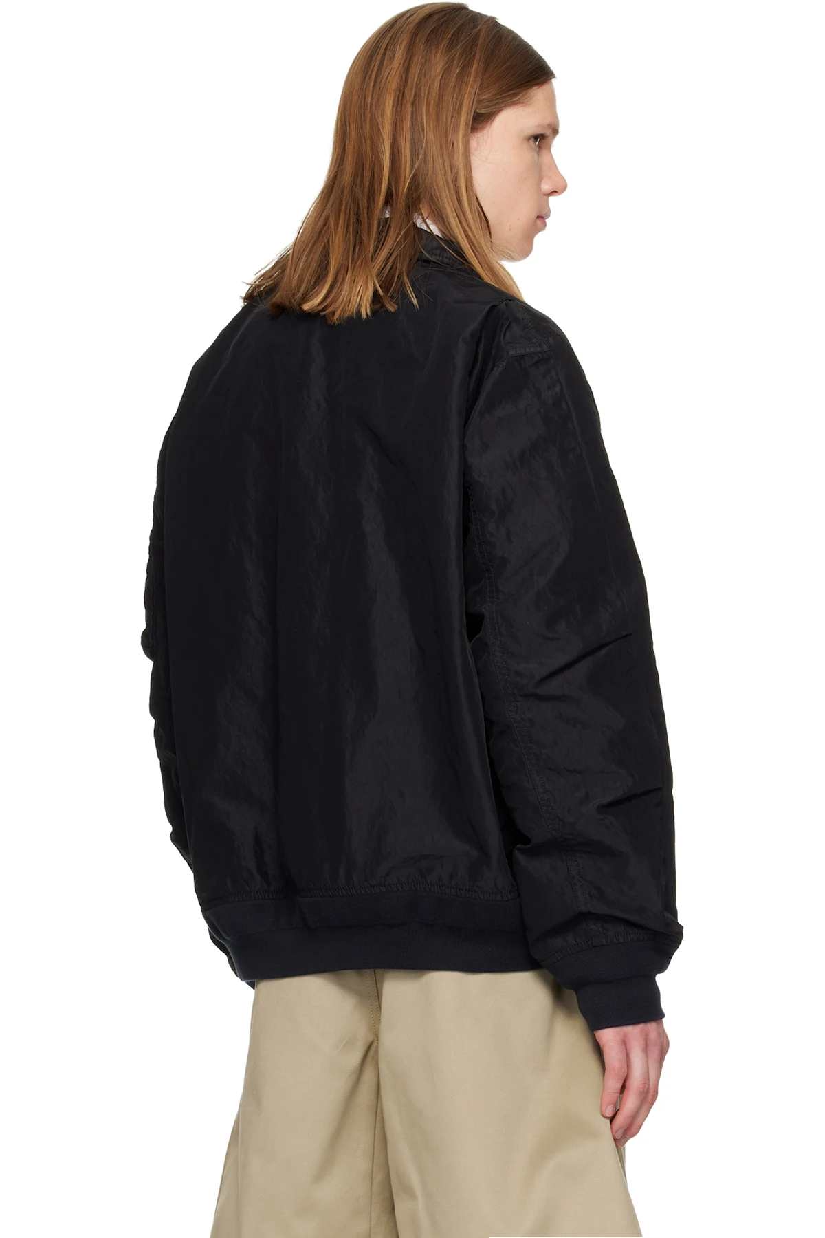 Crinkled nylon twill bomber jacket.