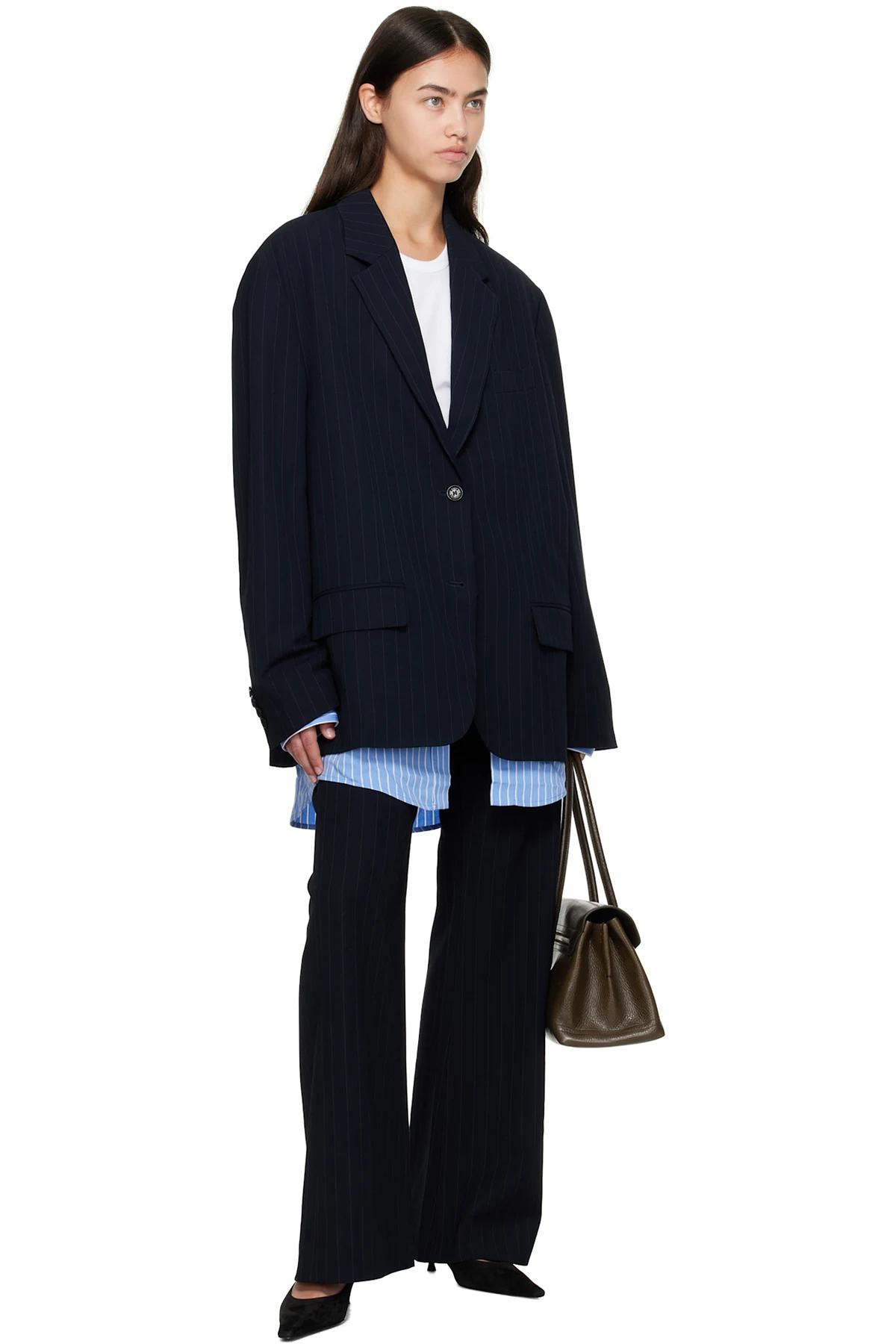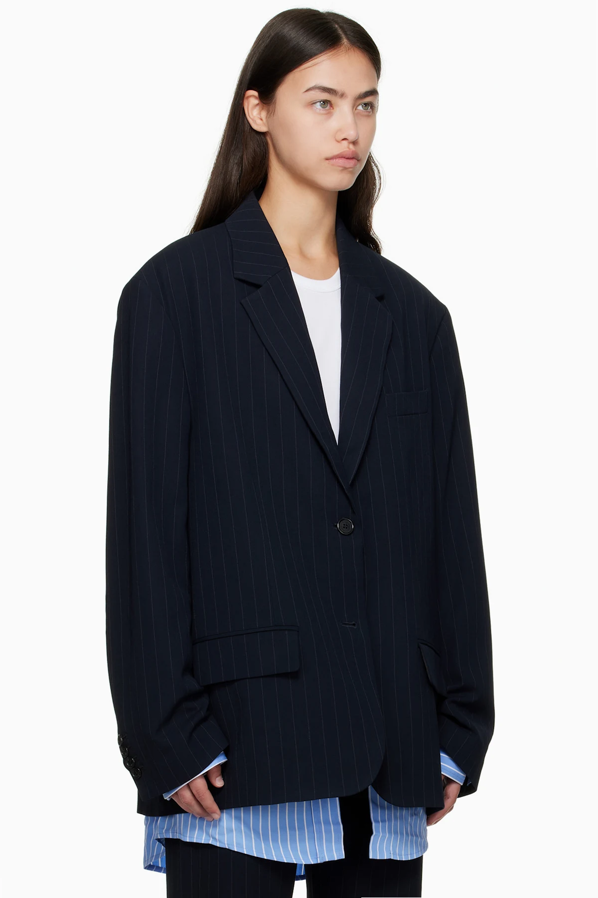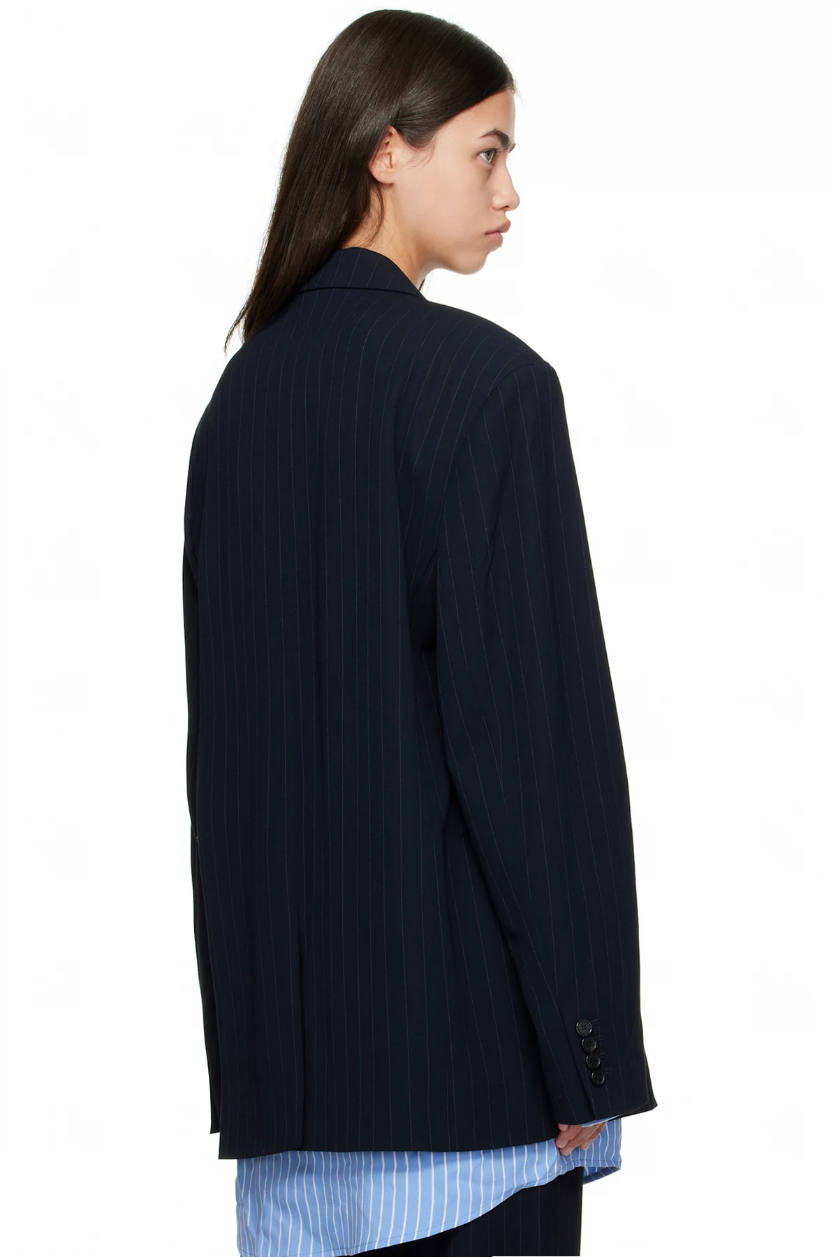 Stretch viscose twill blazer. Integrated striped twill shirt-style underlay.