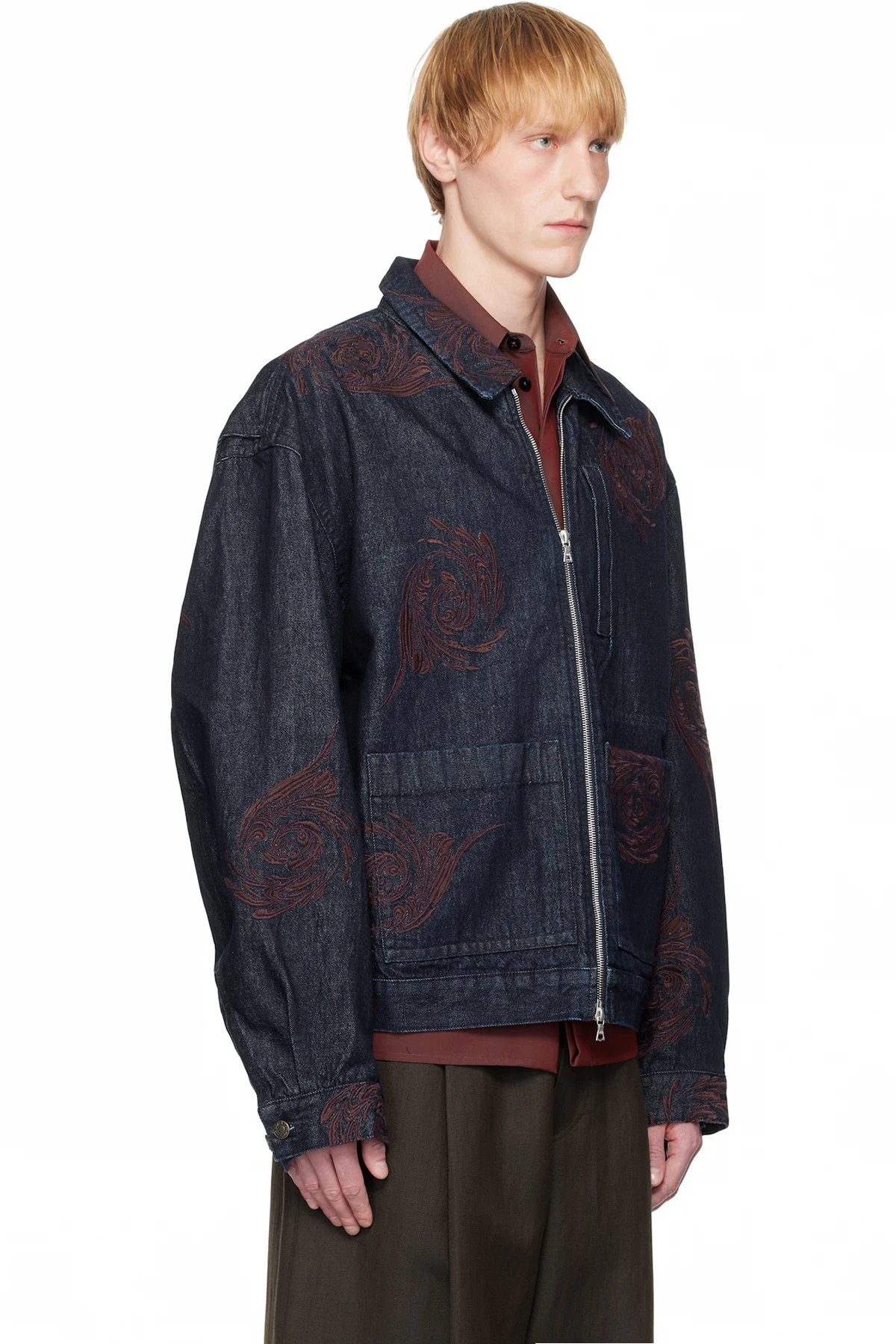 Non-stretch denim jacket. Embroidered graphic pattern throughout.