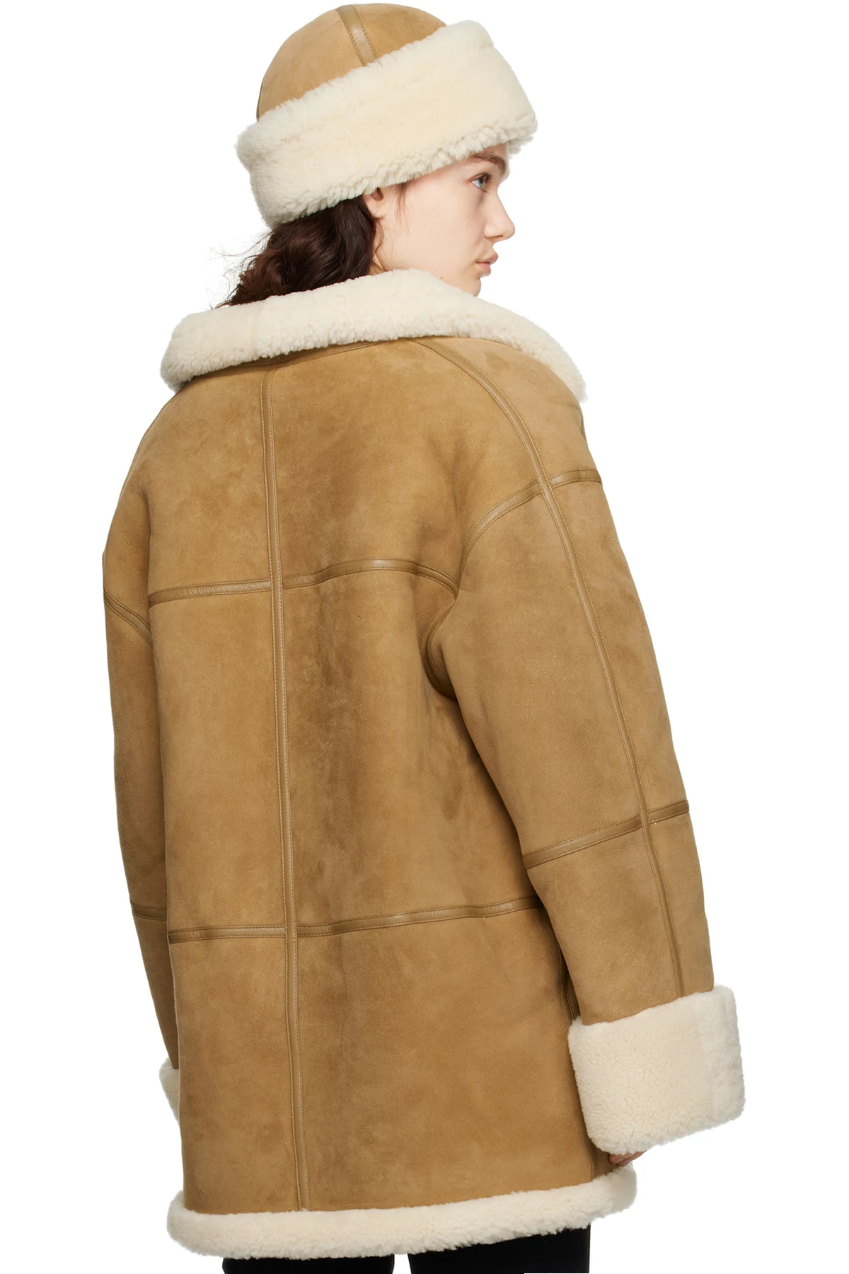 · Shearling trim at collar, hem, and cuffs