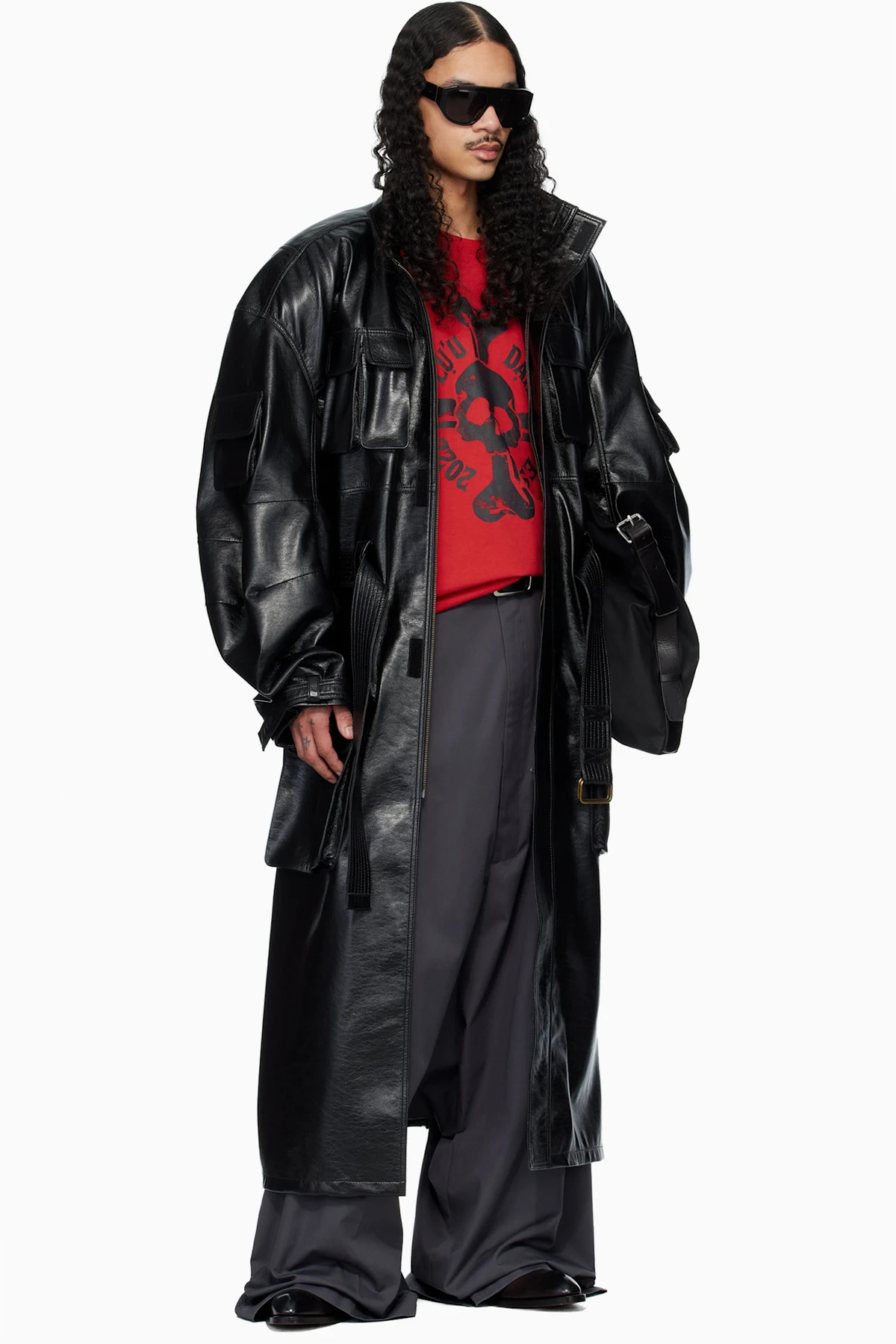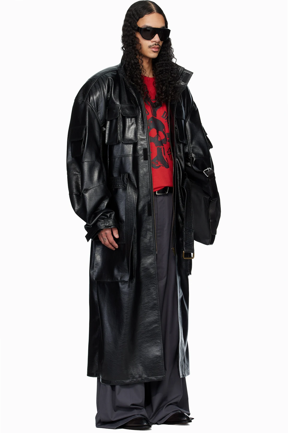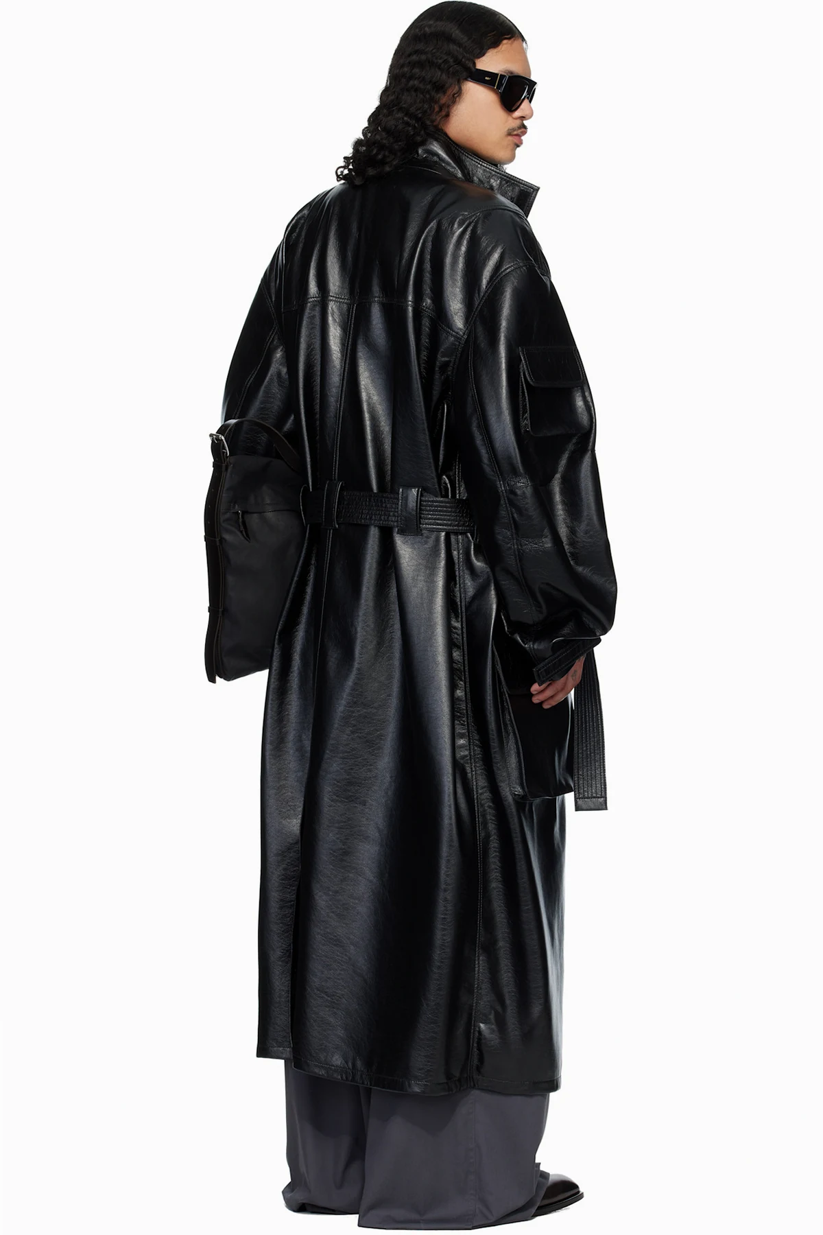 Grained faux-leather trench coat.
