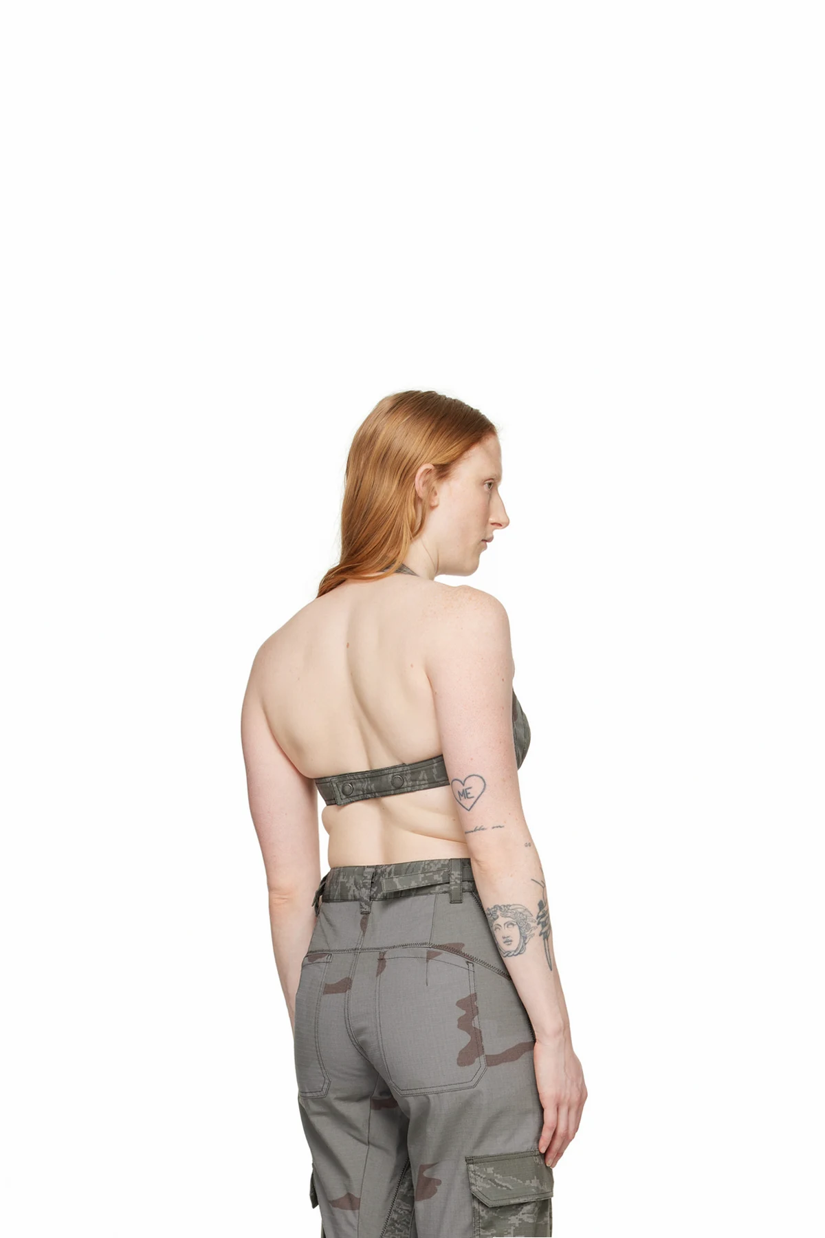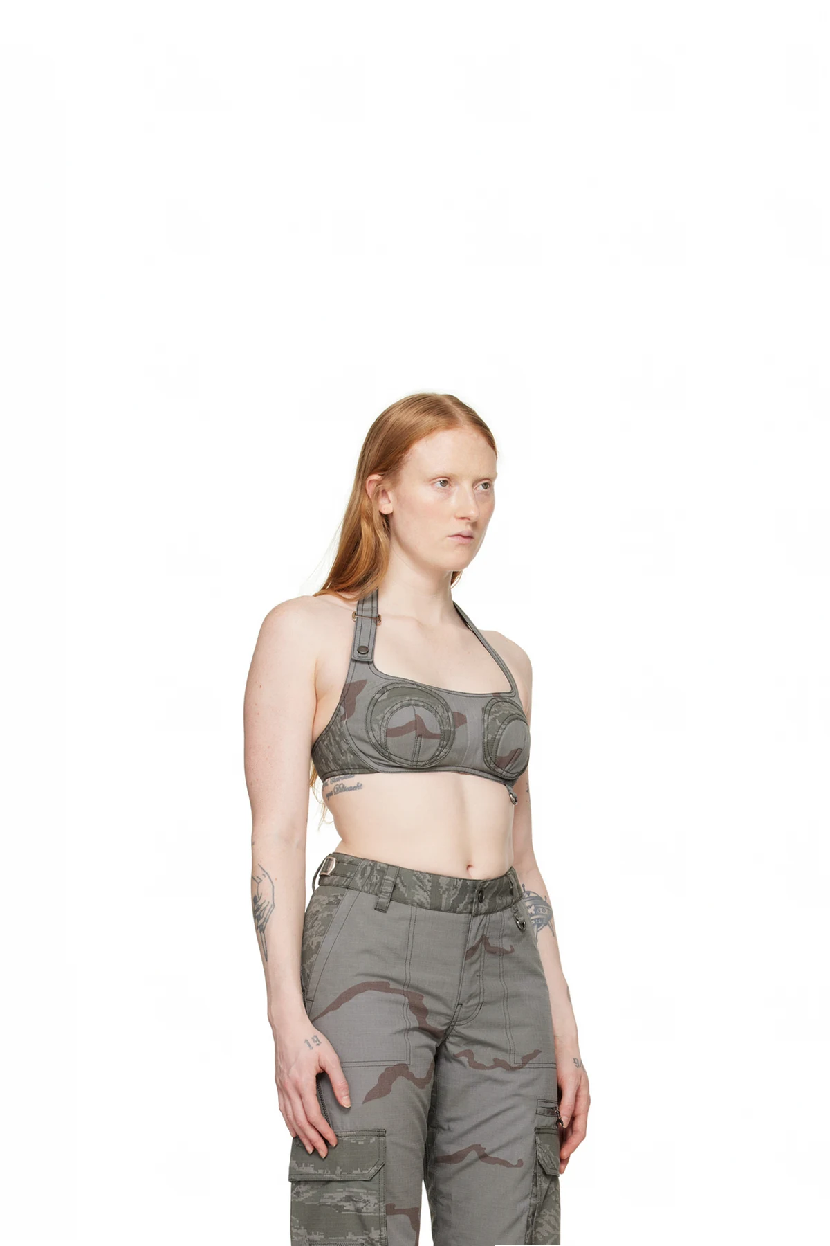 Upcycled polyester- and cotton-blend ripstop bra. Camouflage pattern printed throughout.