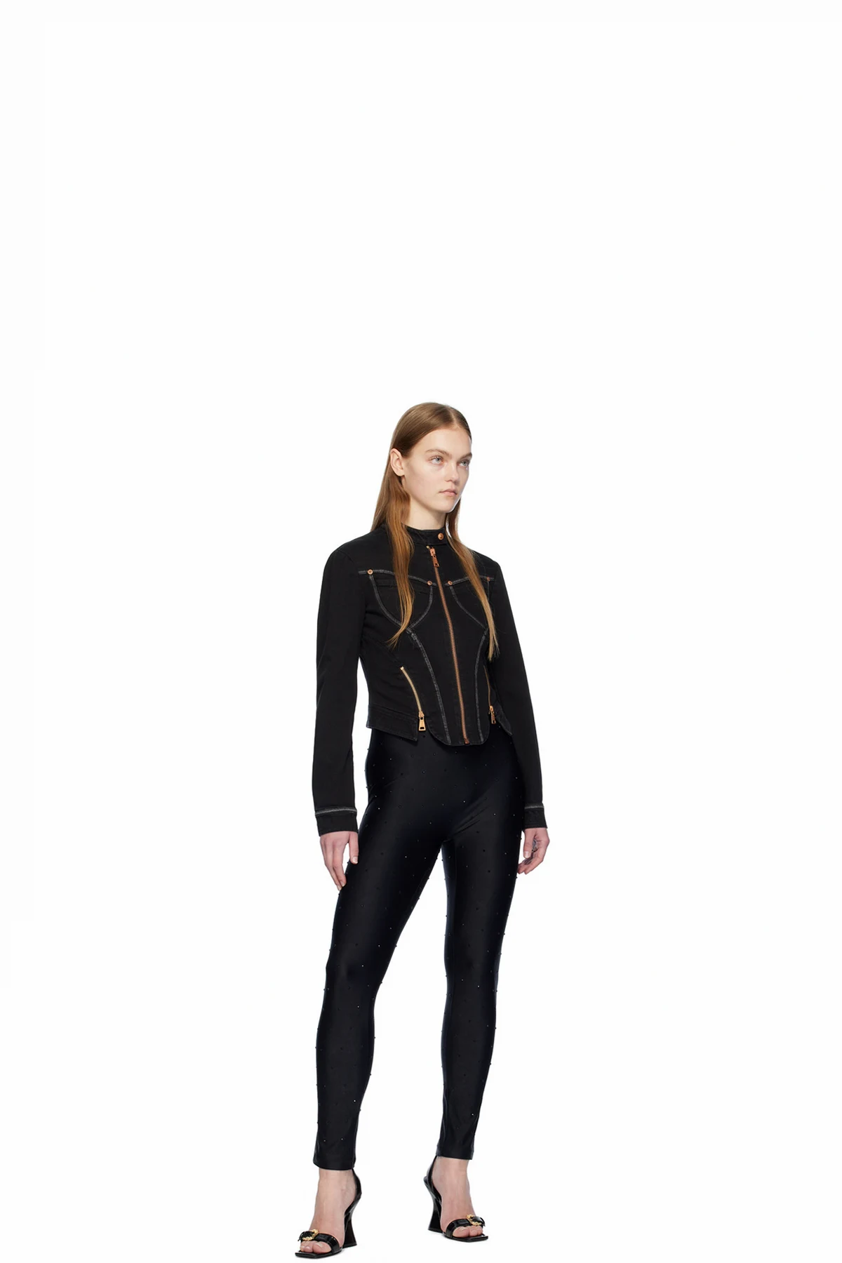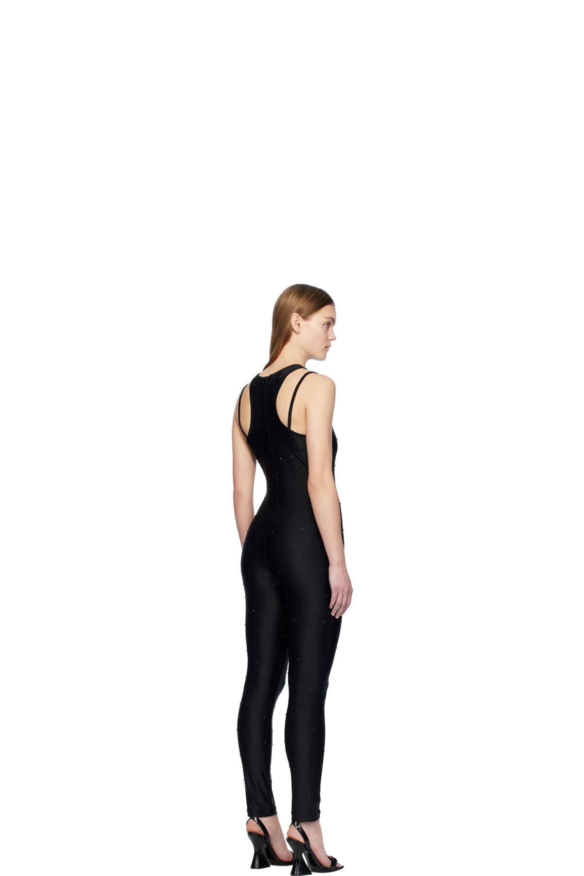 Stretch polyester jersey jumpsuit. Crystal-cut detailing throughout.
