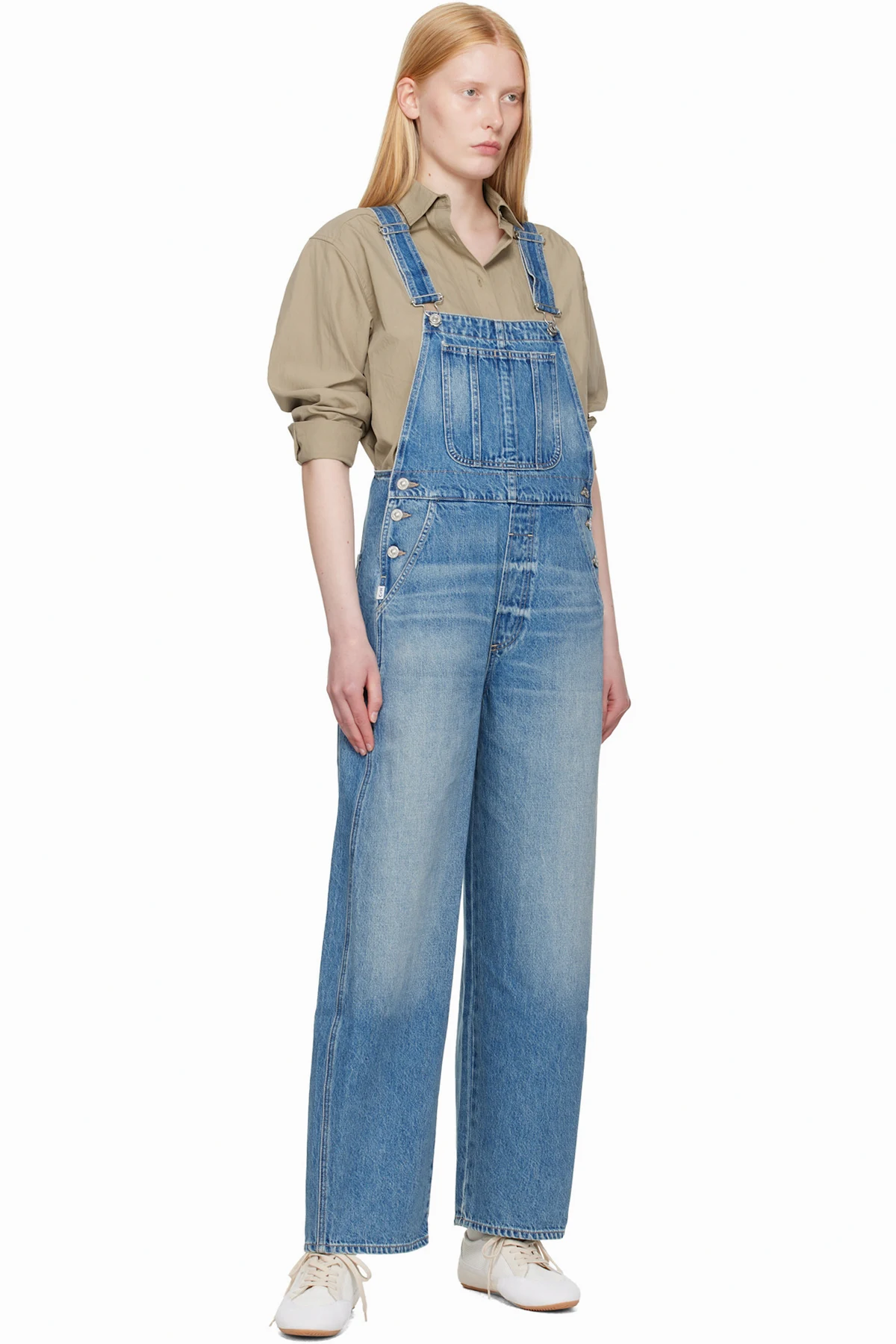 Non-stretch regenerative cotton denim overalls. Fading and whiskering throughout.