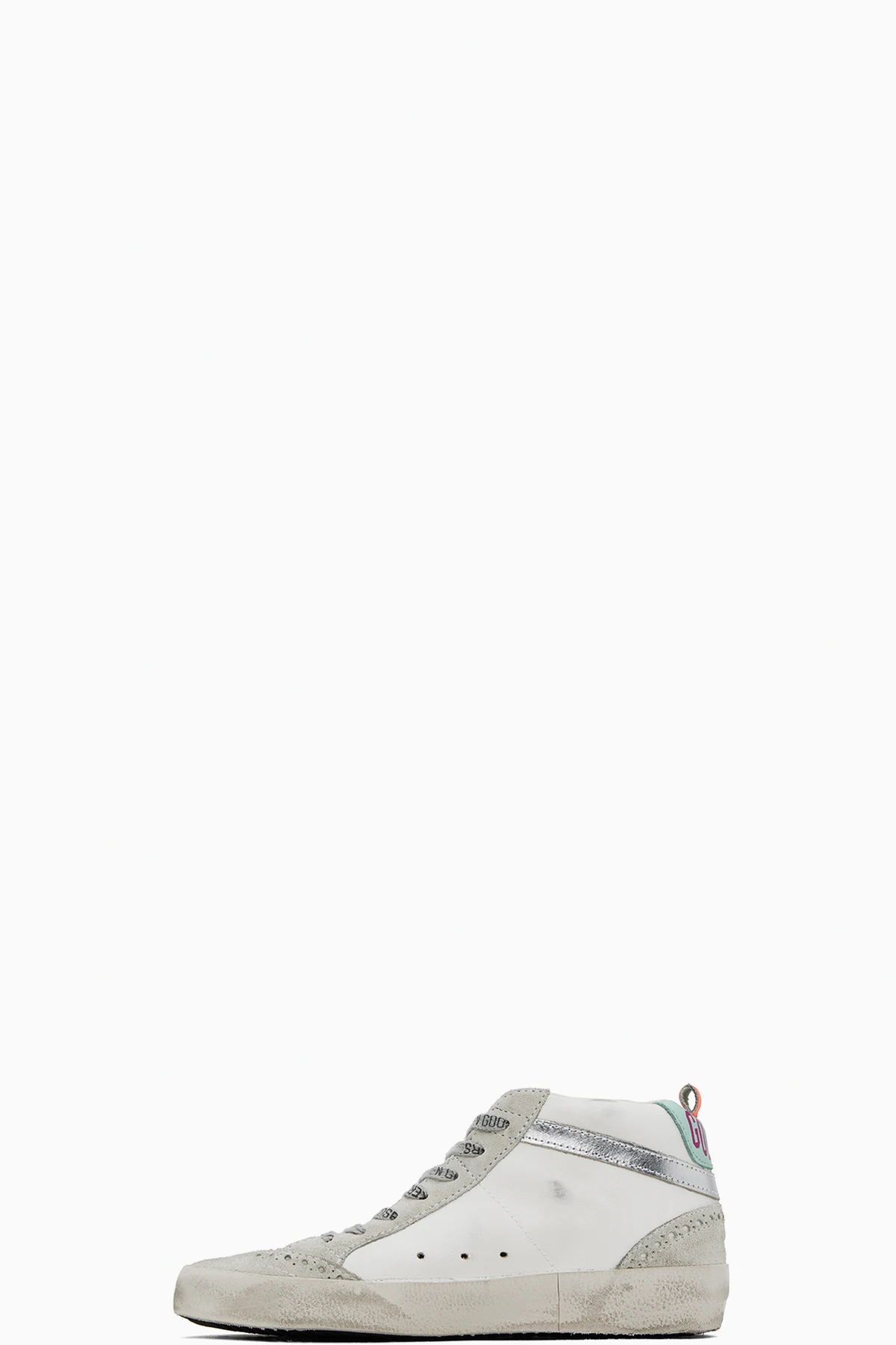 Handcrafted mid-top buffed leather and suede sneakers in white and gray.