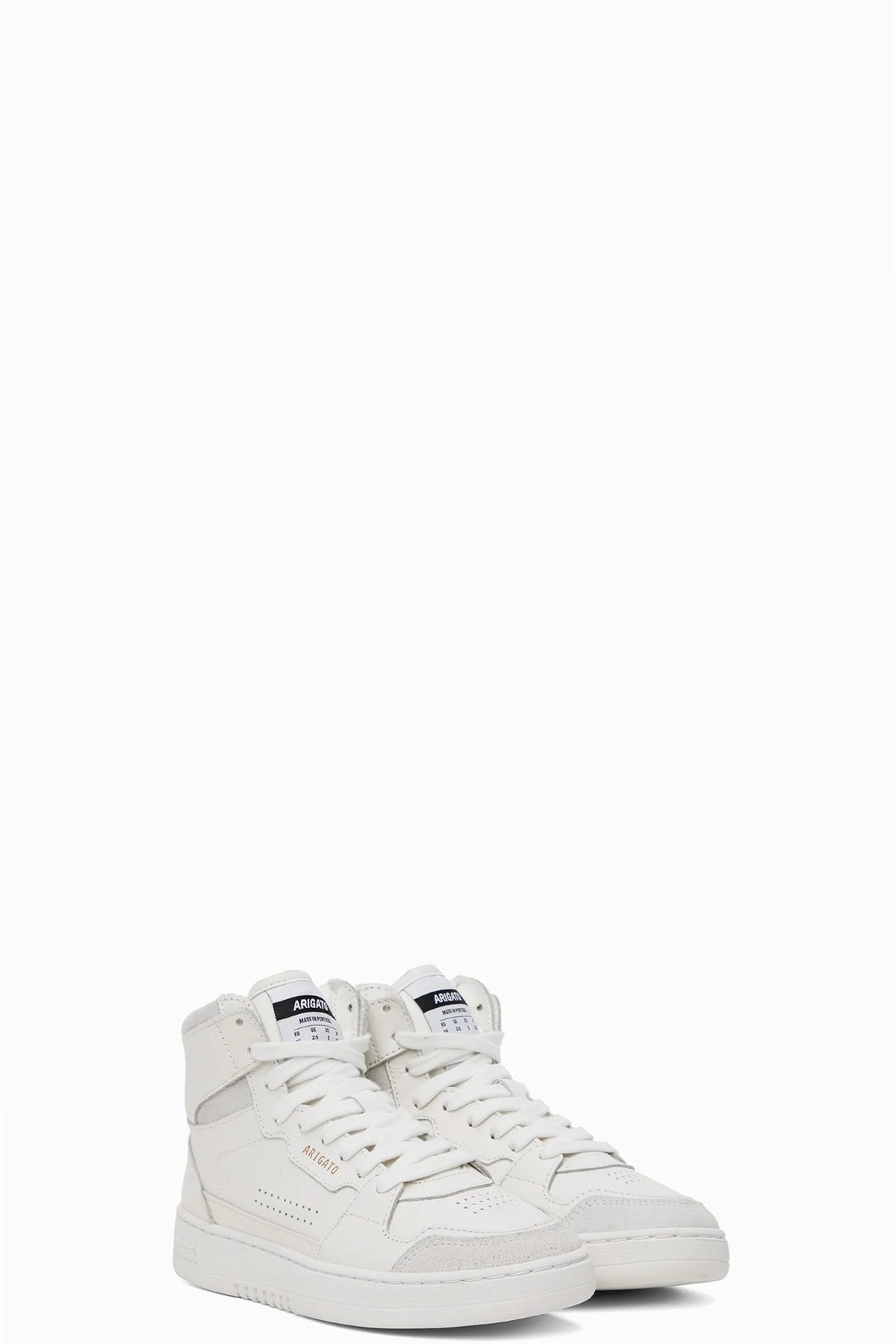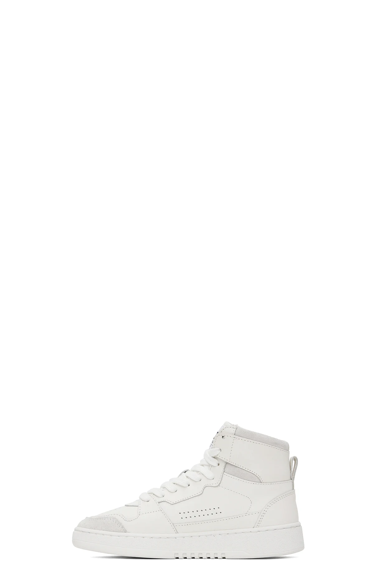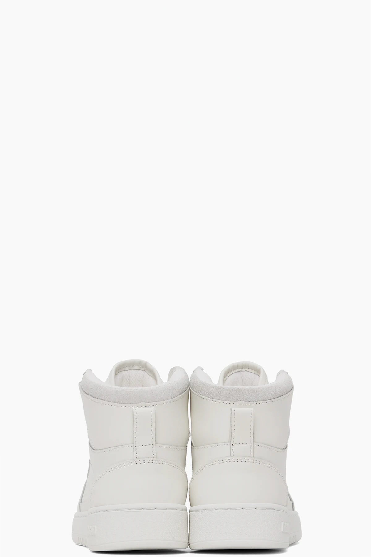 Handcrafted high-top paneled buffed calfskin and calfskin suede sneakers in white. Perforated detailing throughout.