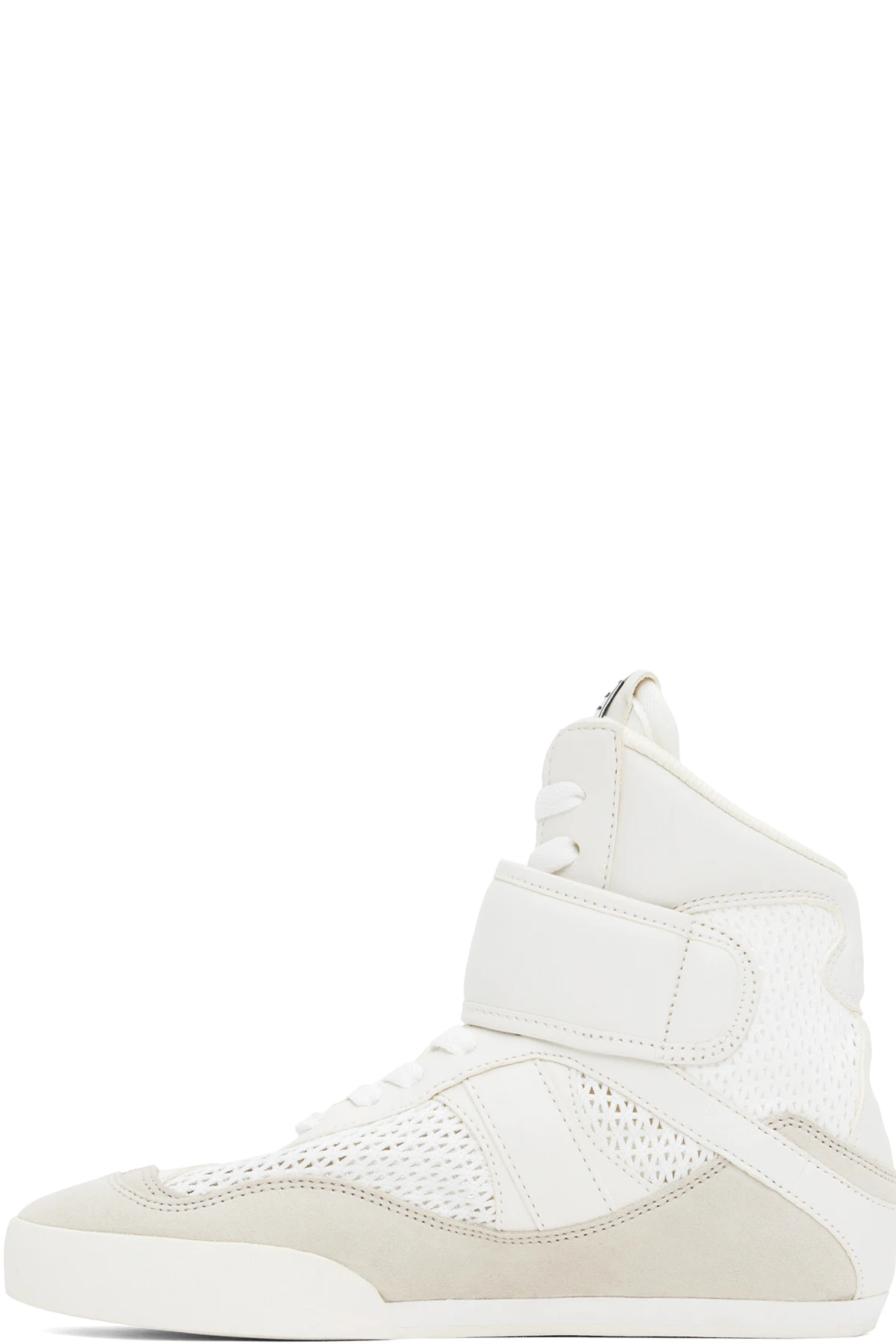 High-top LWG-certified calfskin suede, buffed calfskin, and recycled mesh sneakers in white and beige.
