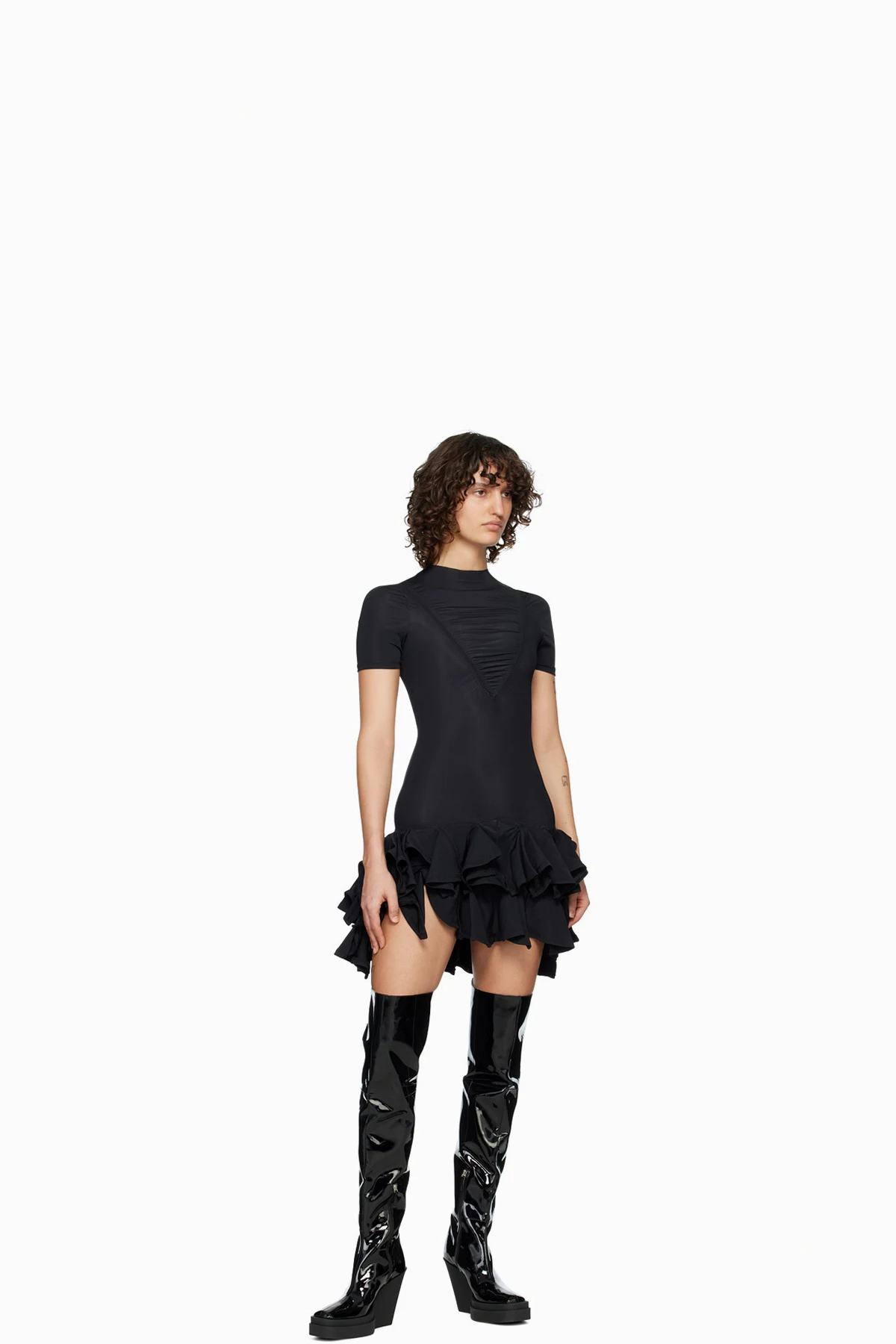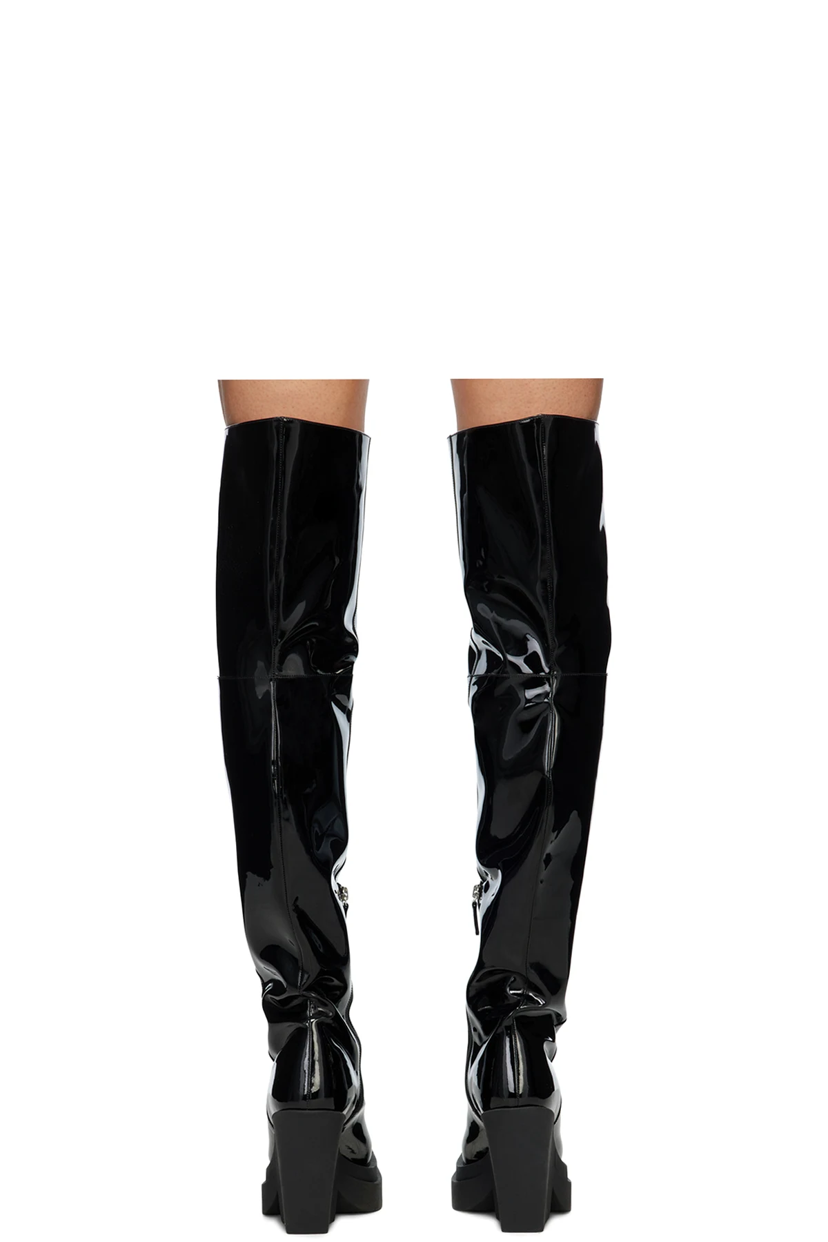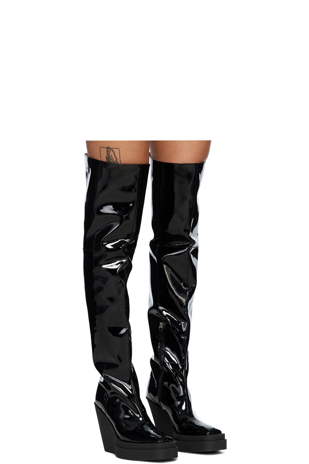 Knee-high patent leather boots in black.