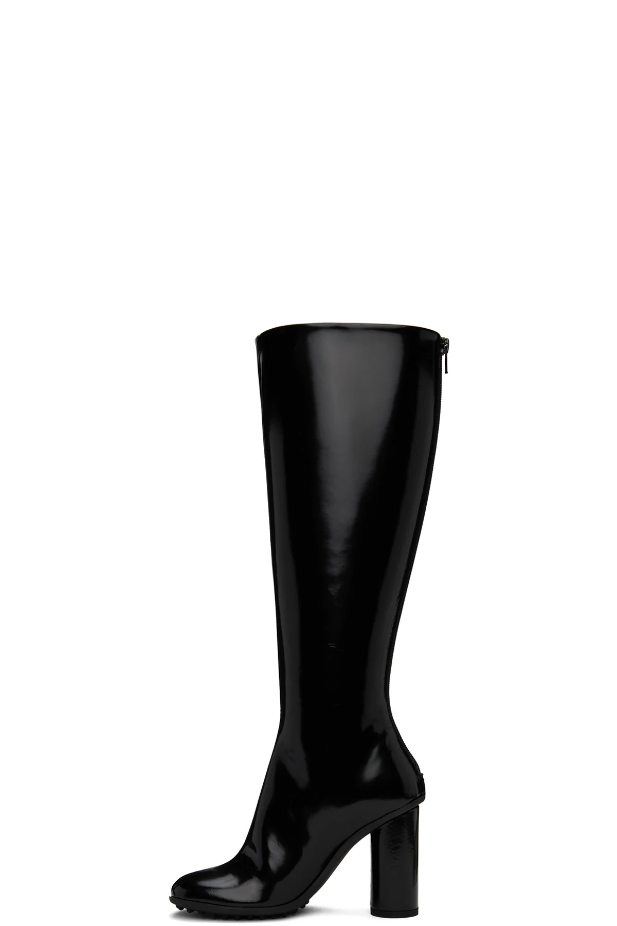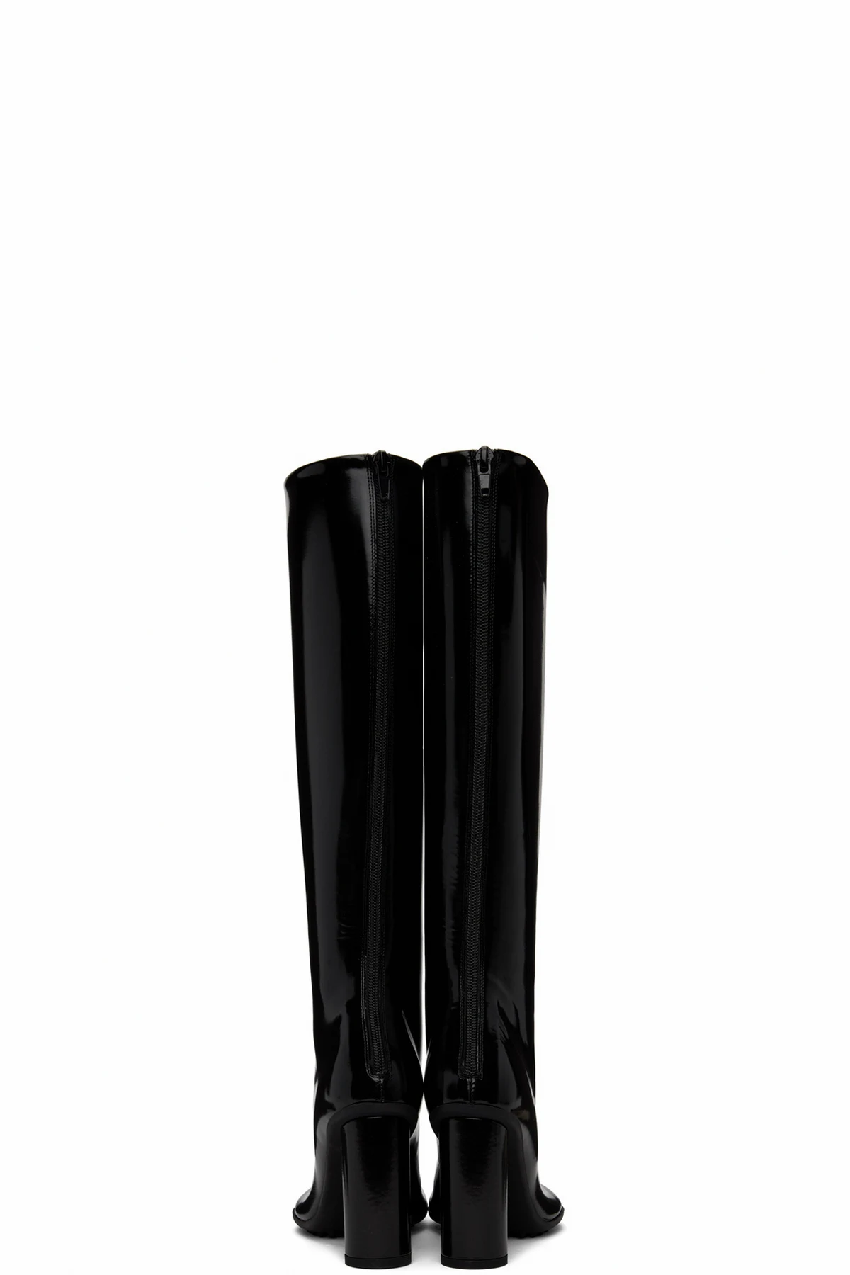 Knee-high patent lambskin boots in black.
