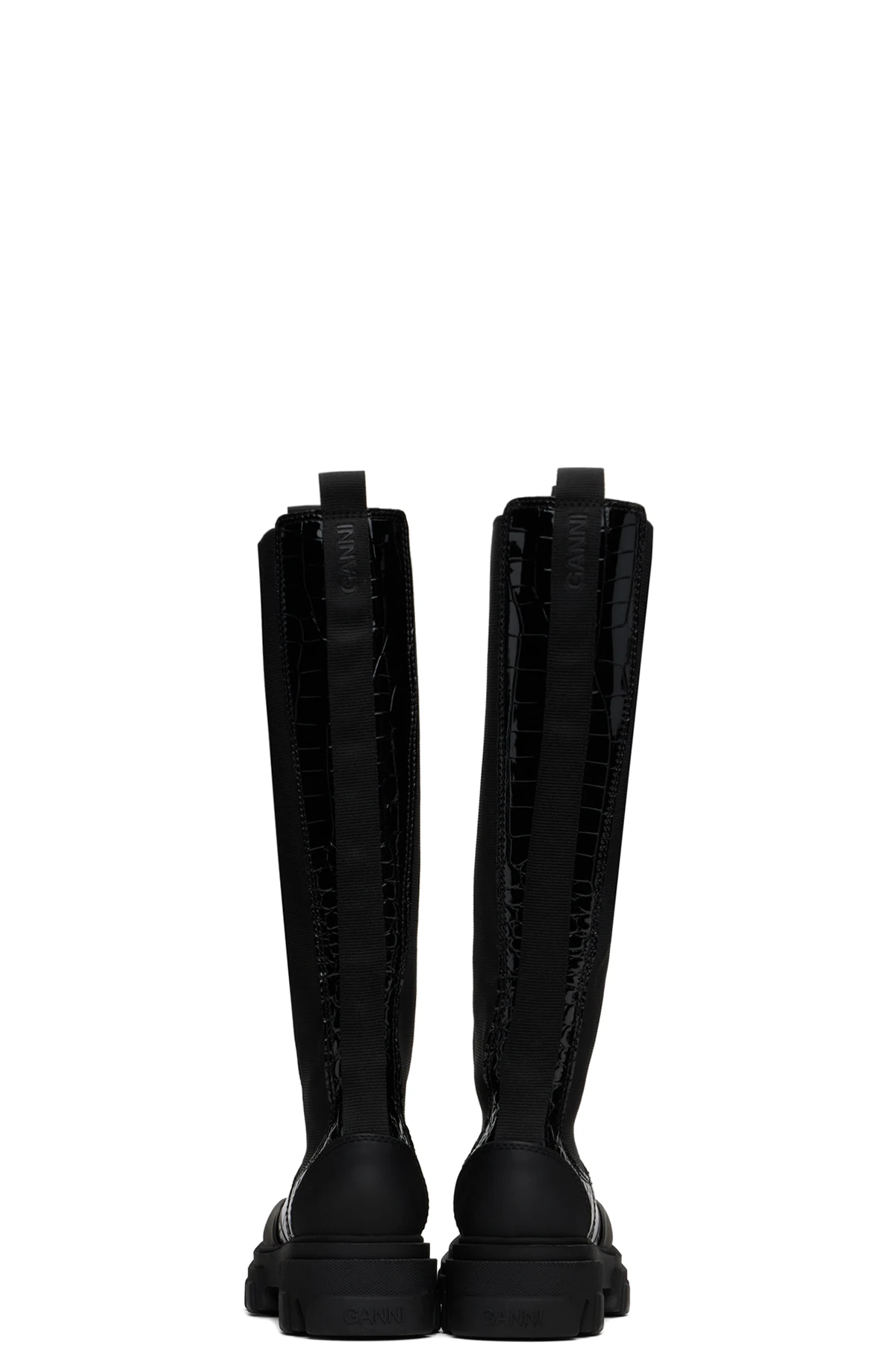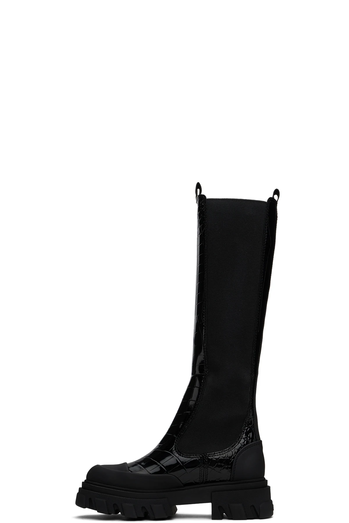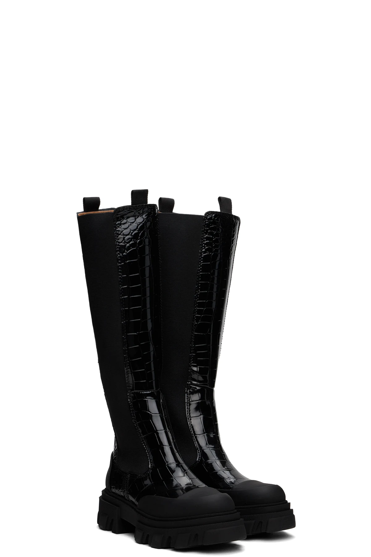 Knee-high croc-embossed faux-leather Chelsea boots in black.