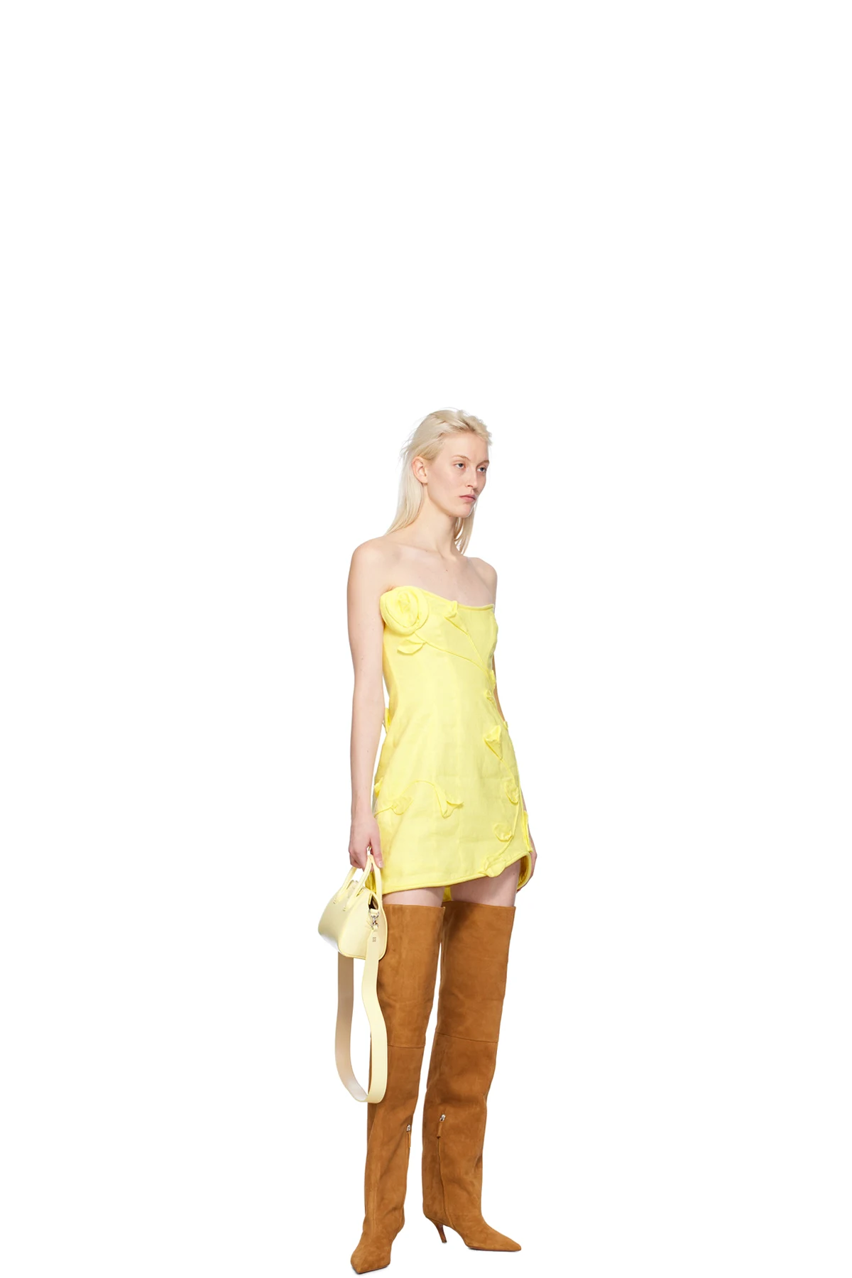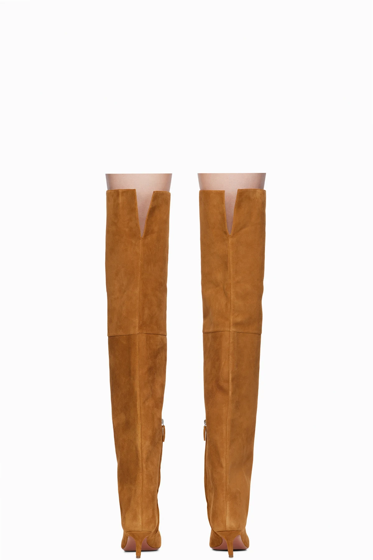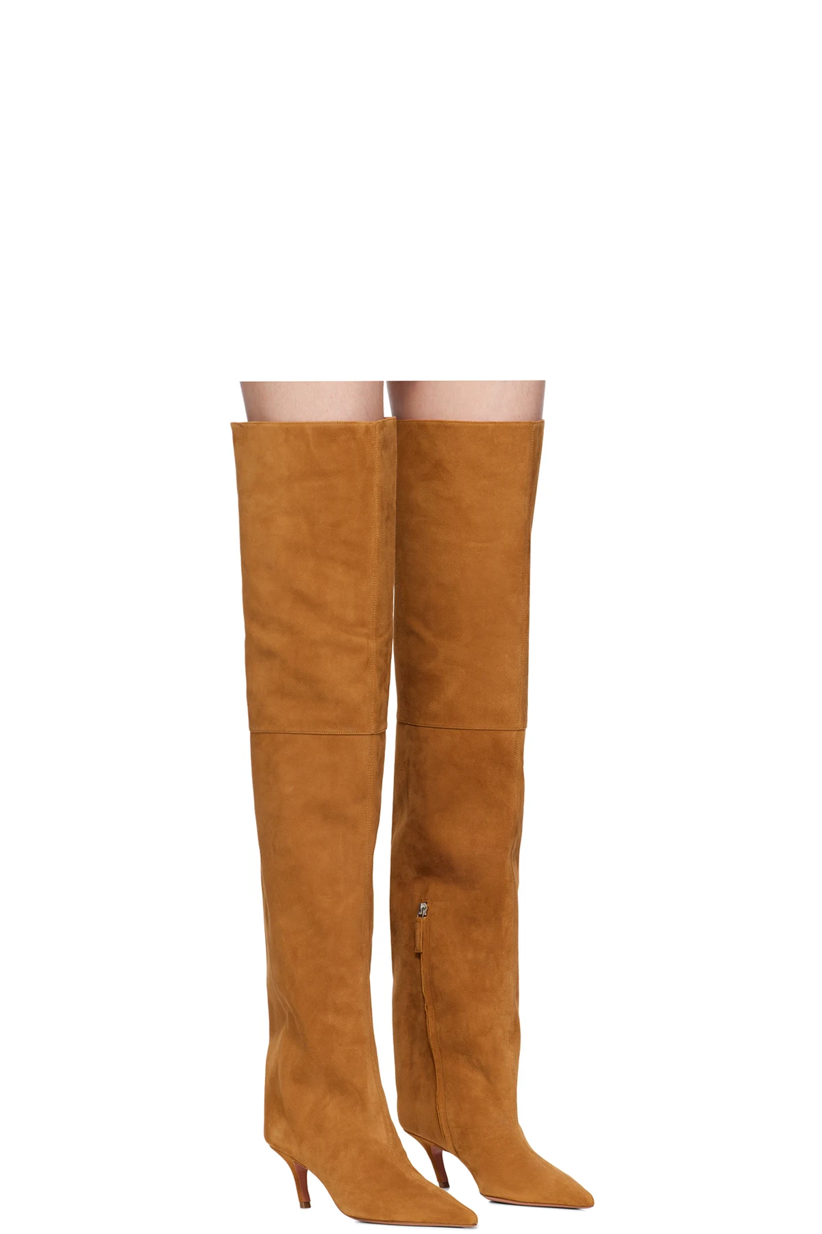 Thigh-high suede boots in tan.