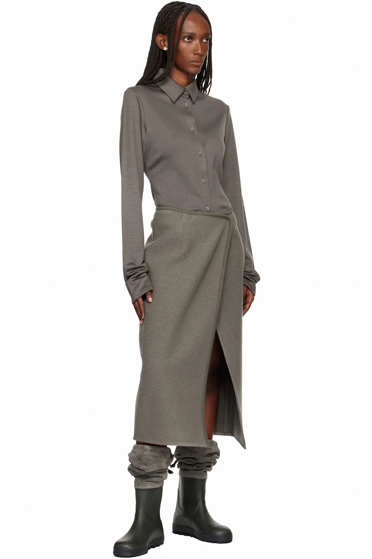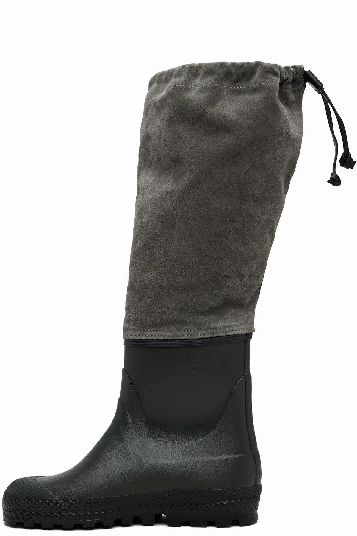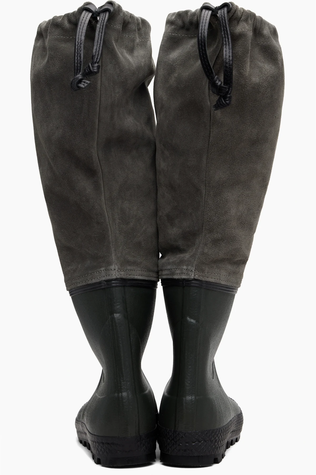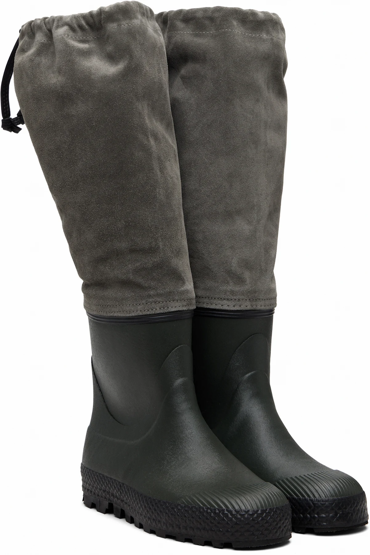 Knee-high paneled rubber and suede boots.