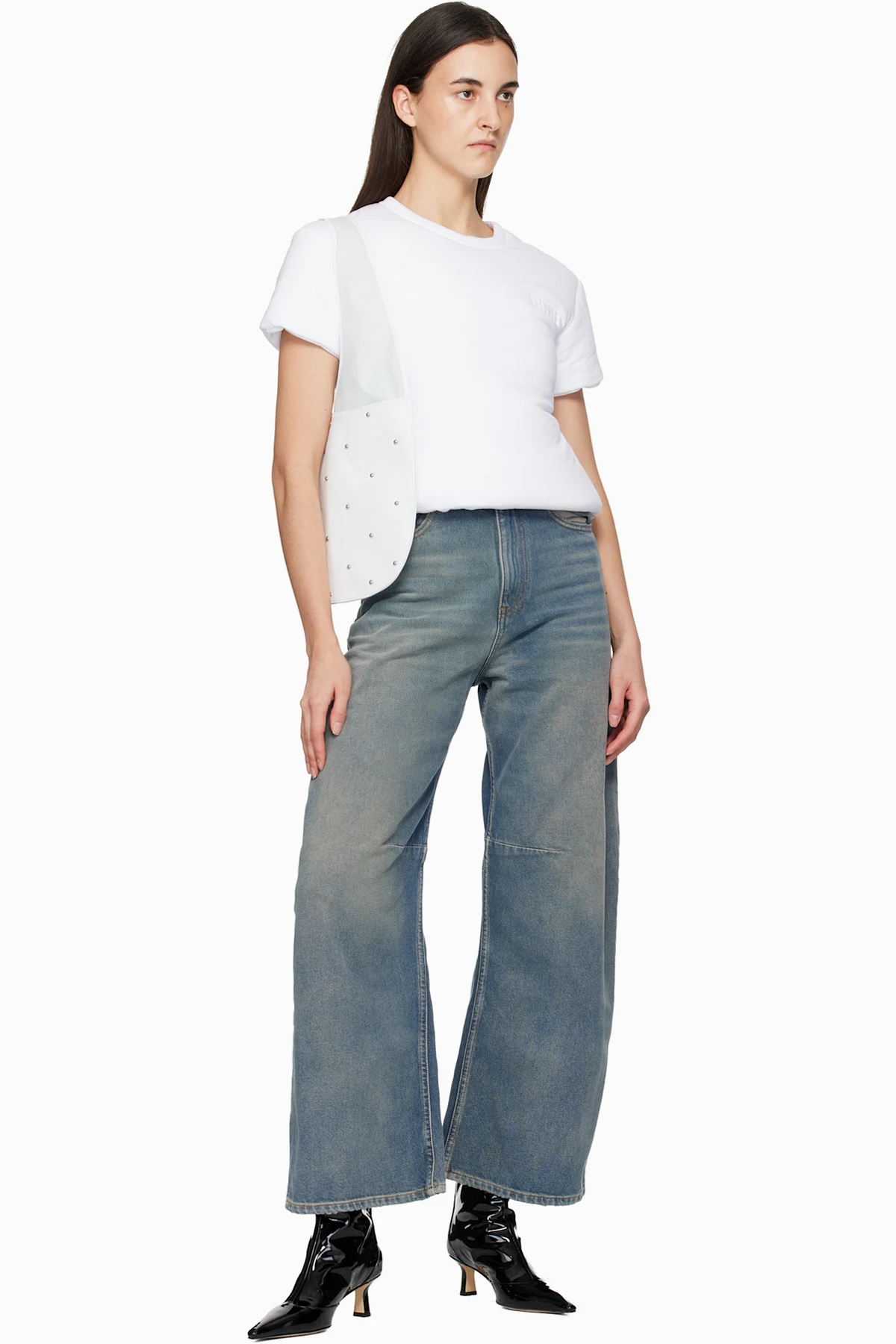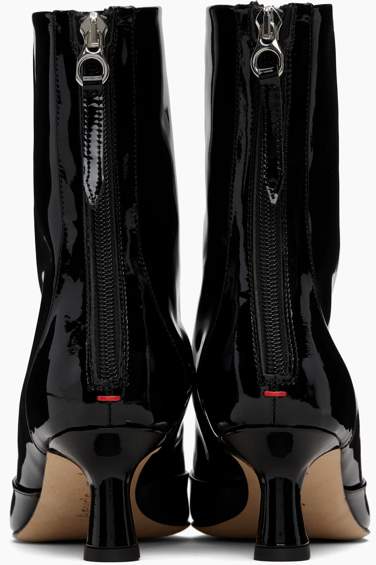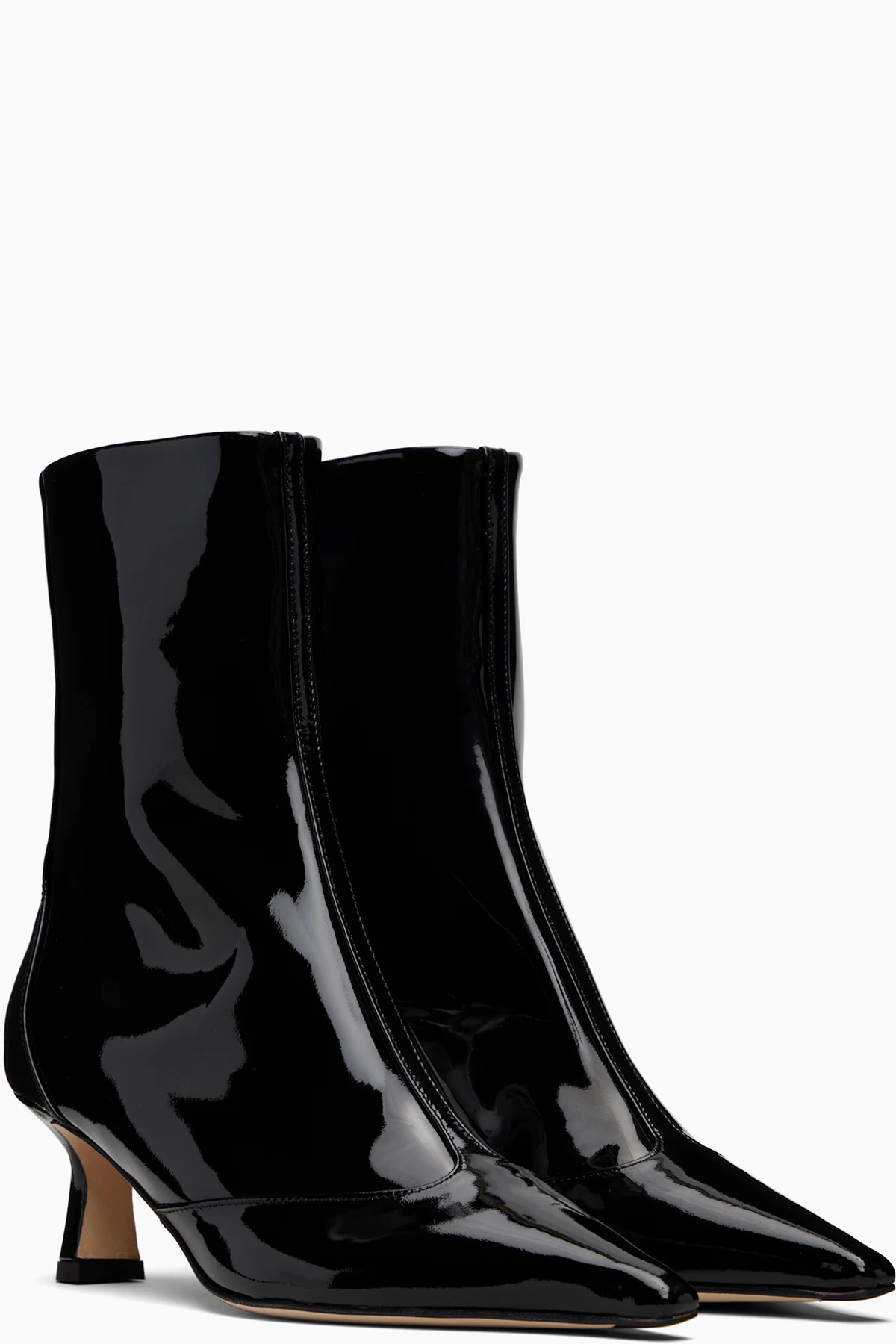 Ankle-high patent calfskin boots.