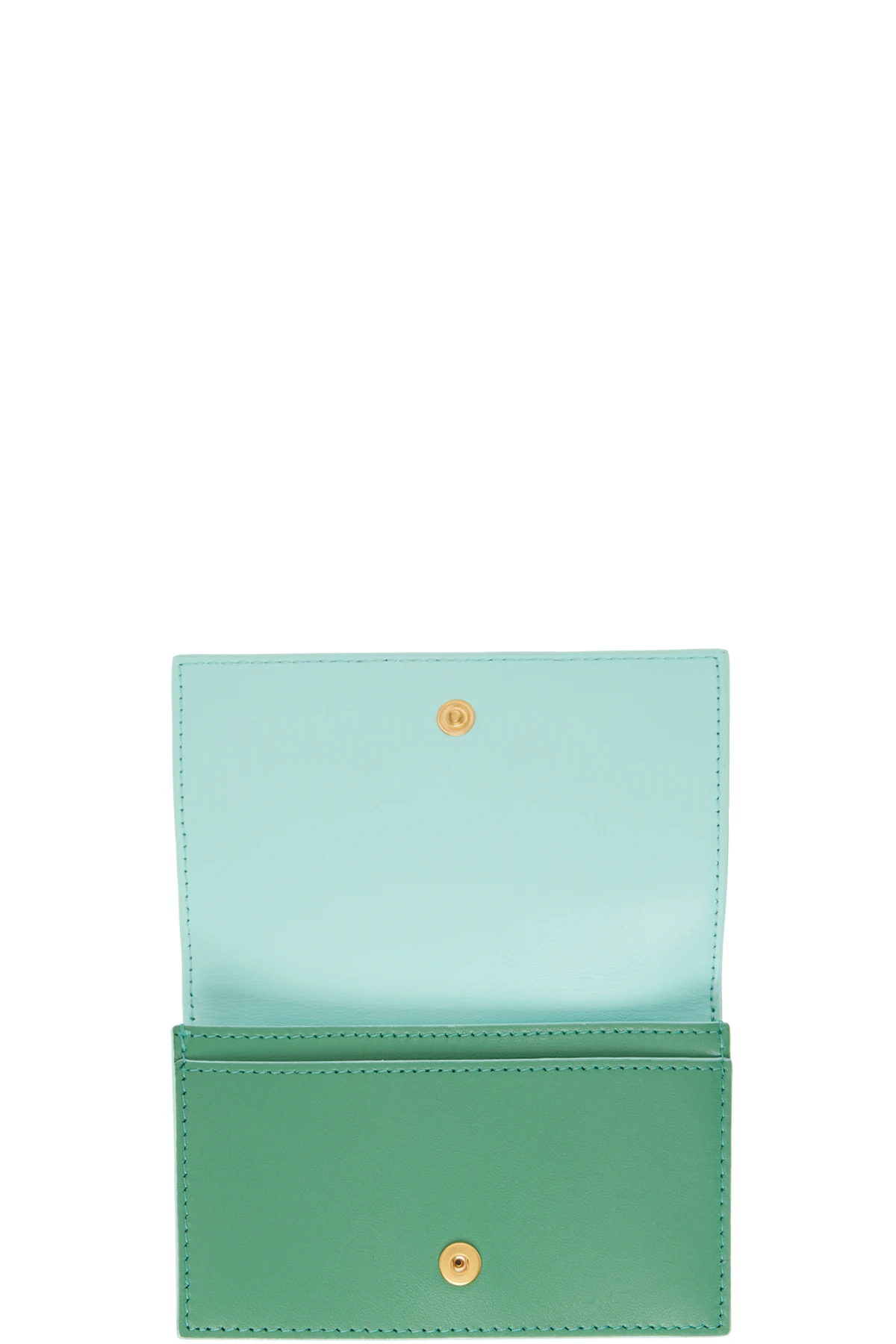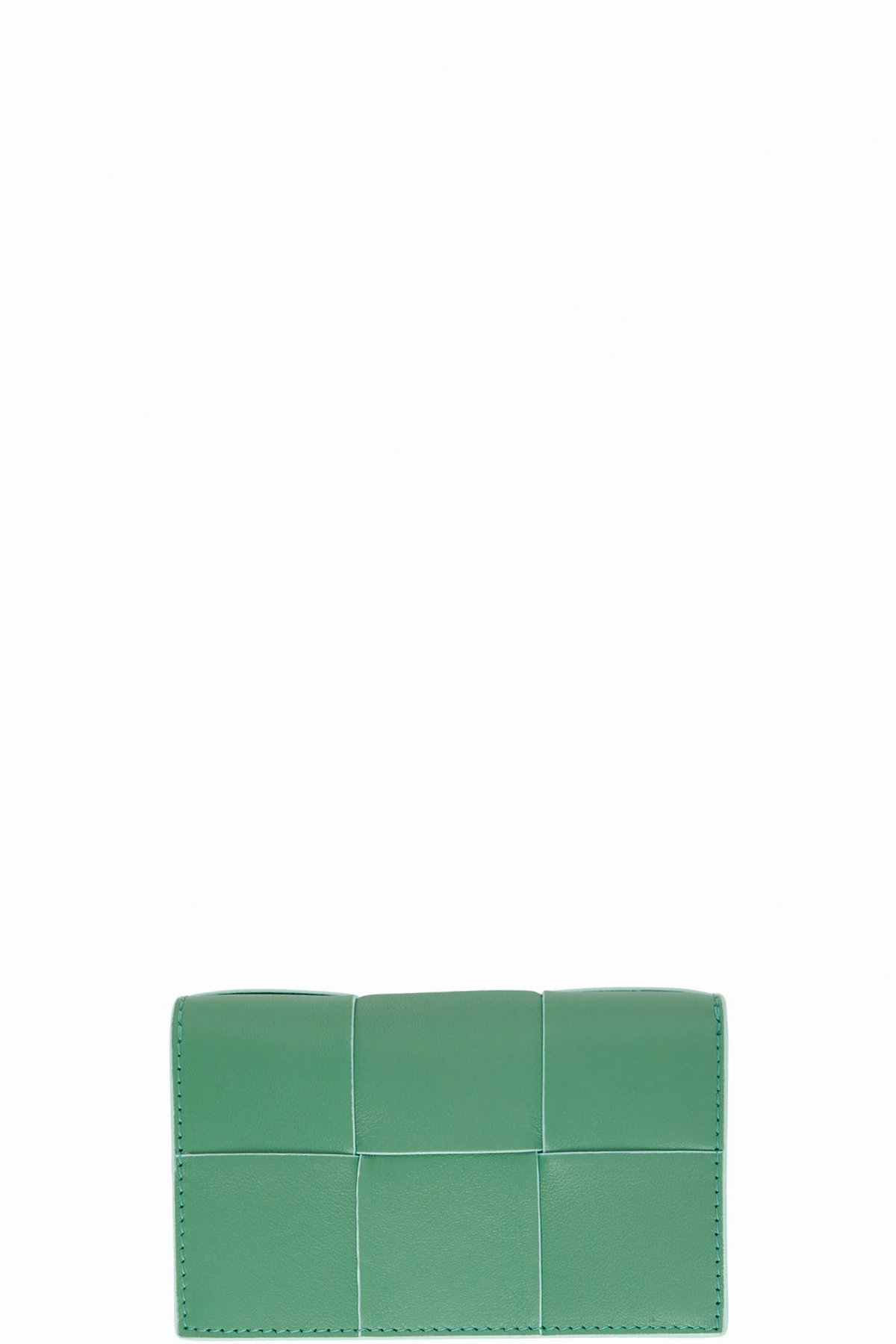 Intreccio-woven buffed lambskin card holder in green. Burnished edges in blue throughout.