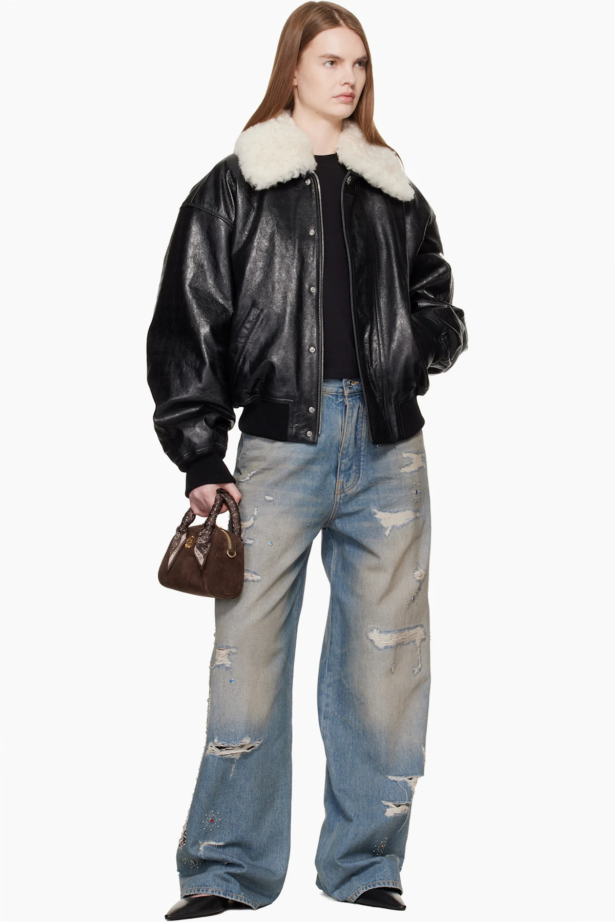 Calfskin suede top handle bag.