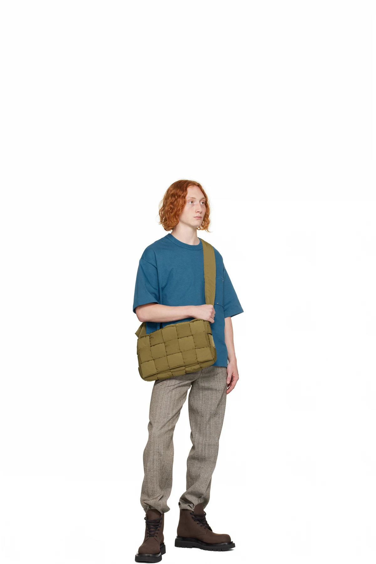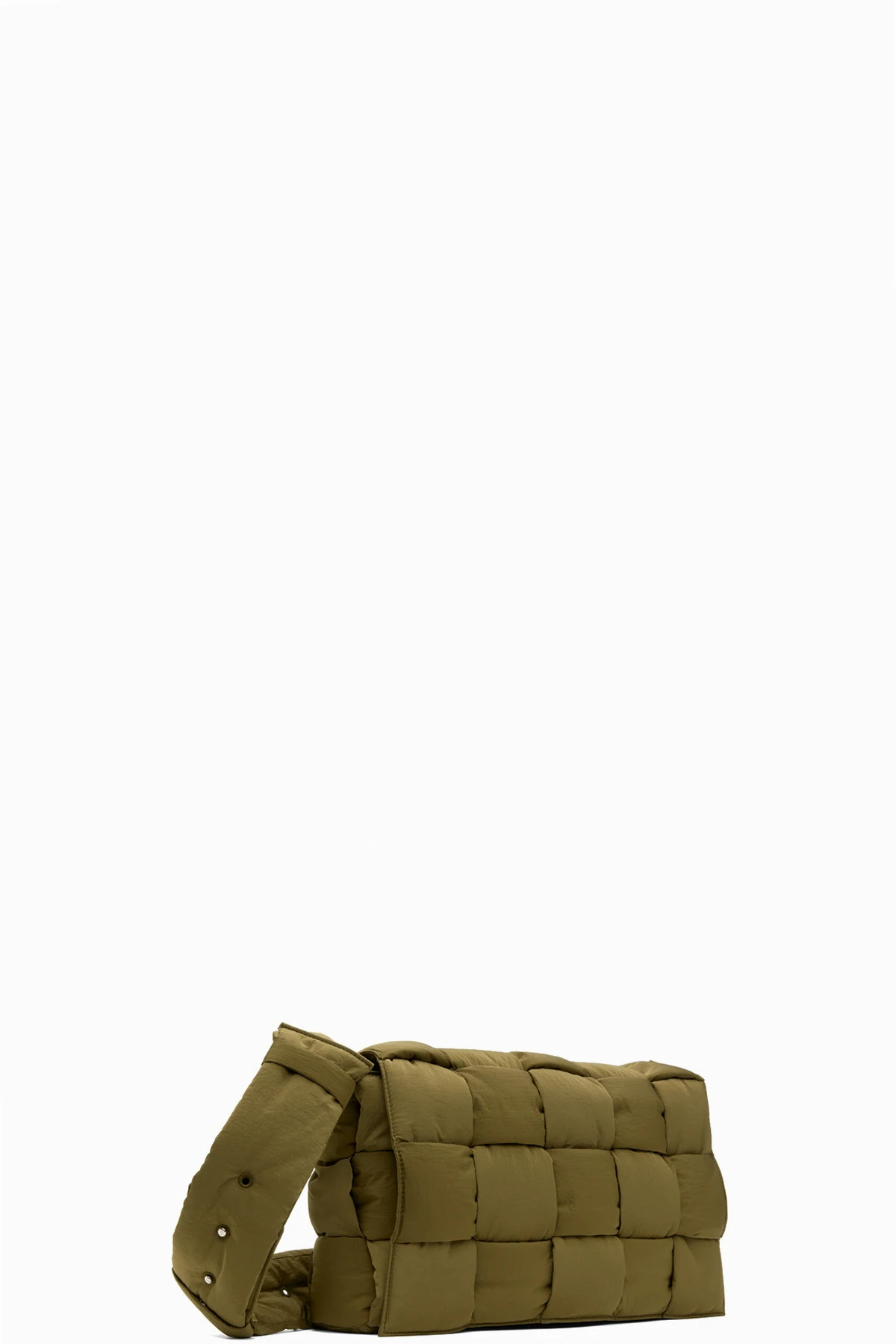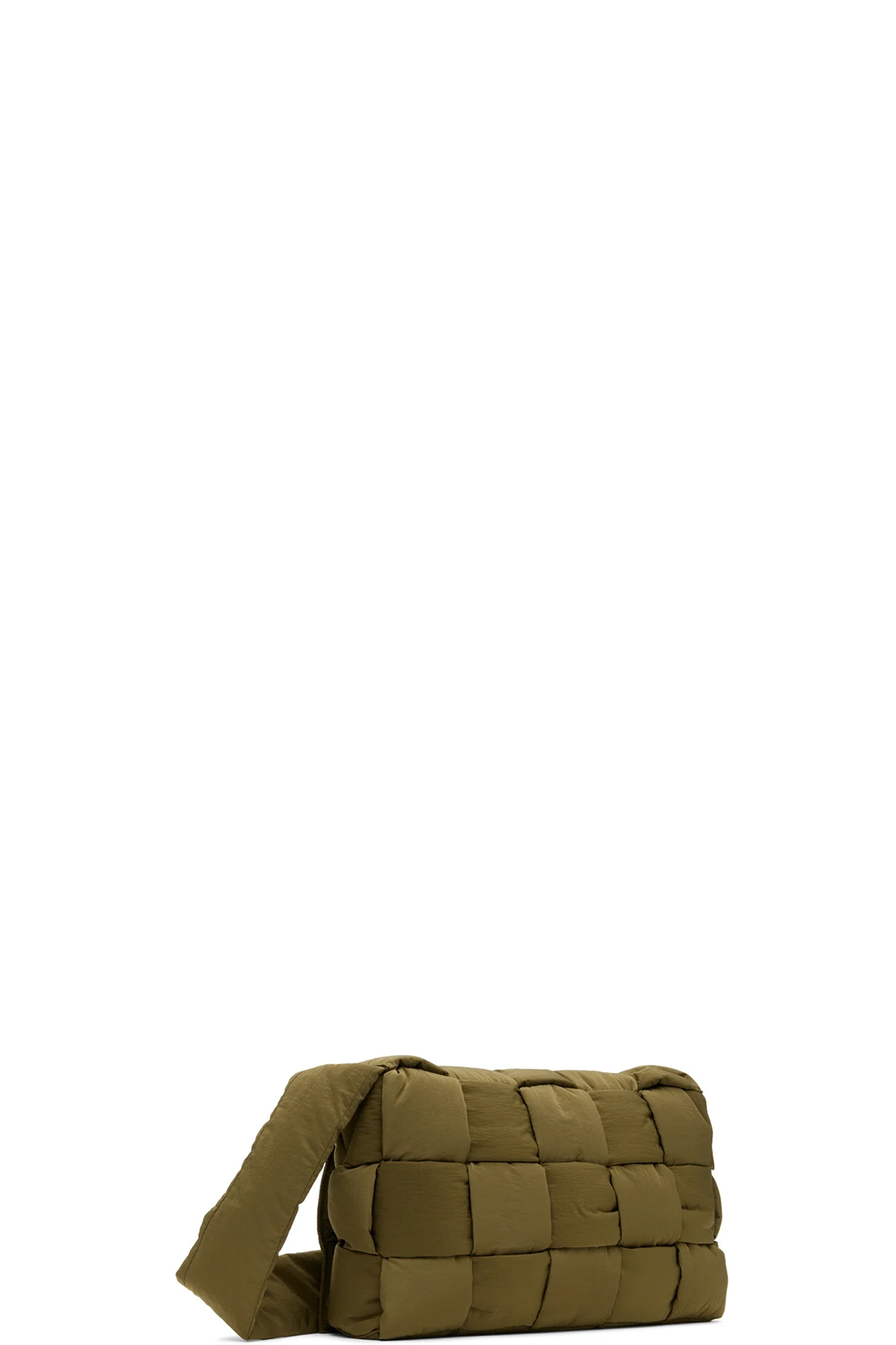 Padded intreccio-woven crinkled nylon satin messenger bag in khaki.
