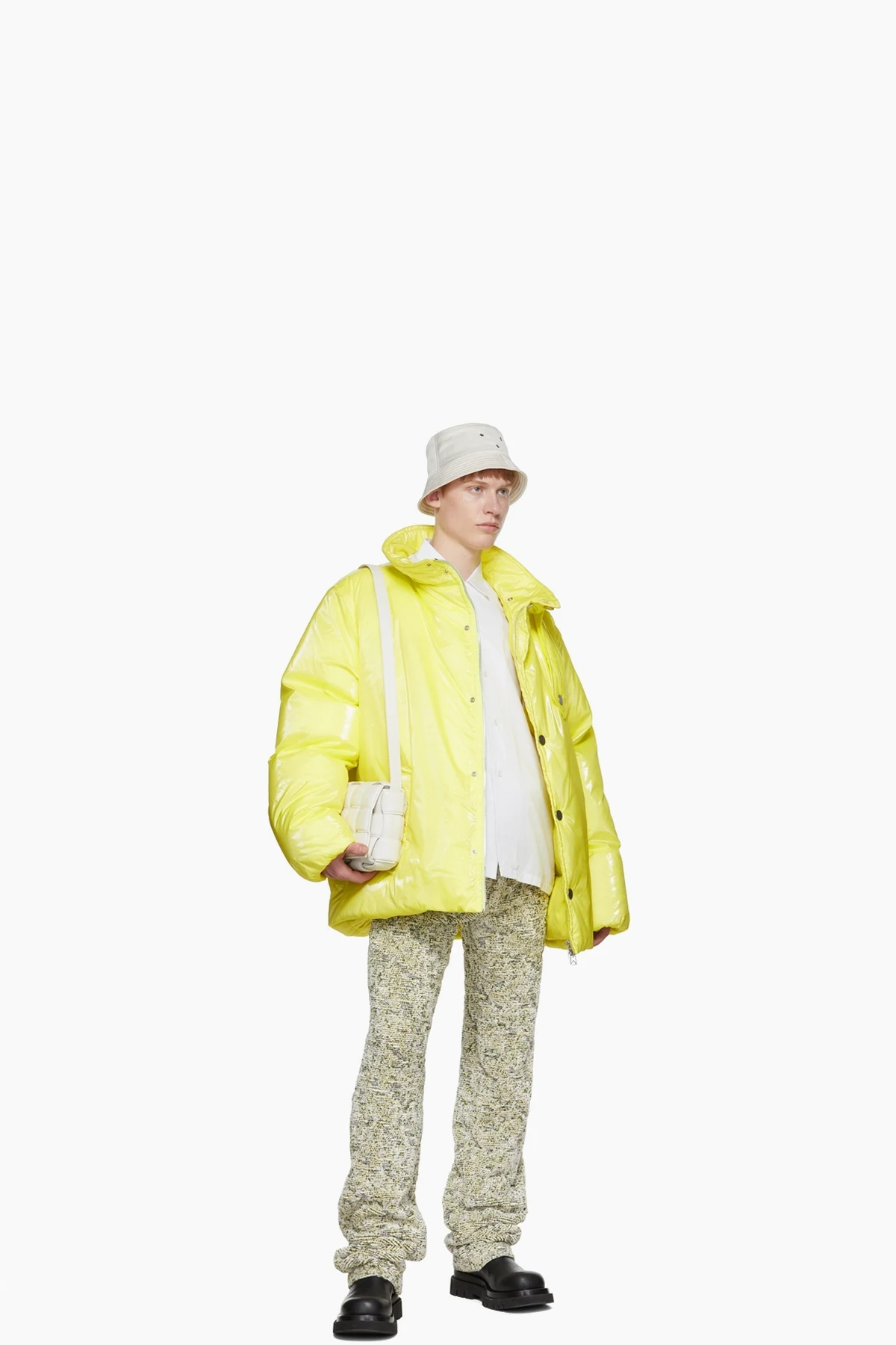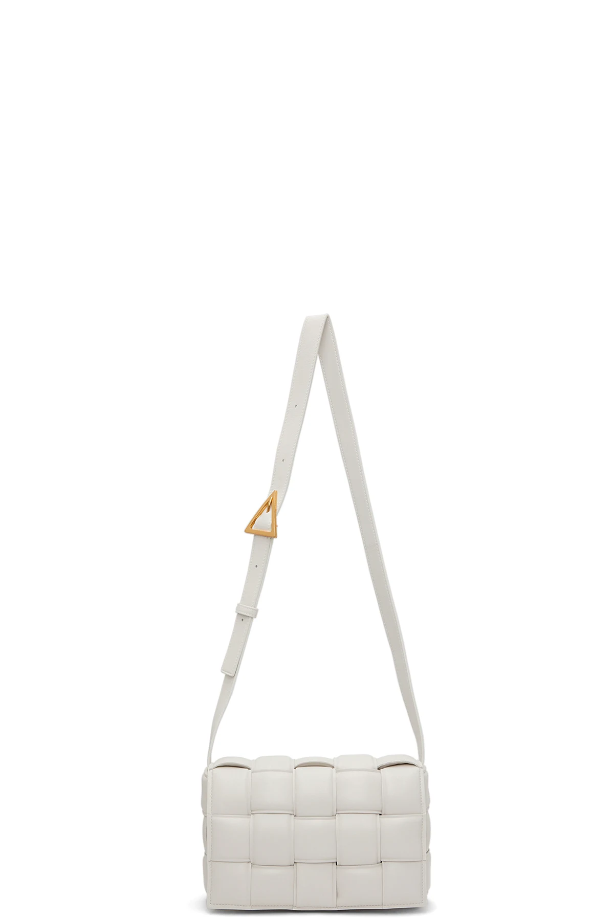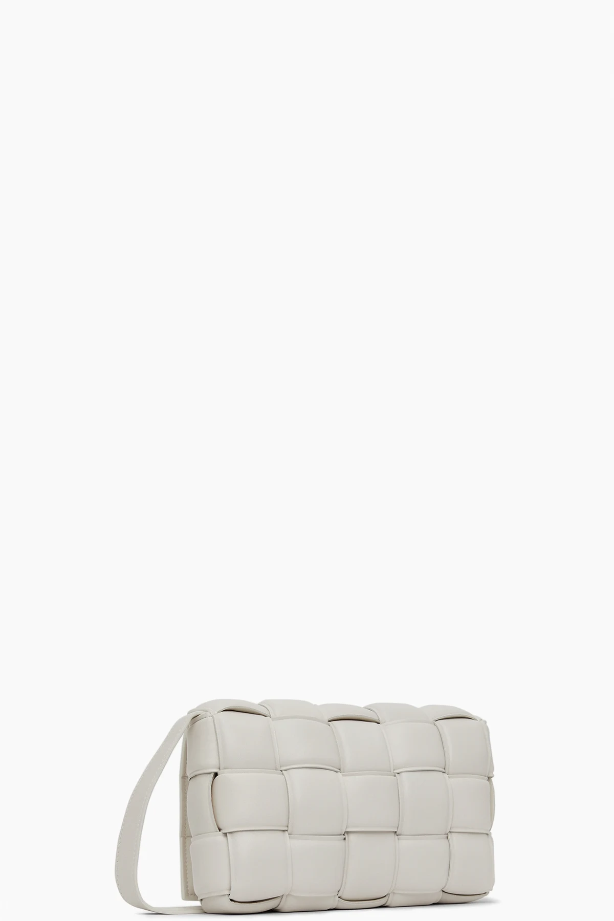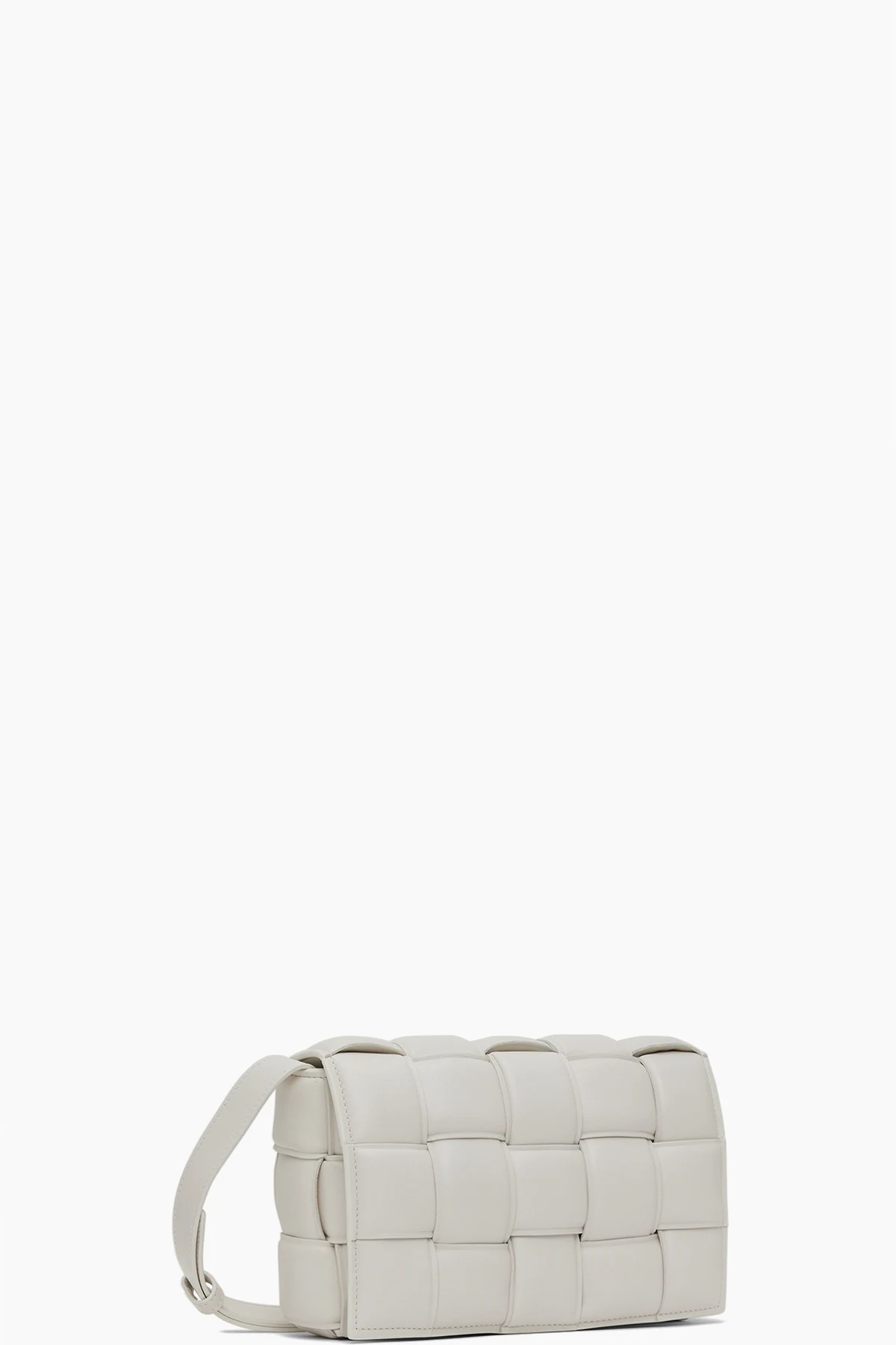 Handwoven padded intreccio-woven lambskin messenger bag in off-white.