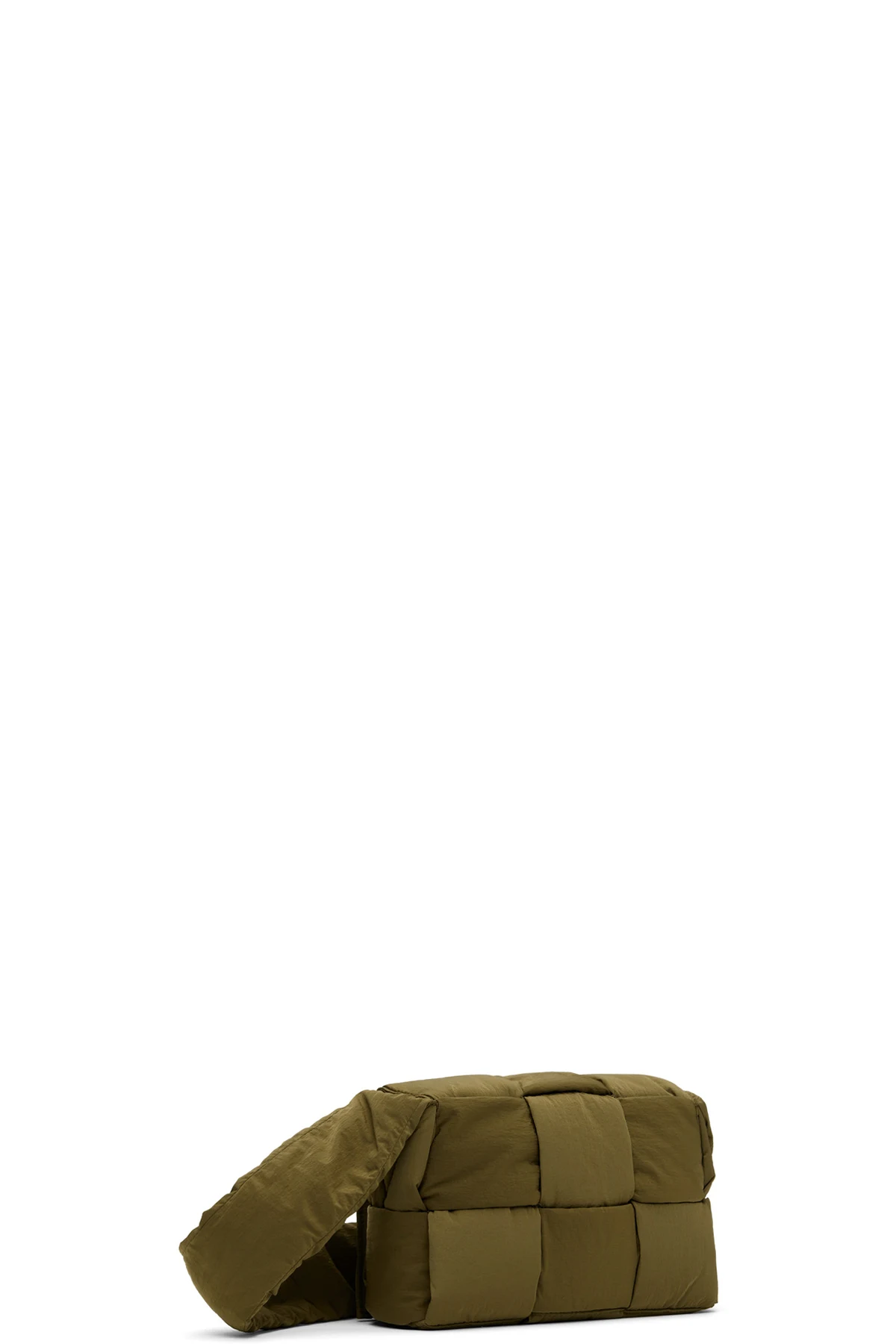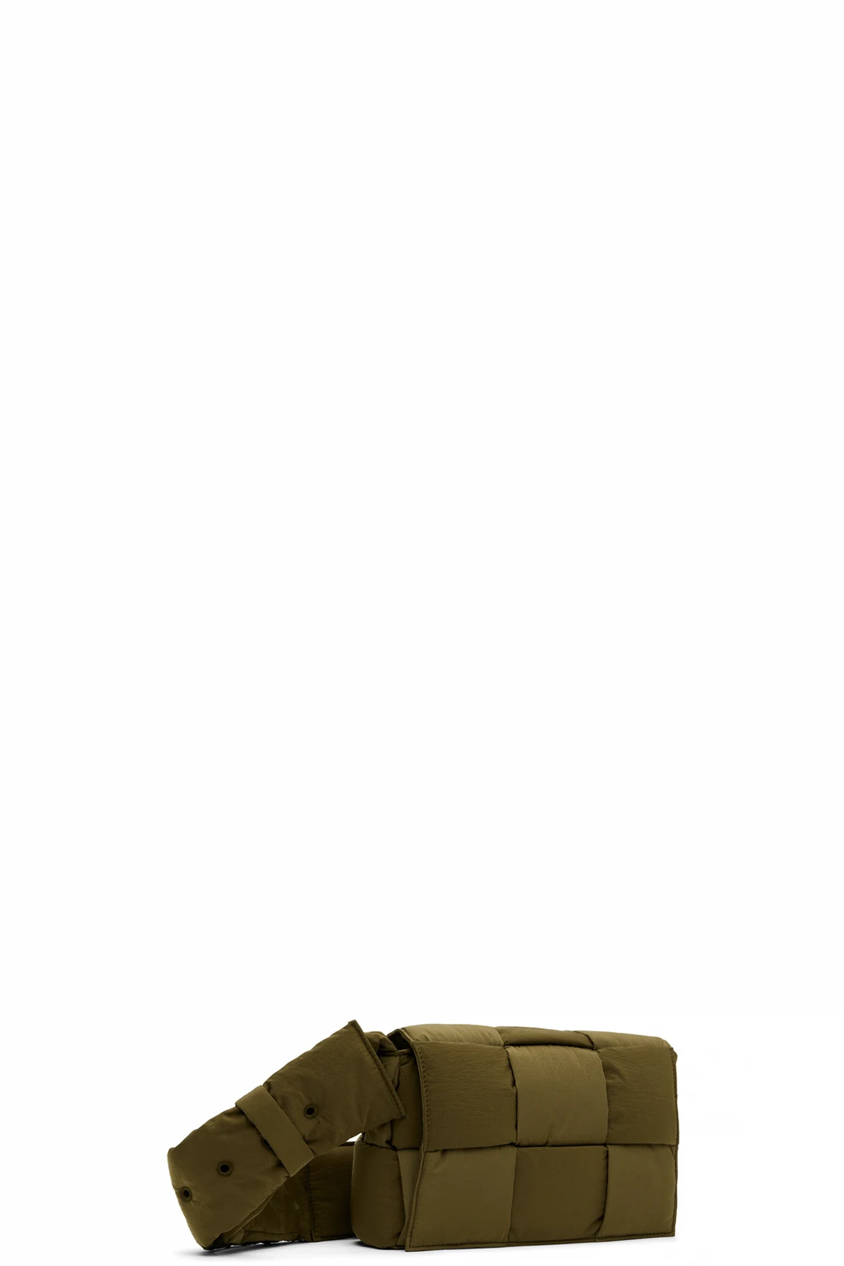Padded intreccio-woven nylon taffeta messenger bag in khaki.