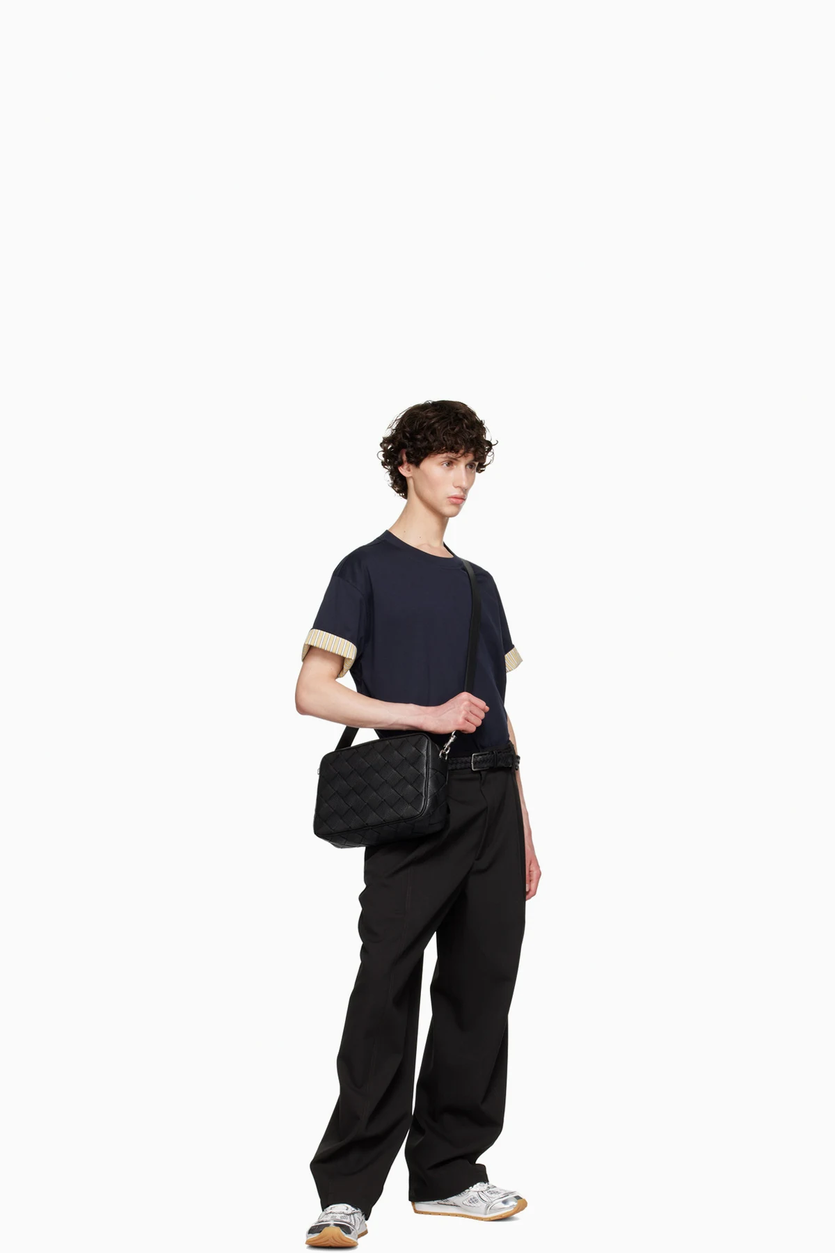 Intrecciato-woven pebble grained calfskin messenger bag in black.