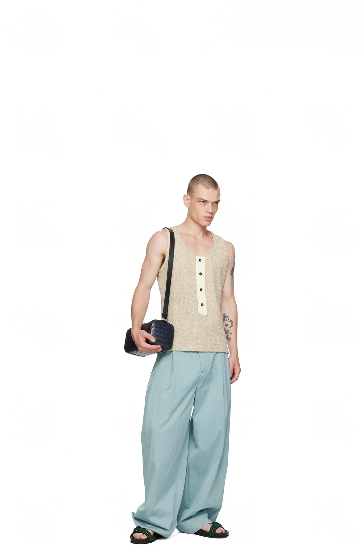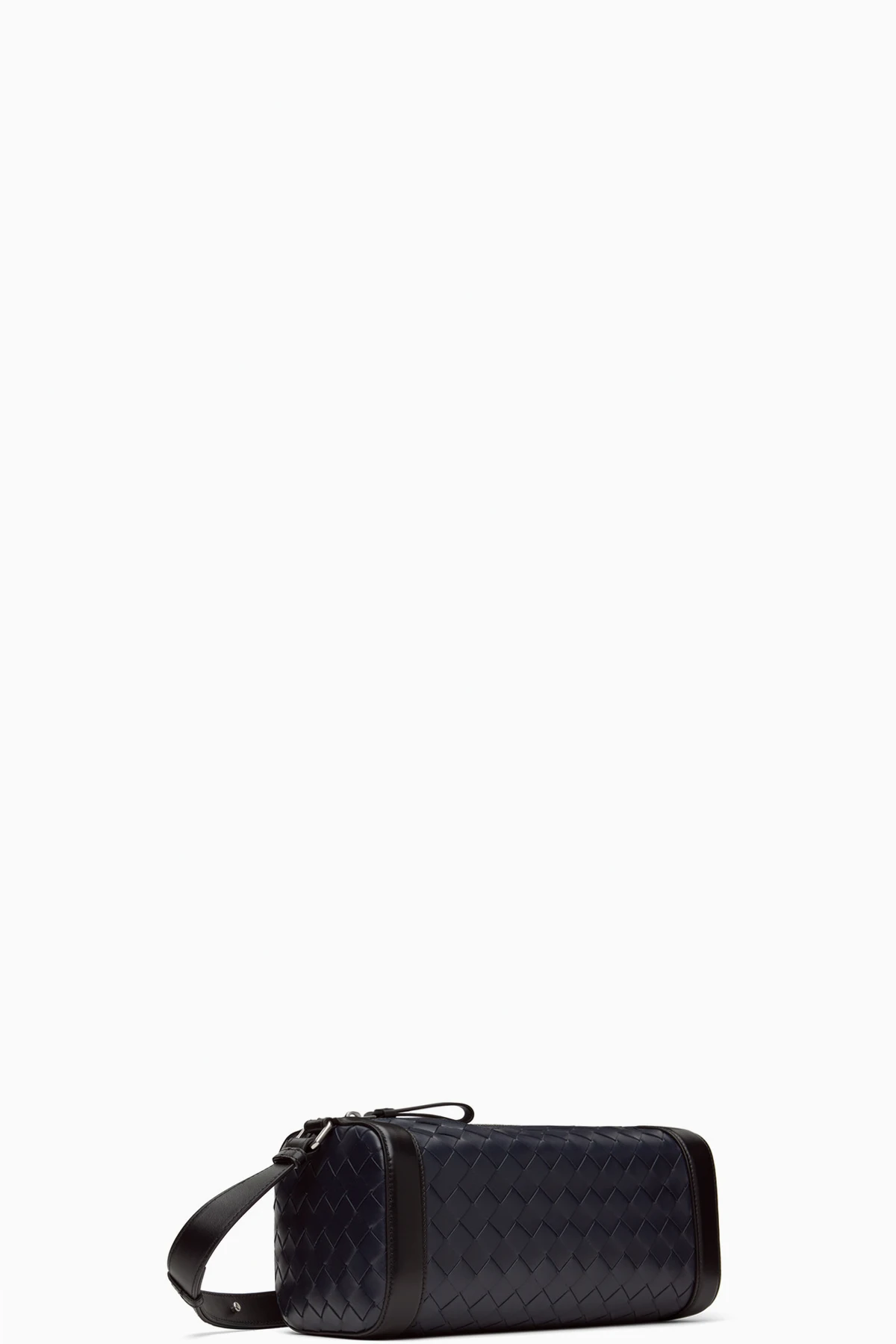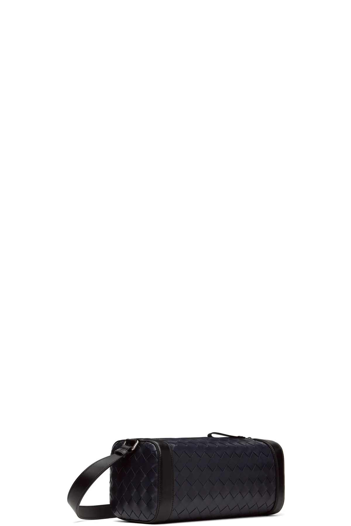 Intrecciato-woven grained calfskin messenger bag in navy and black.
