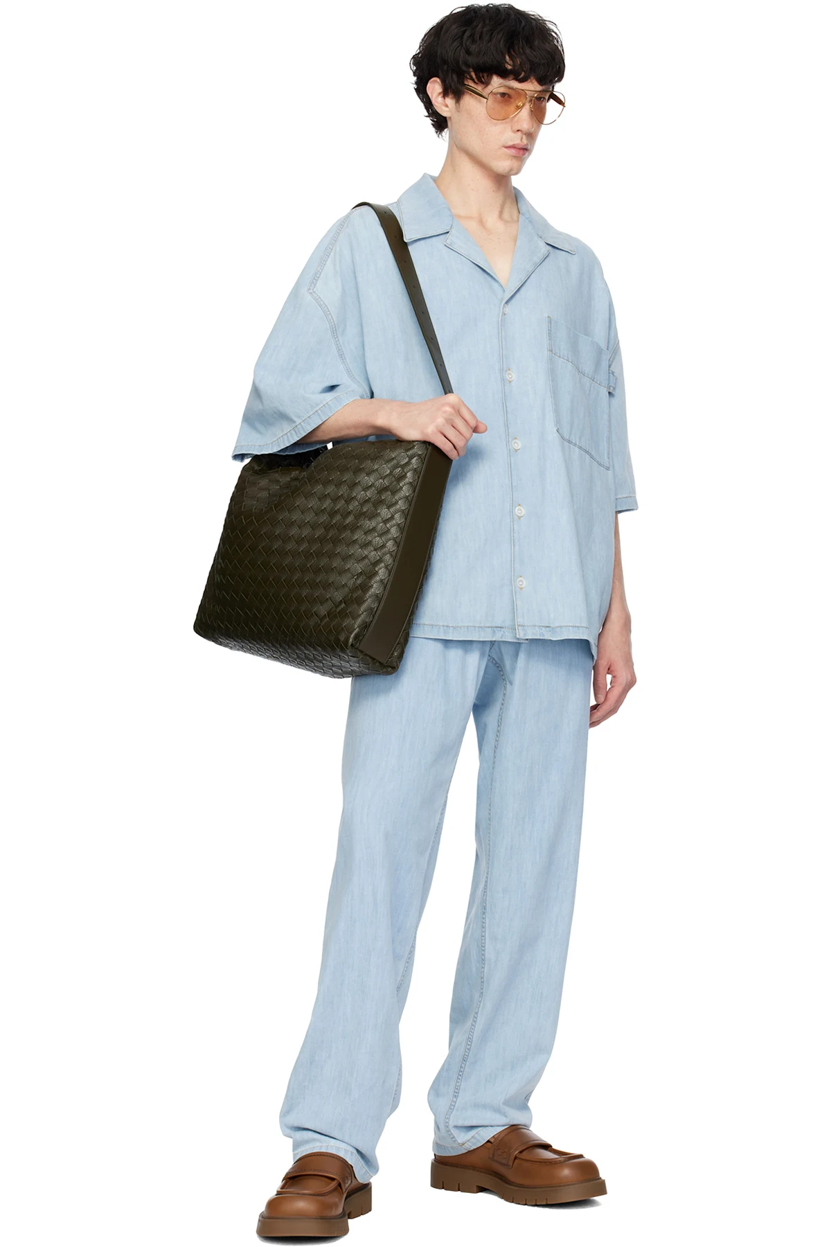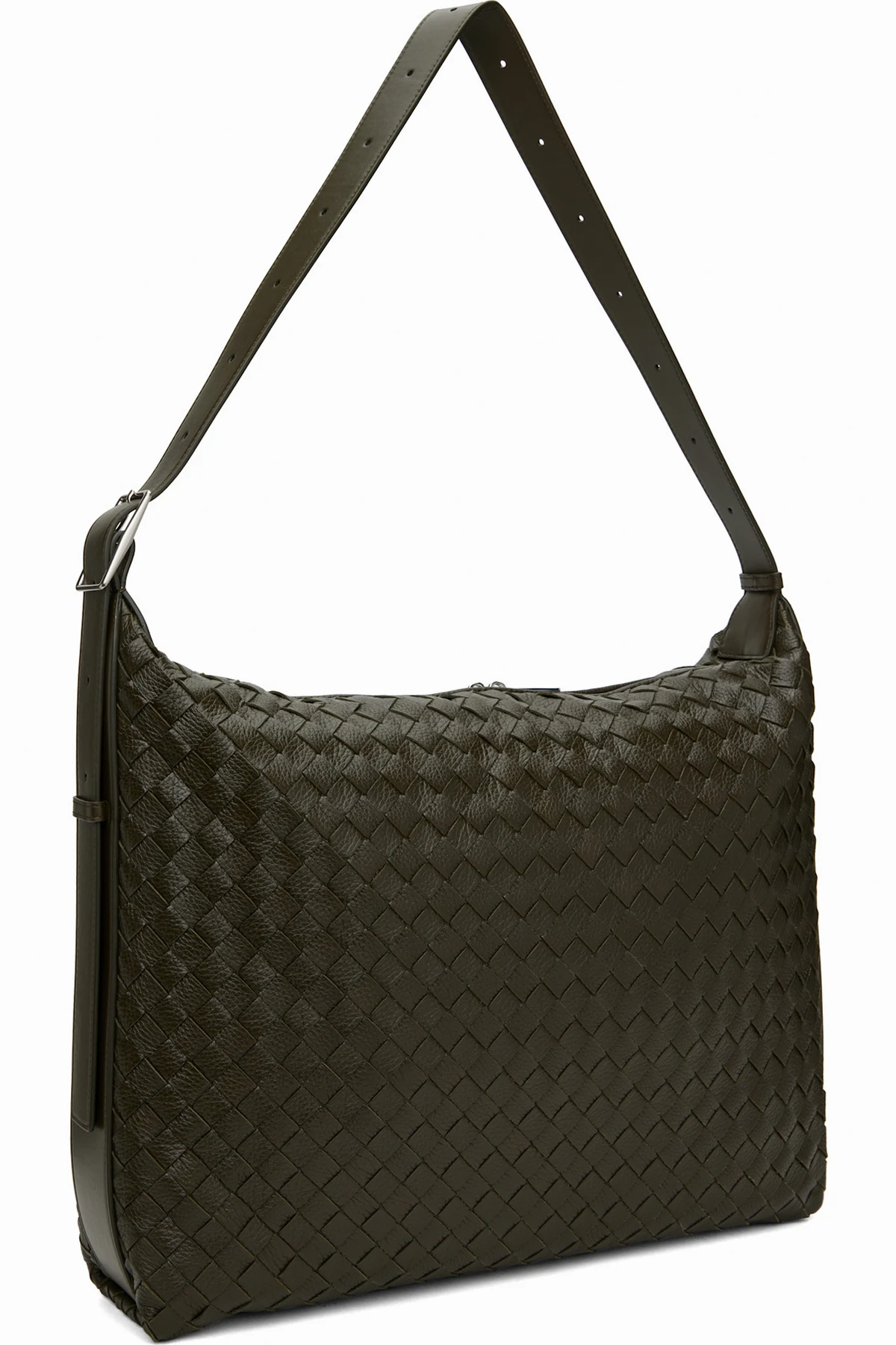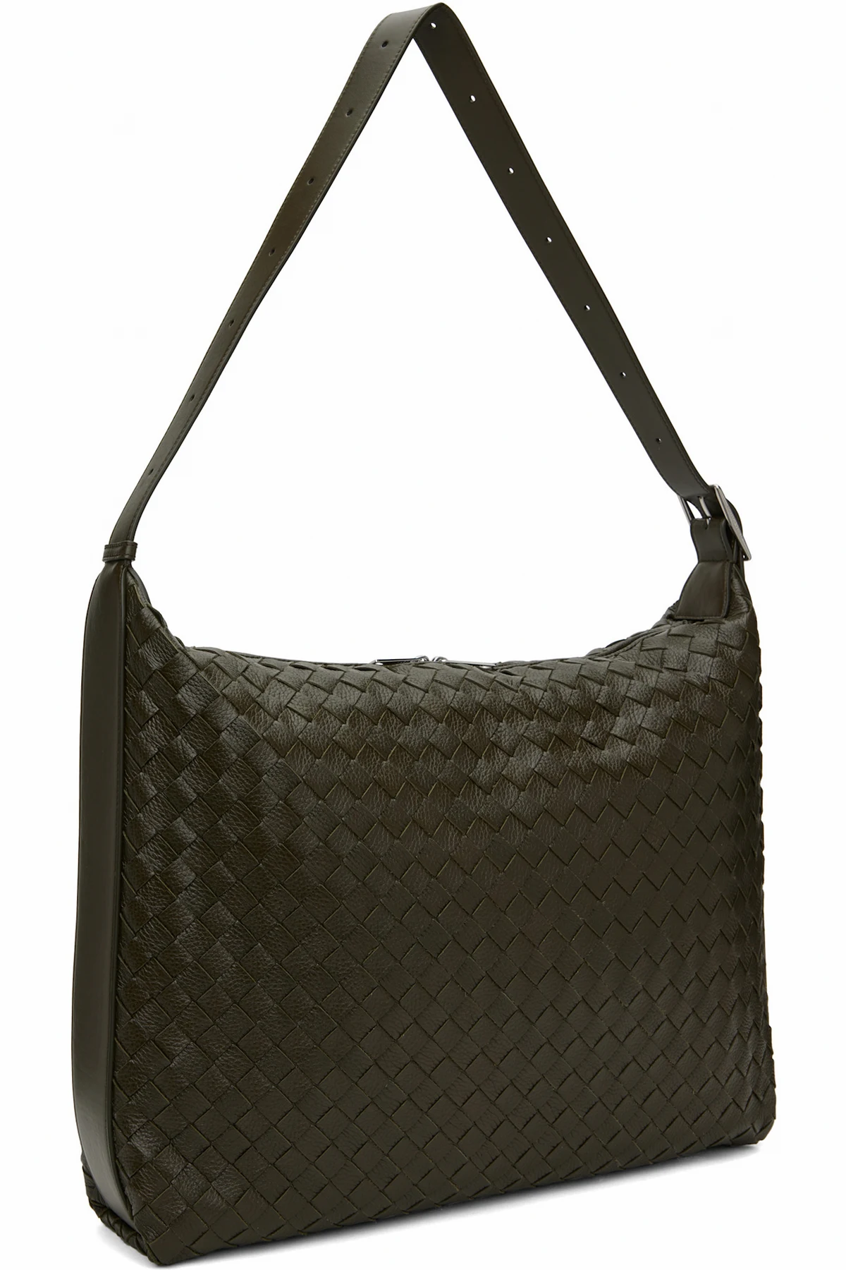 Intrecciato-woven grained deerskin messenger bag in khaki.