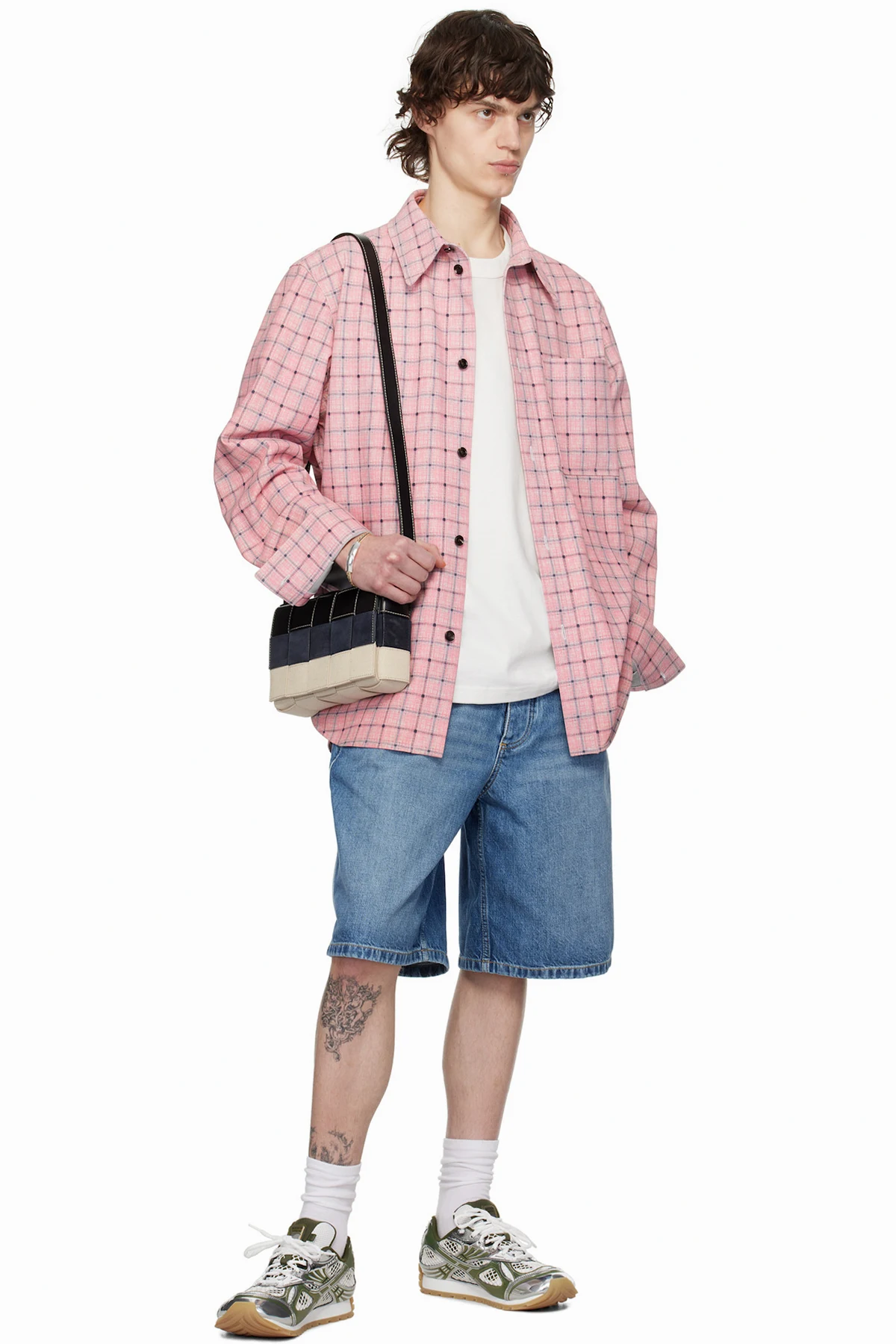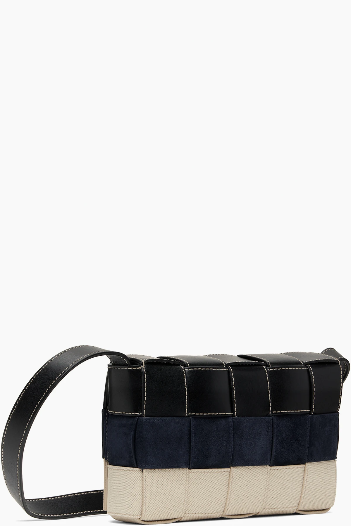 Intreccio-woven buffed calfskin, suede, and canvas messenger bag in black, white, and navy.