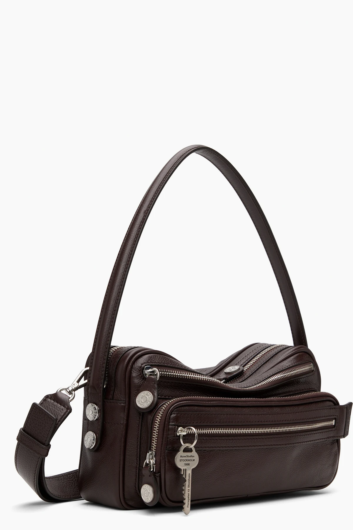 · Zip pockets, embossed logo, and key charm at face