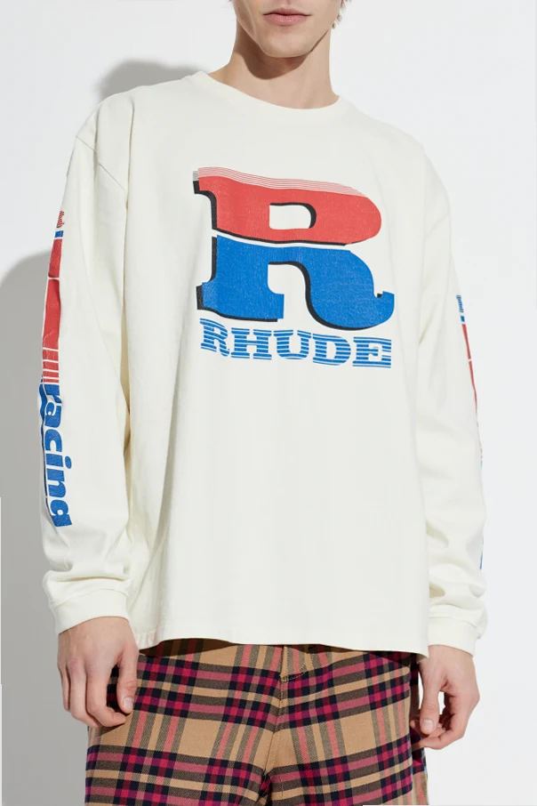 At its center, a strikingly bold two-tone "R"—with vibrant red atop deep blue, subtly outlined in black—serves as an emblem of distinctive taste. Below, the RHUDE designer logo in blue, set with meticulous linear accents, confidently declares its pedigree.