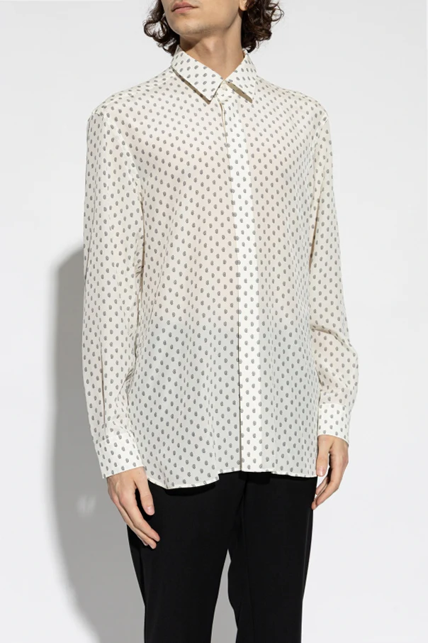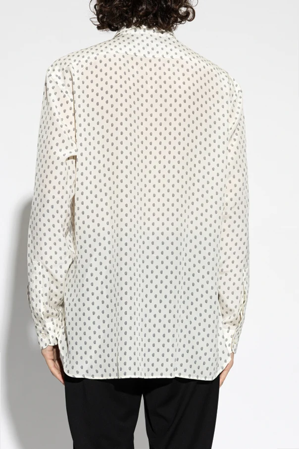 The classic straight cut, standard collar, and buttoned cuffs evoke timeless formal appeal, while the meticulously concealed button placket enhances its minimalist aesthetic. A distinct, intricate motif—subtle micro-skulls in a deep charcoal tone—imbues this masterpiece with modern intrigue, making it a statement piece for discerning gentlemen.