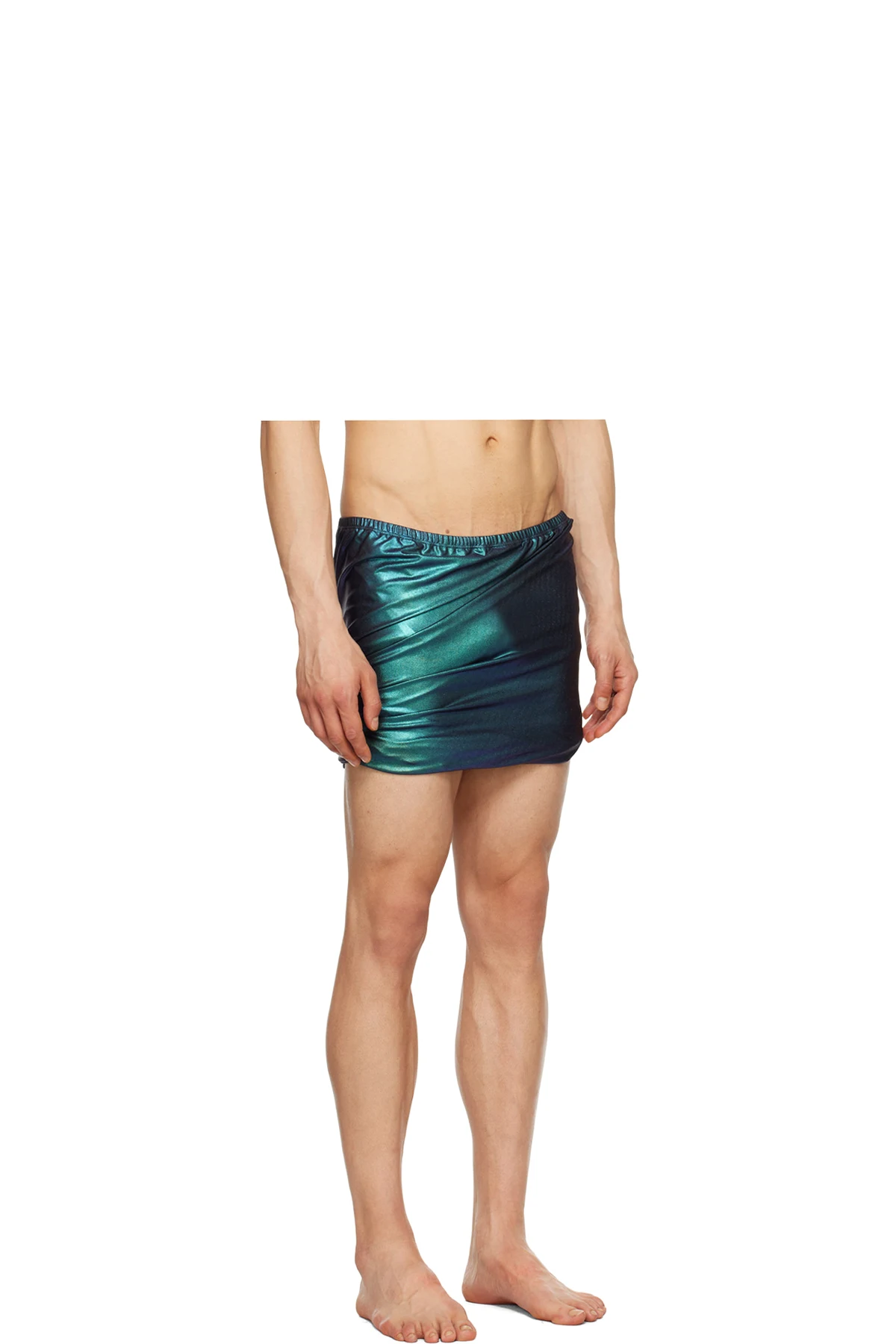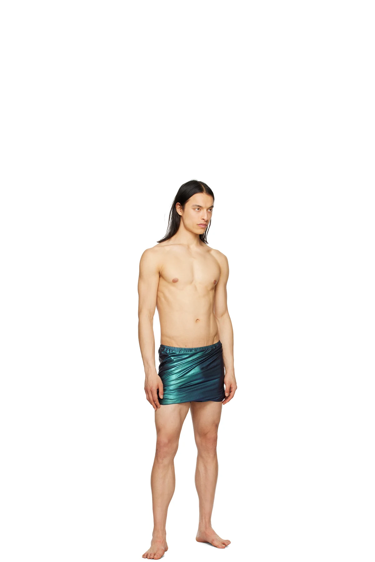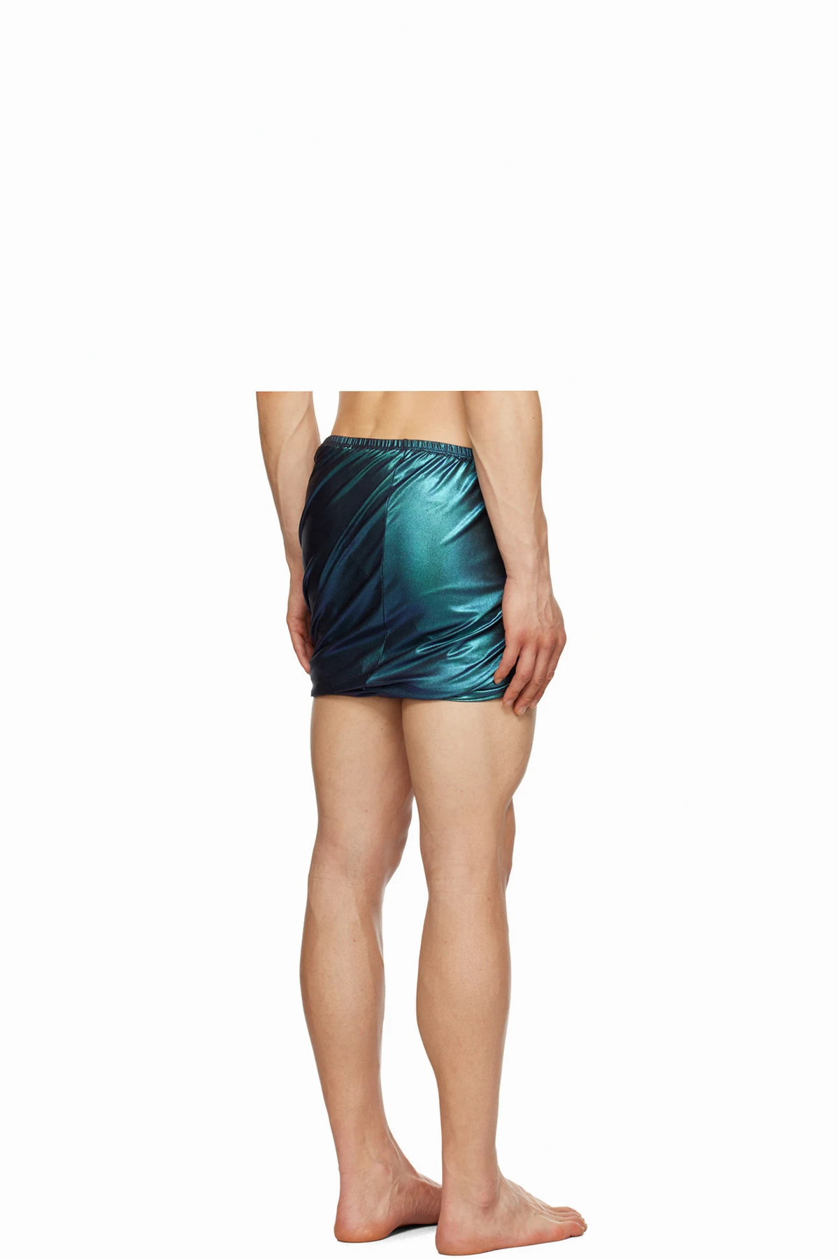 Stretch polyester lamé jersey swim shorts. Draping throughout.