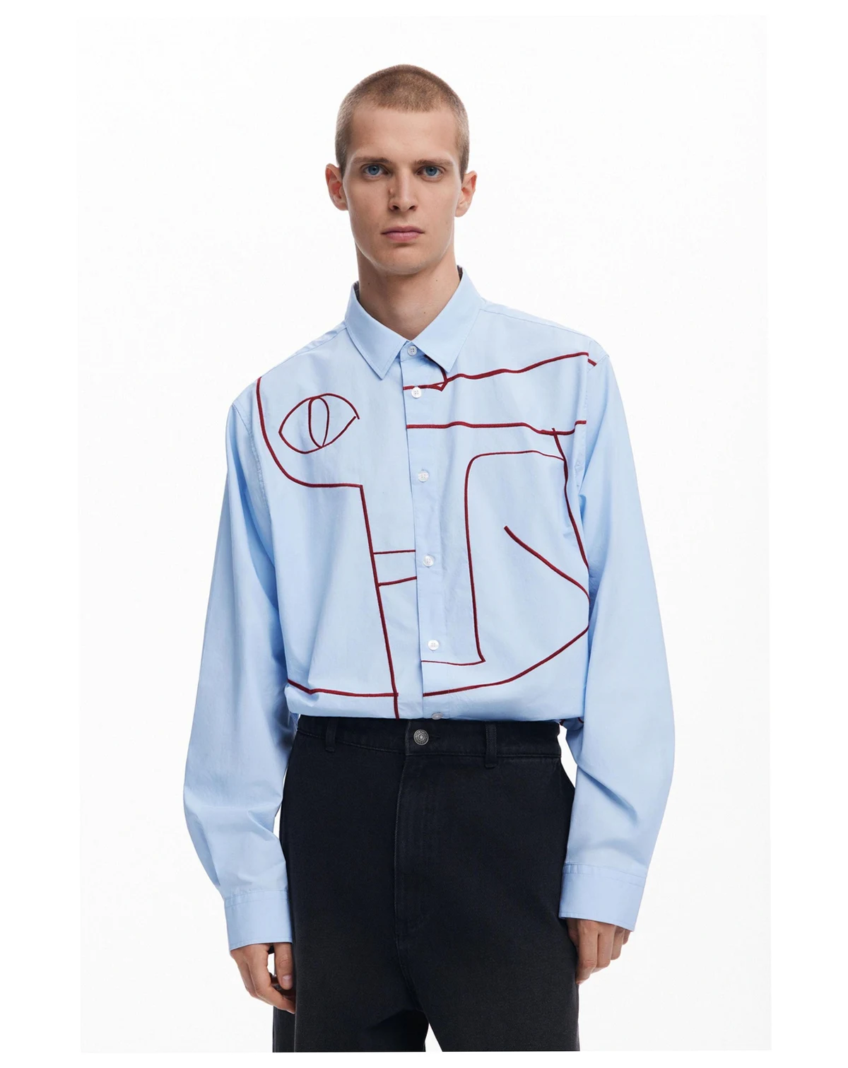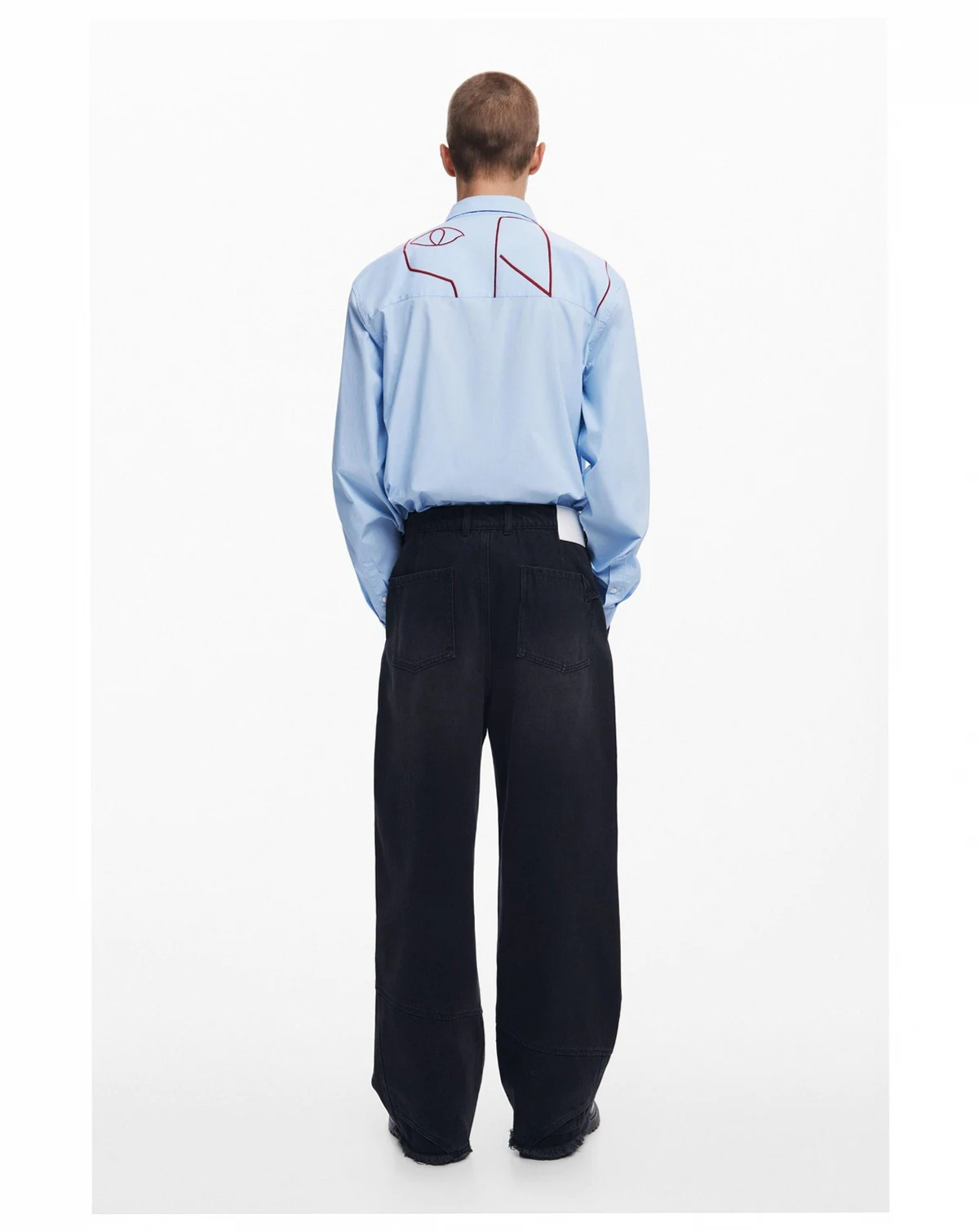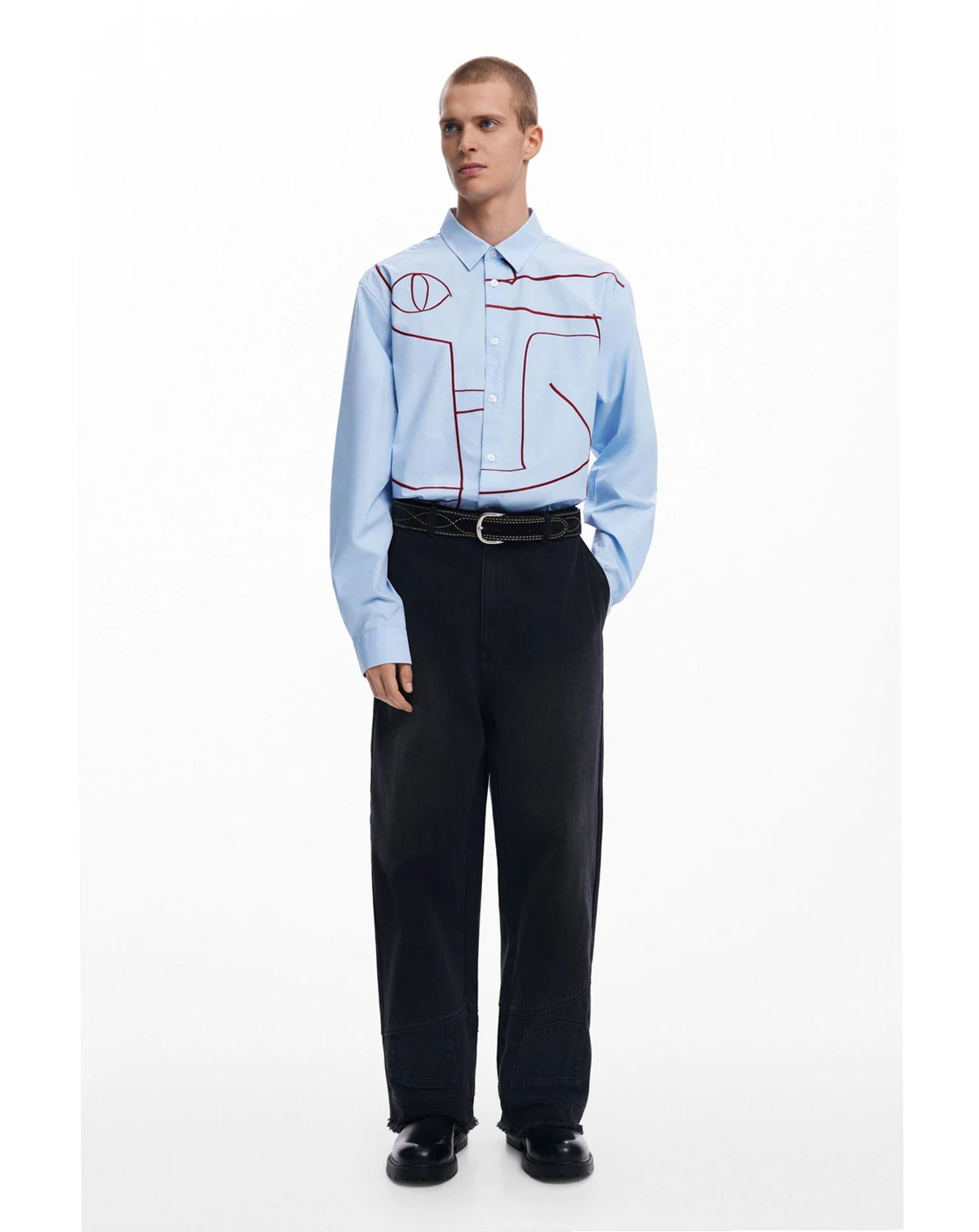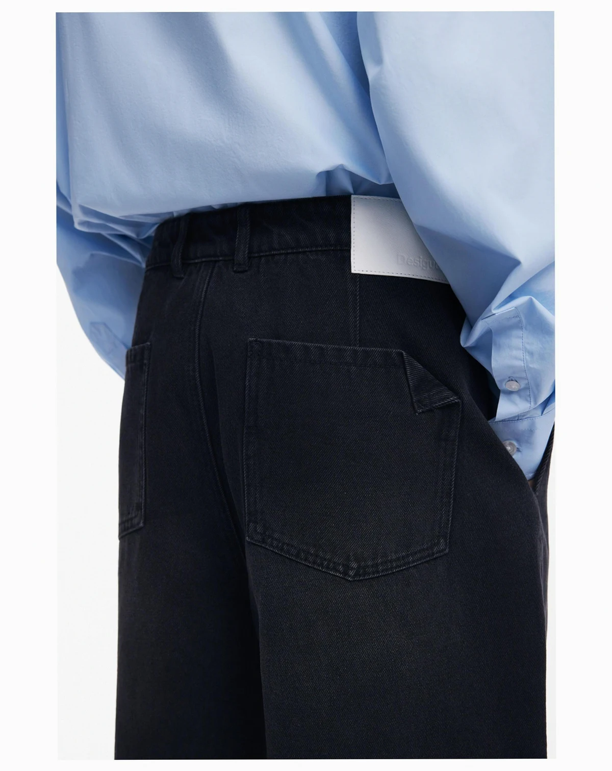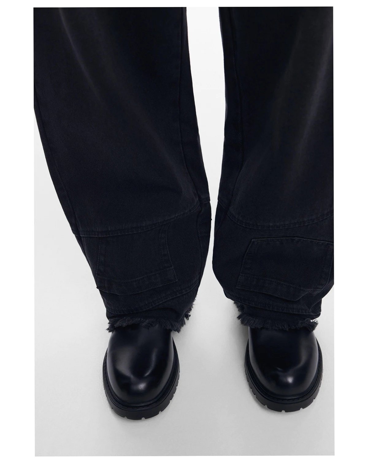 Baggy cut long jeans in patchwork, with multiple pockets and frayed hem.