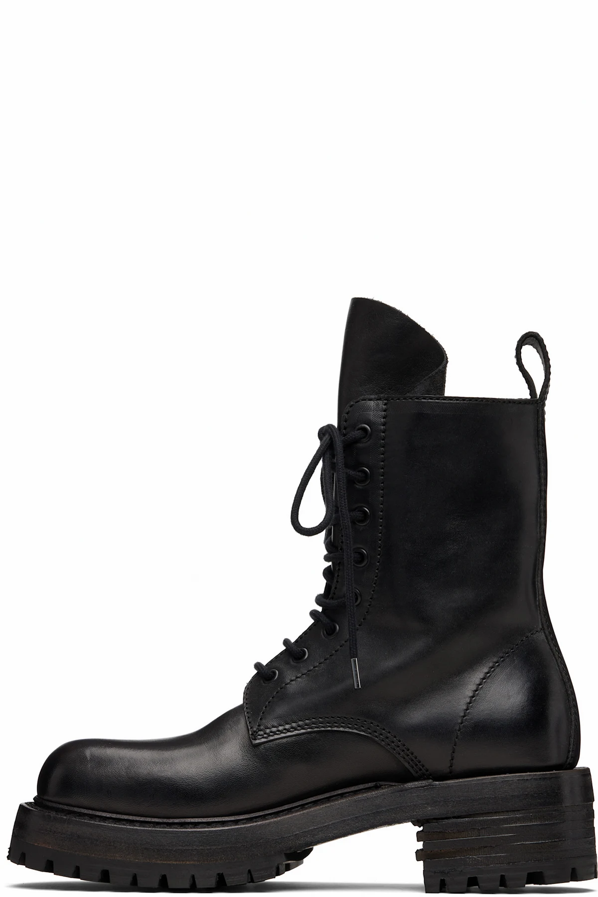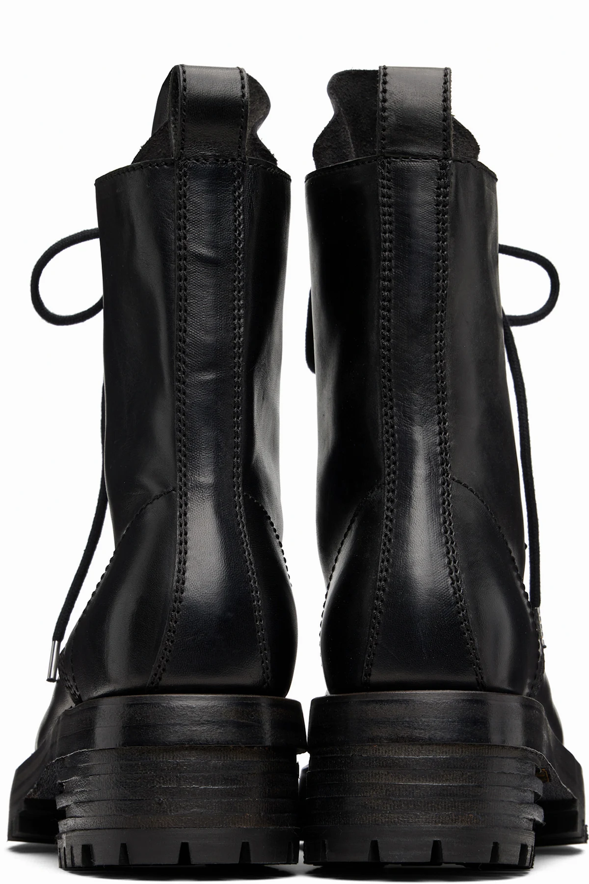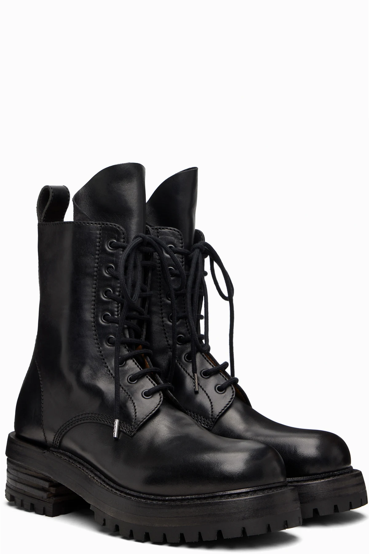 Ankle-high polished grained horse leather boots.