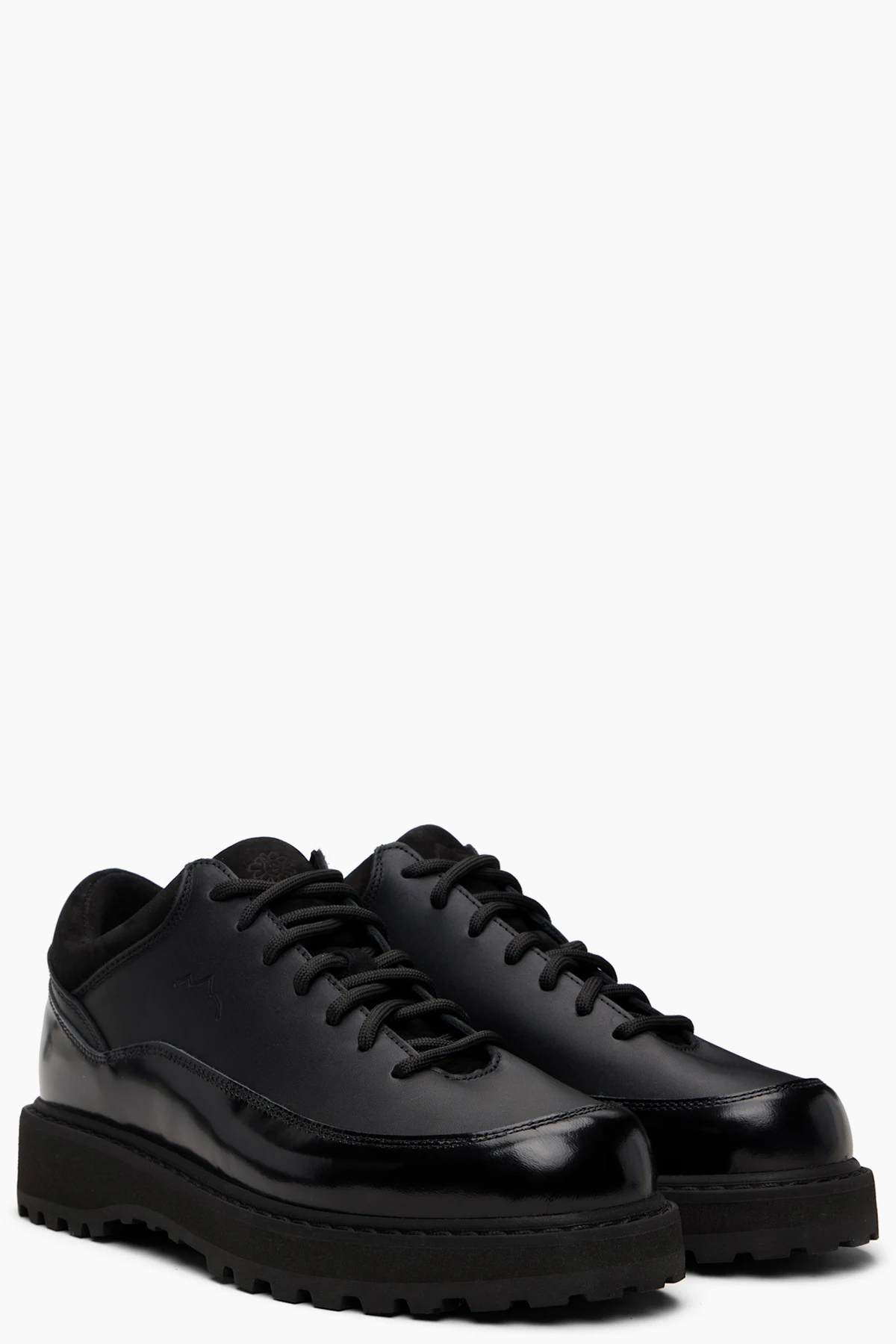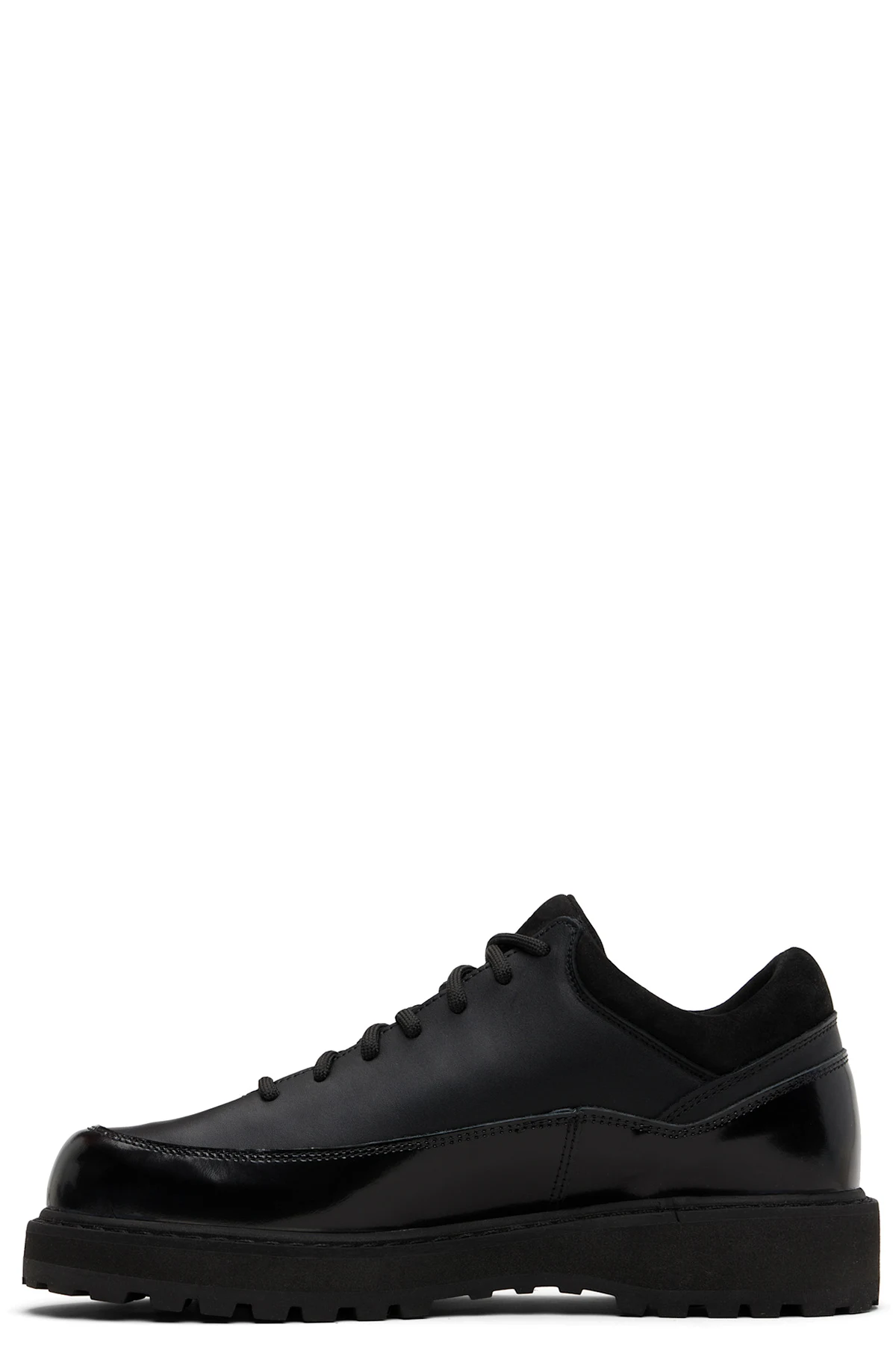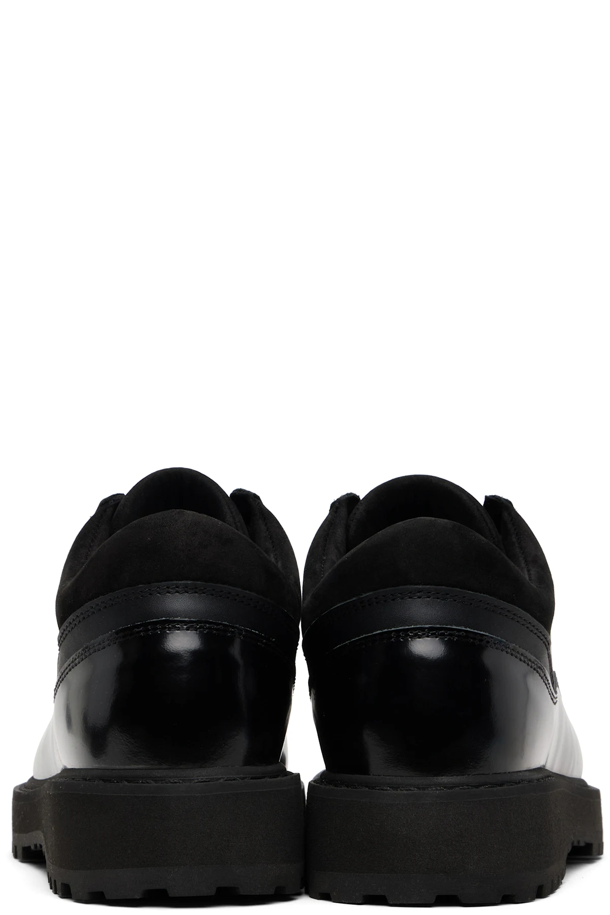 Ankle-high suede, patent leather, and grained nappa leather boots.