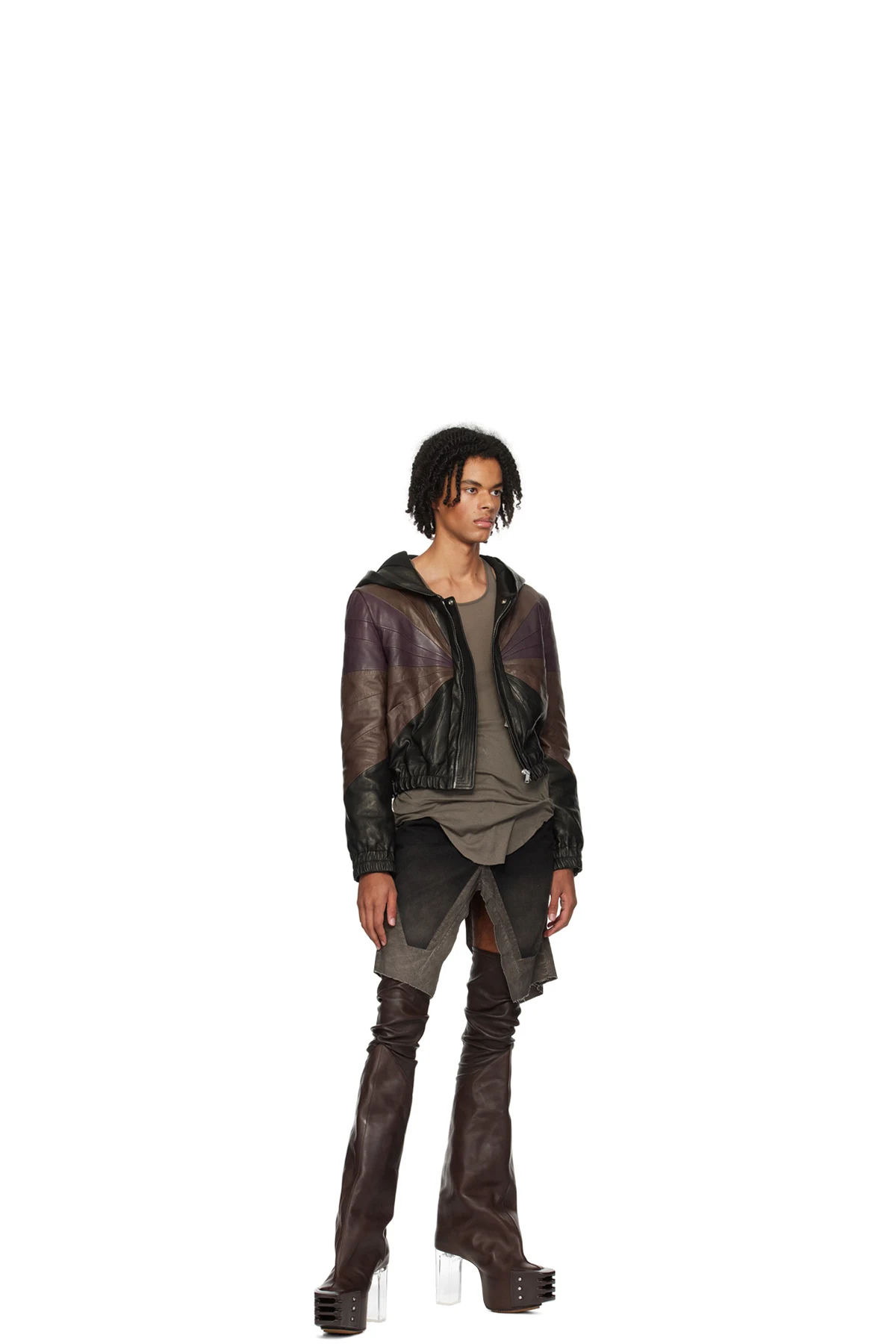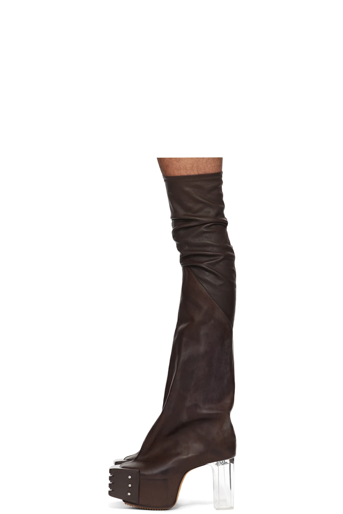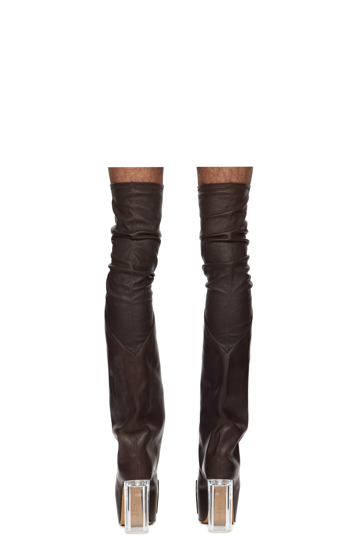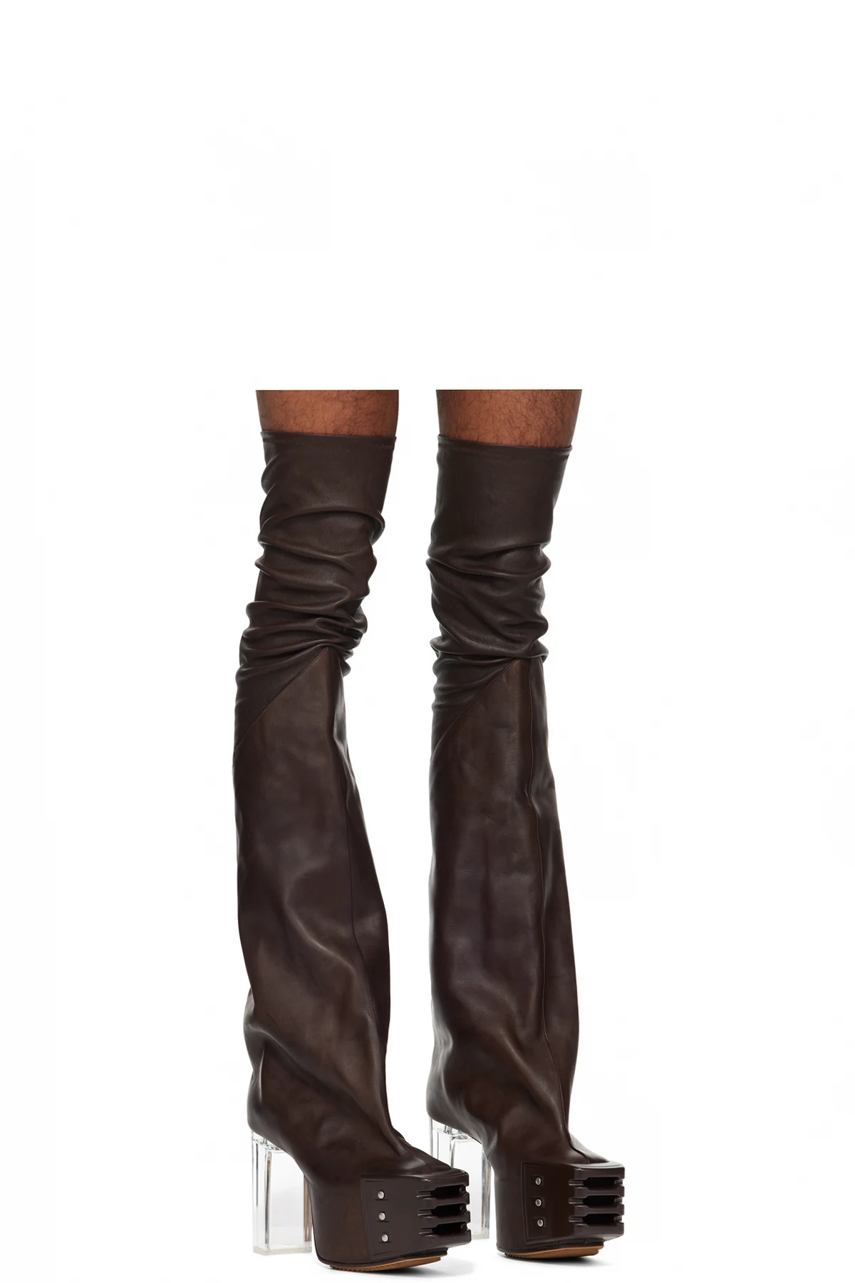 Thigh-high paneled grained lambskin and buffed groppone leather boots.