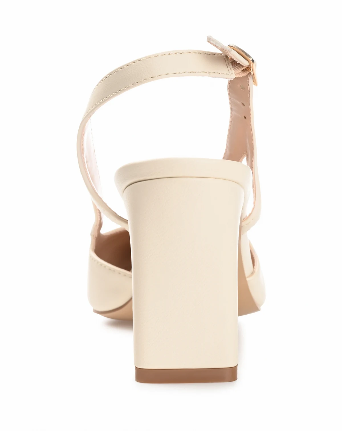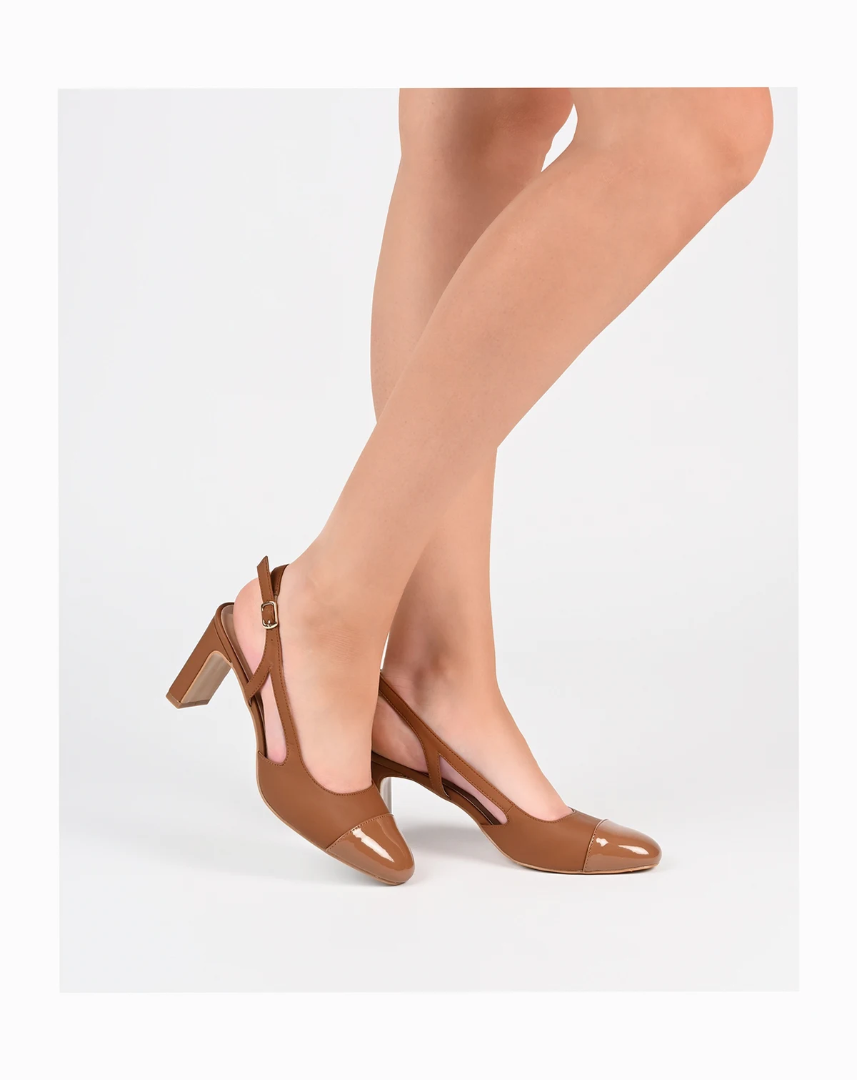 The Reignn pumps by Journee Collection look like they came straight off the runway and into your closet. This cap-toed cutie features luxe and a sling-back strap for a great look and feel. A covered half adds a leg-lengthening lift.