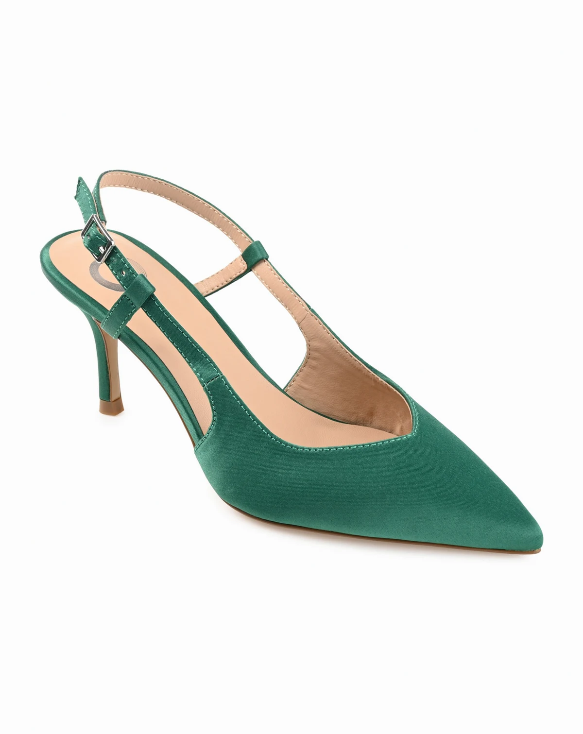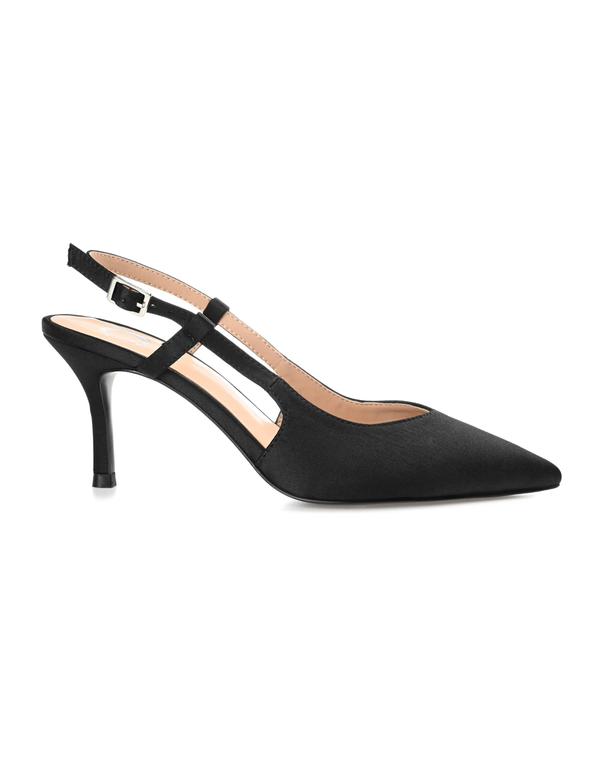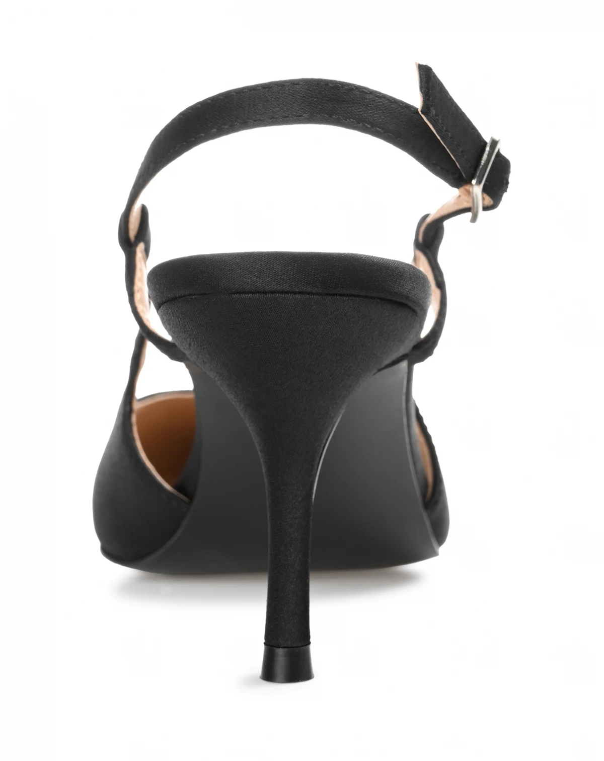 Meet our most striking stilettos yet, the Knightly by Journee Collection. With satin uppers and a sling back strap, this daring heel is perfect for your next big event. A sweetheart topline finish this slip-on silhouette for a vintage-like touch. Available in medium and wide width.