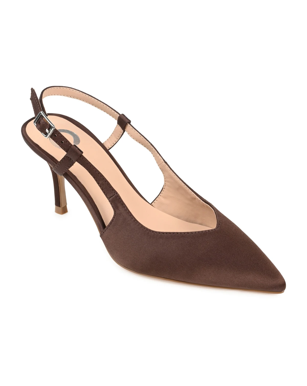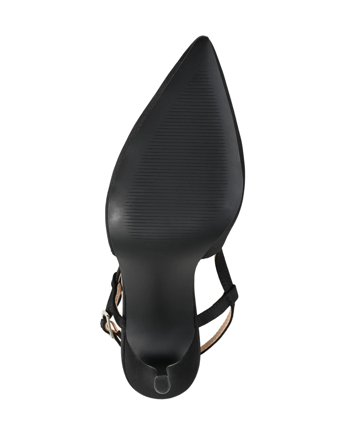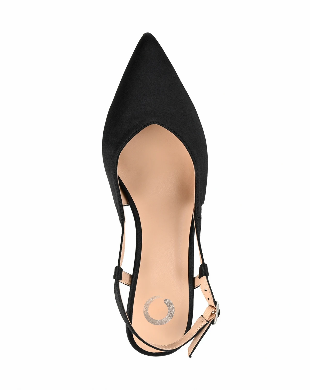 Meet our most striking stilettos yet, the Knightly by Journee Collection. With satin uppers and a sling back strap, this daring heel is perfect for your next big event. A sweetheart topline finish this slip-on silhouette for a vintage-like touch. Available in medium and wide width.