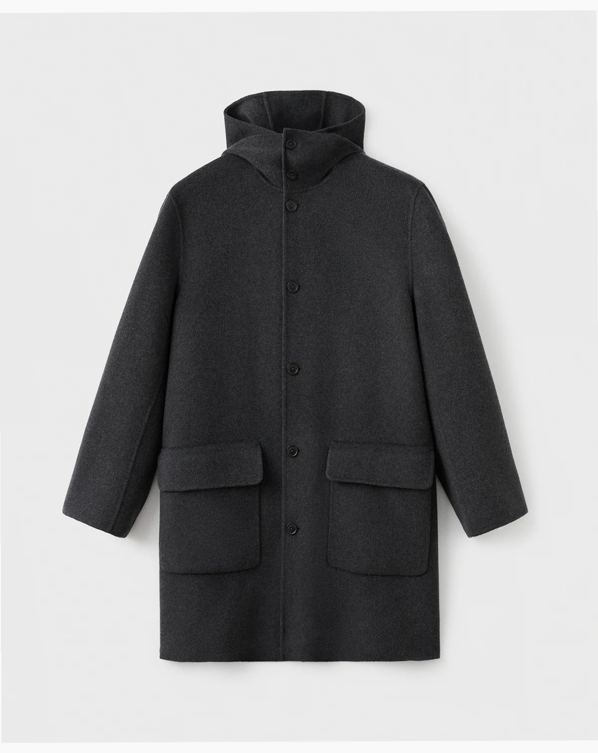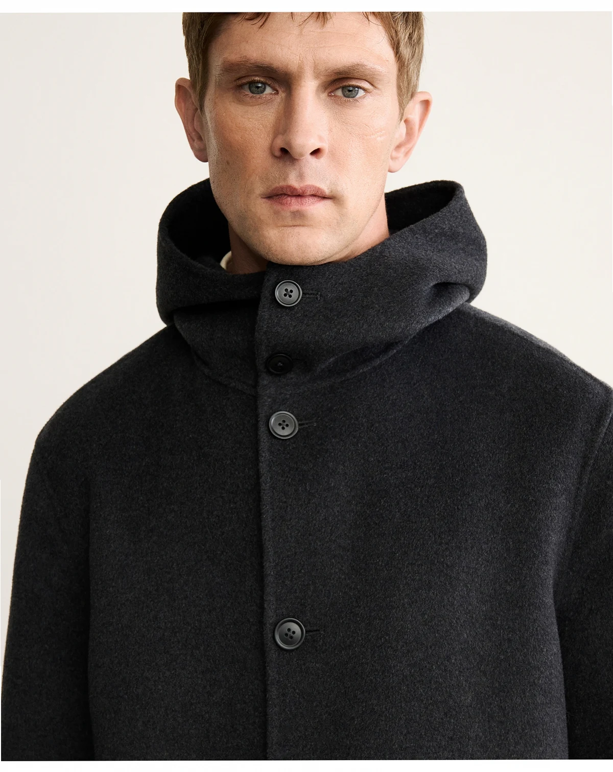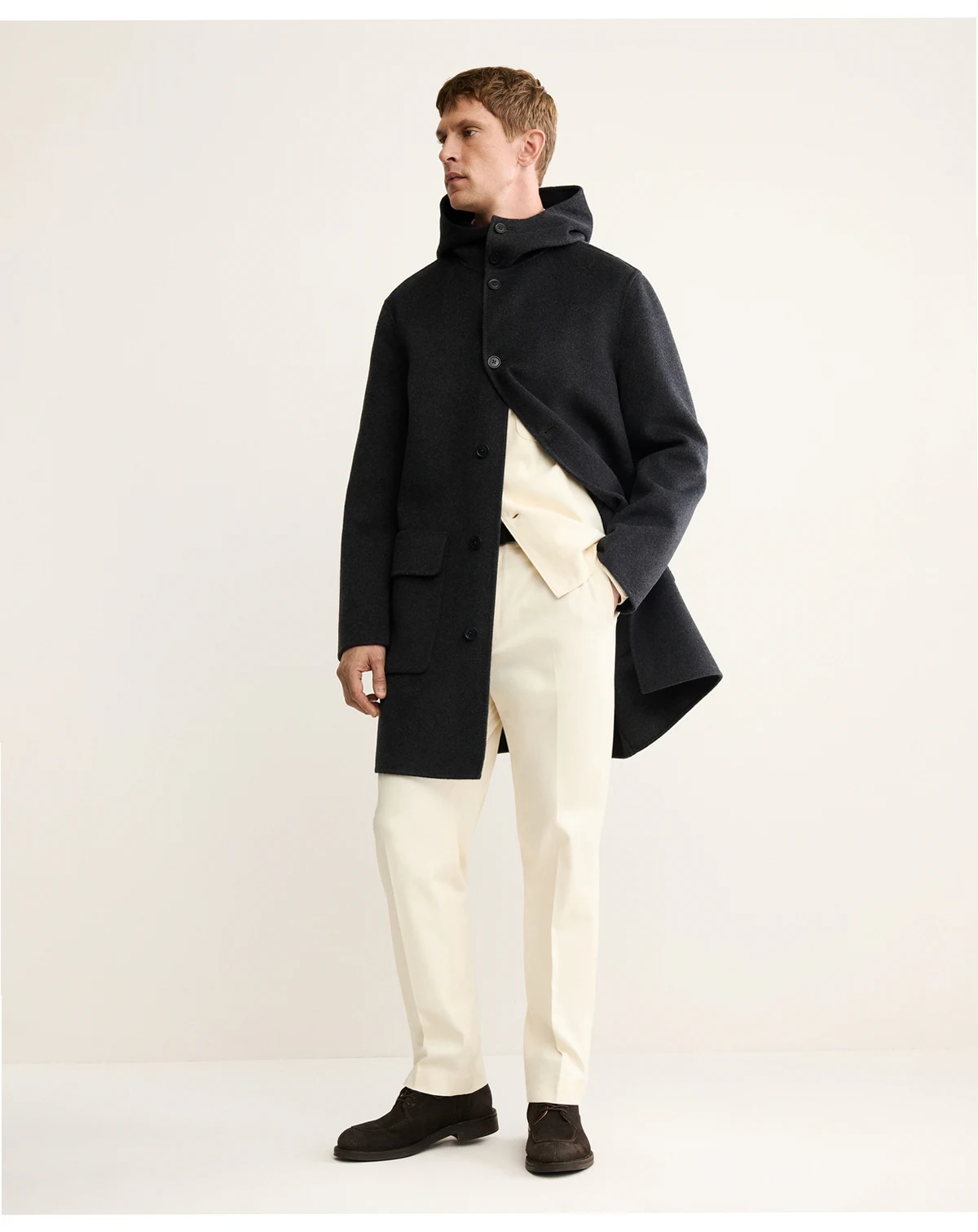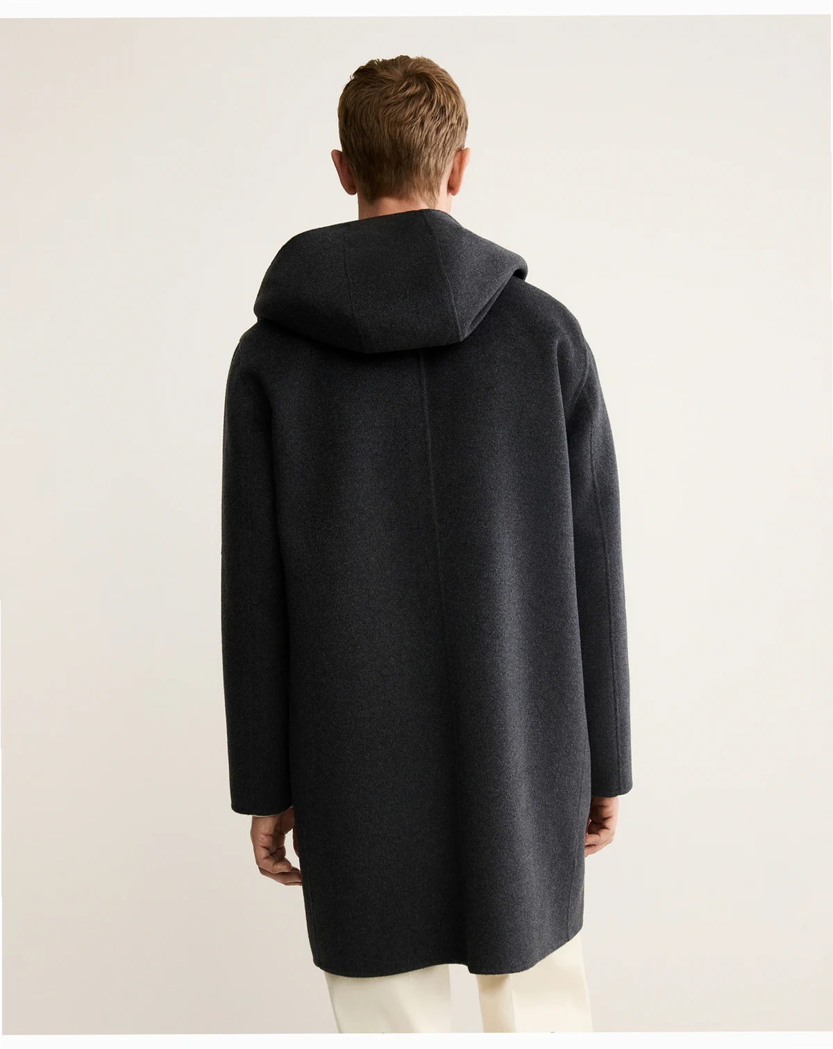 Practical structure frames the Handmade Wool Coat With Hood from Mango. Made from handmade wool fabric, this coat features straight silhouette with high neck, hood, front flap pockets, long sleeves and straight hem.