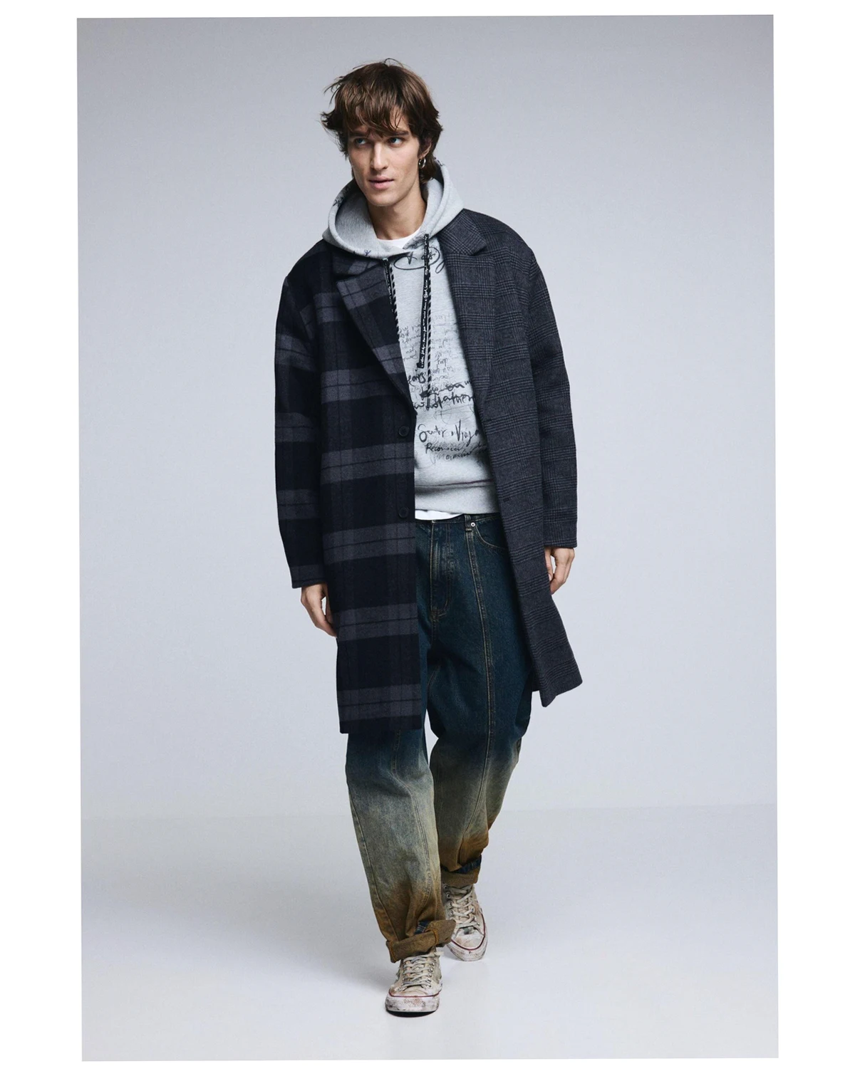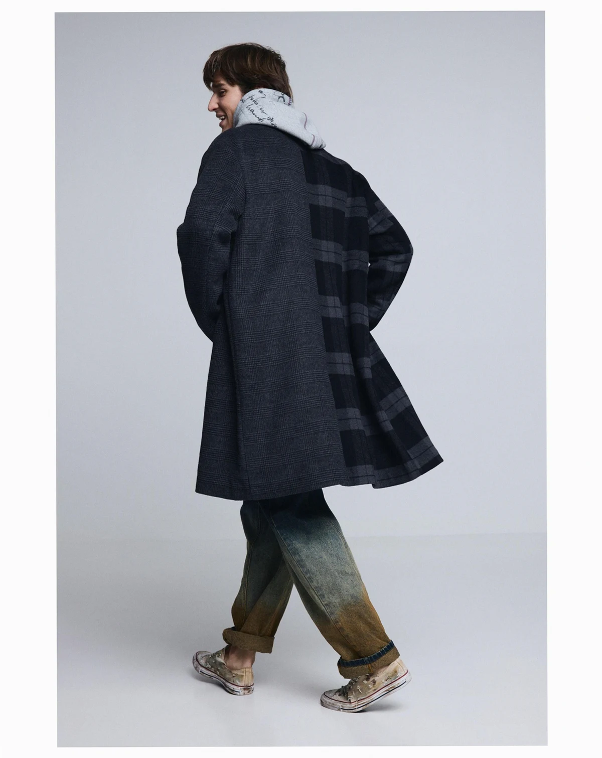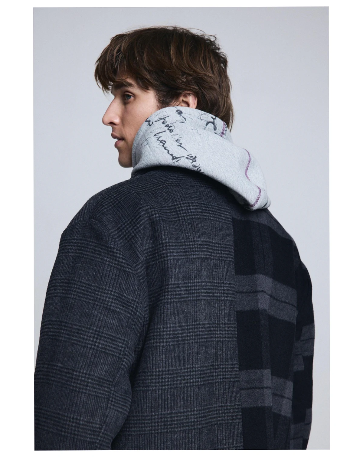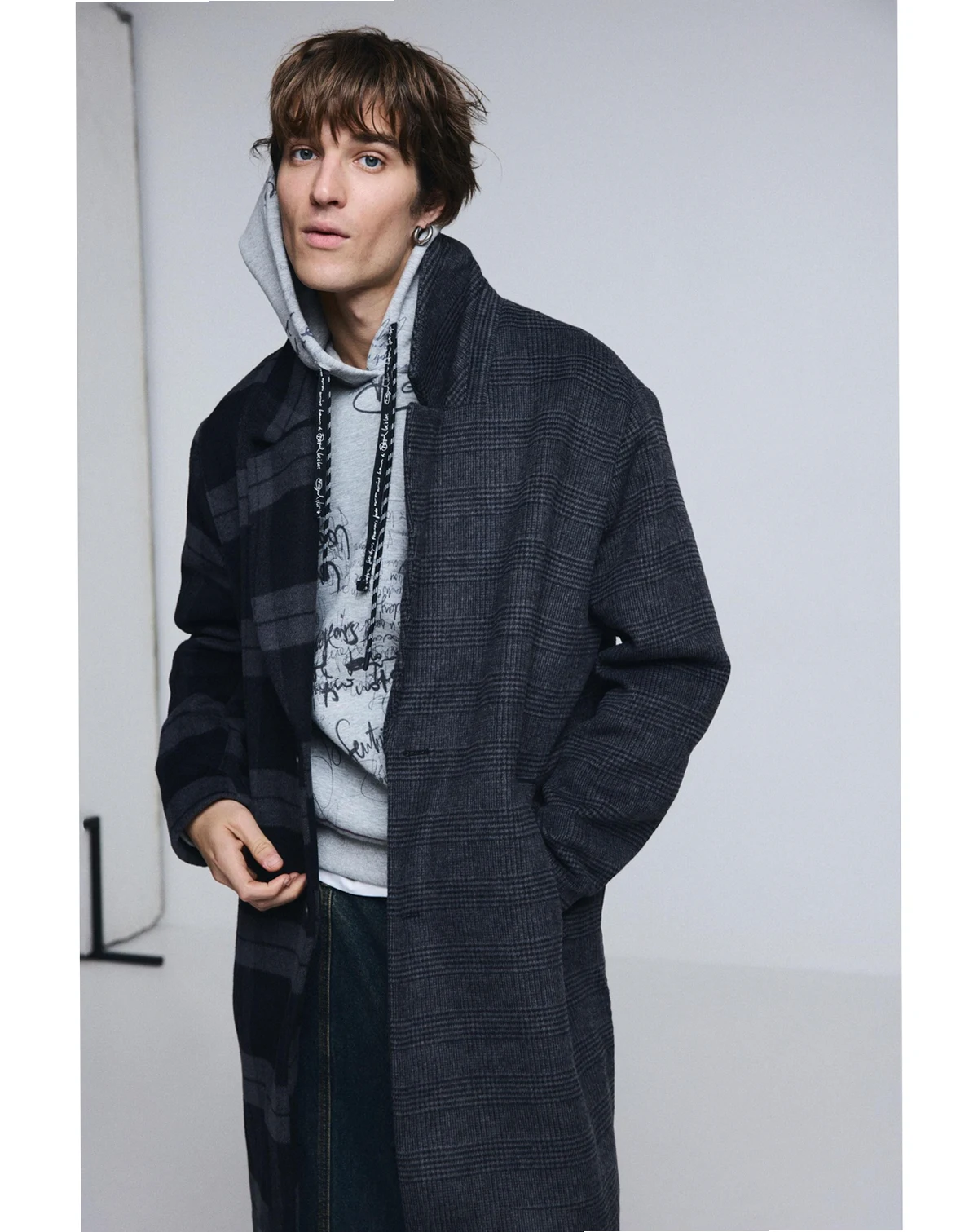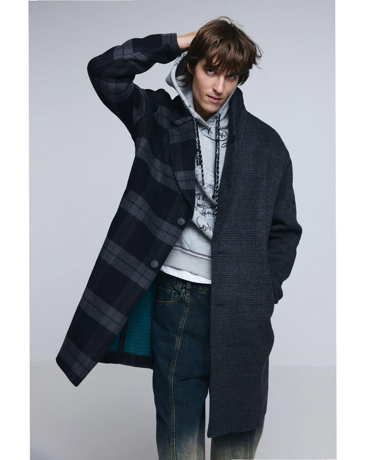 Long wool coat made from two materials with two different patterns, one side with checks and the other with a Prince of Wales style print.