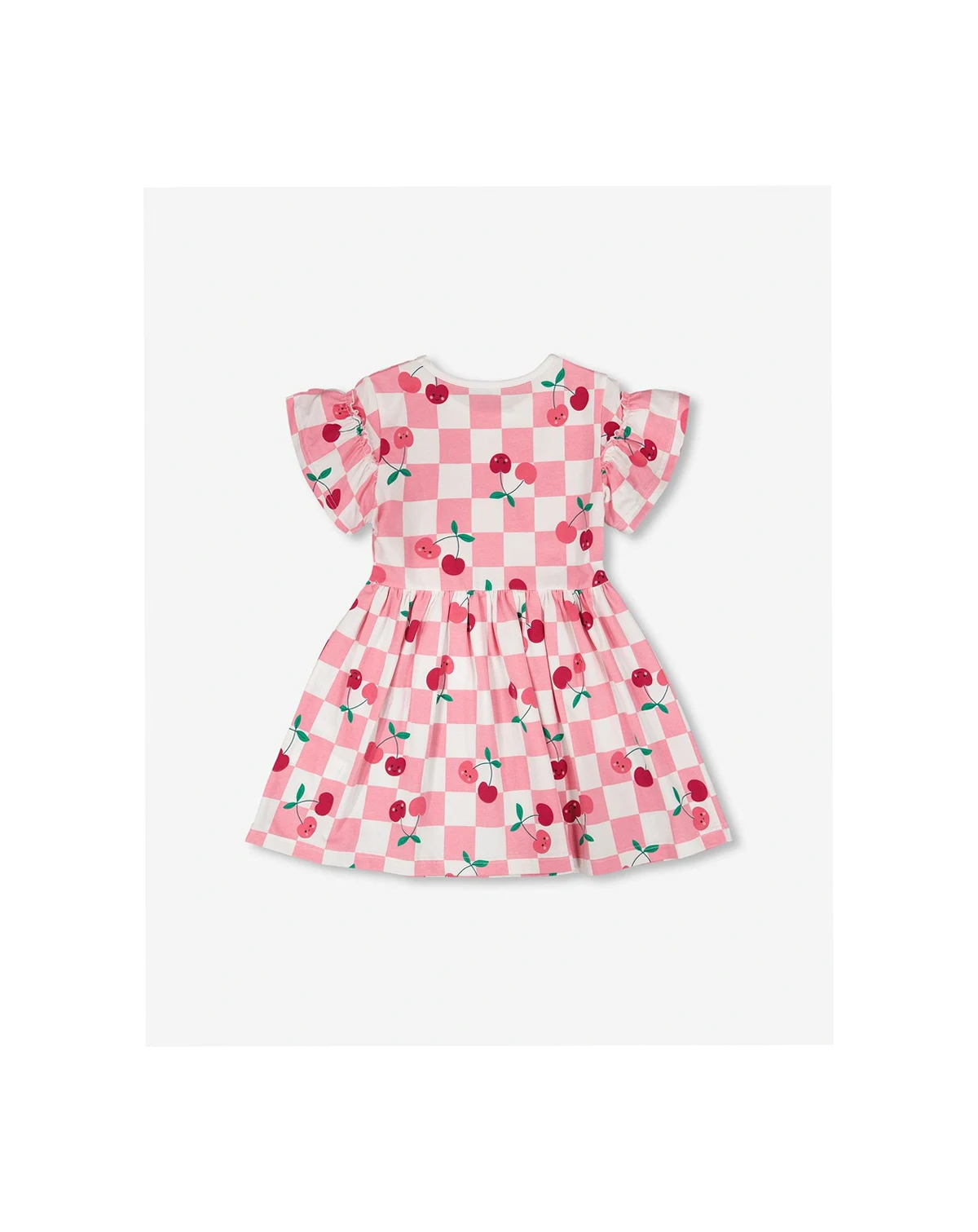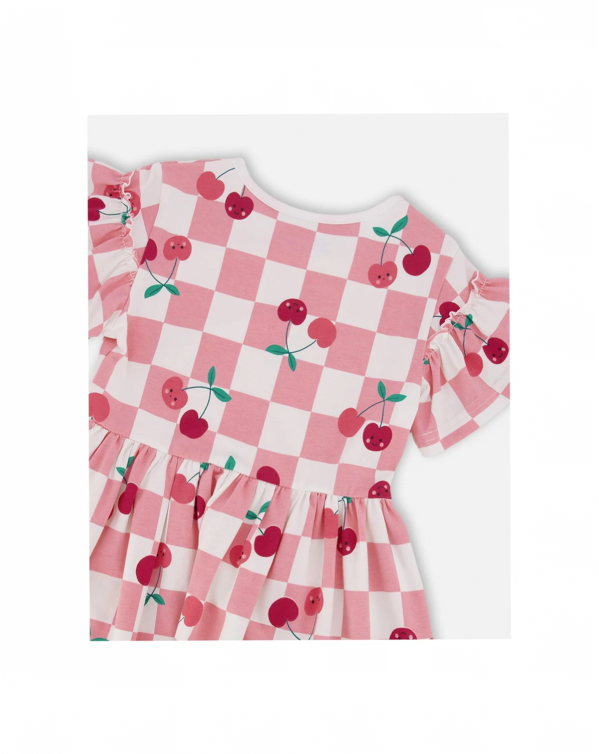 The cotton jersey dress in pink with printed cherries is made for sunny days and carefree play. This short-sleeve dress charms with flutter sleeves, a round neckline, and an allover checker and cherry print that feels both fresh and fun. Crafted in soft cotton jersey with a hint of stretch, it s perfect for comfort with a playful twist from our "Cherry On The Check" collection.