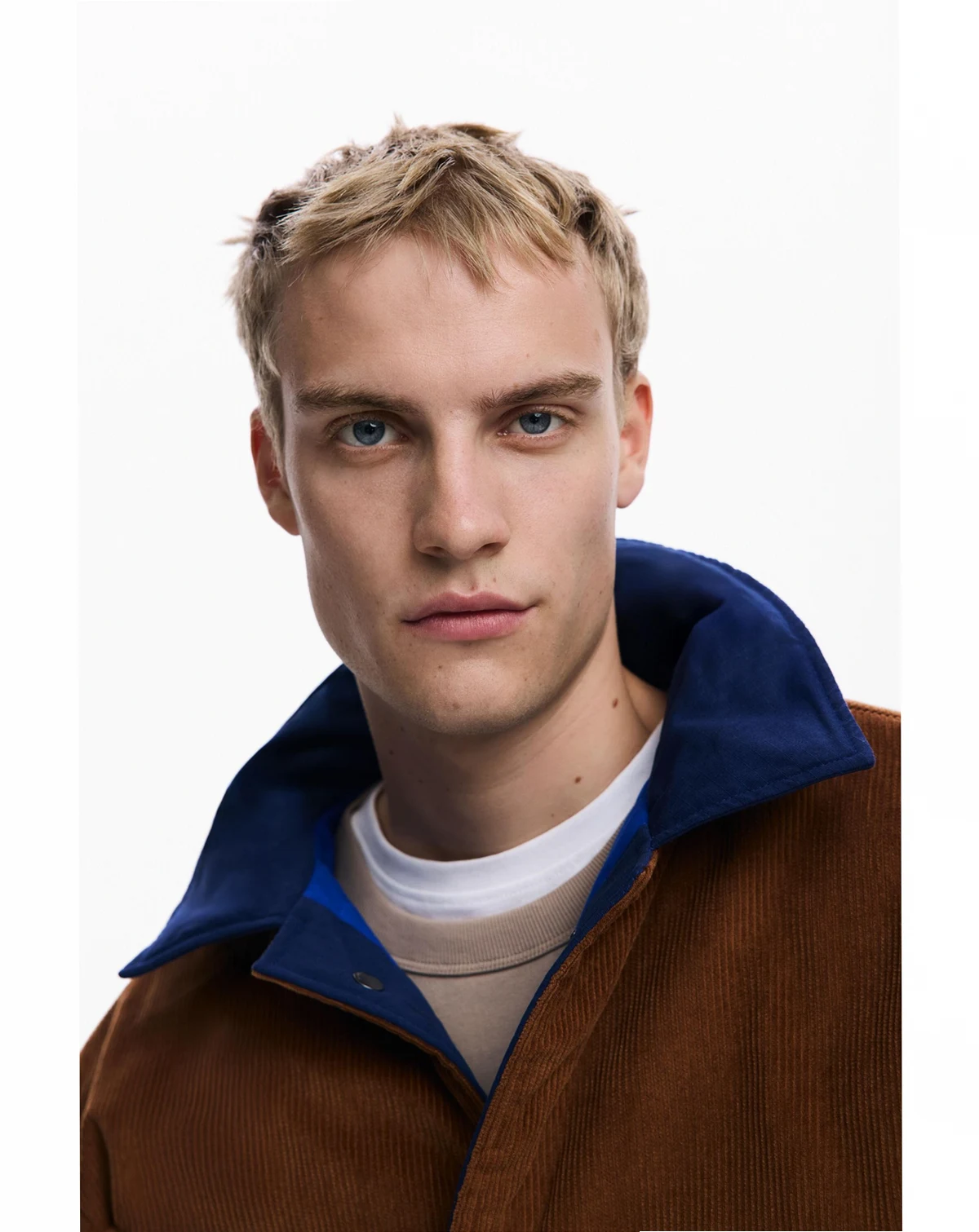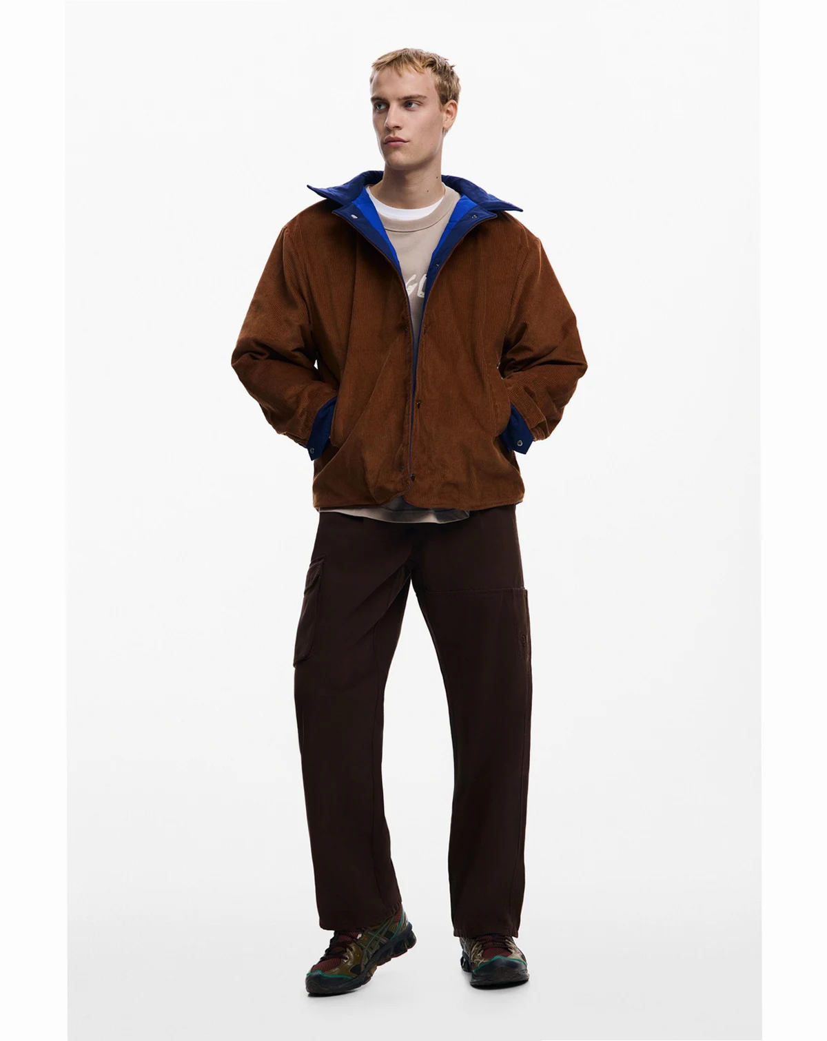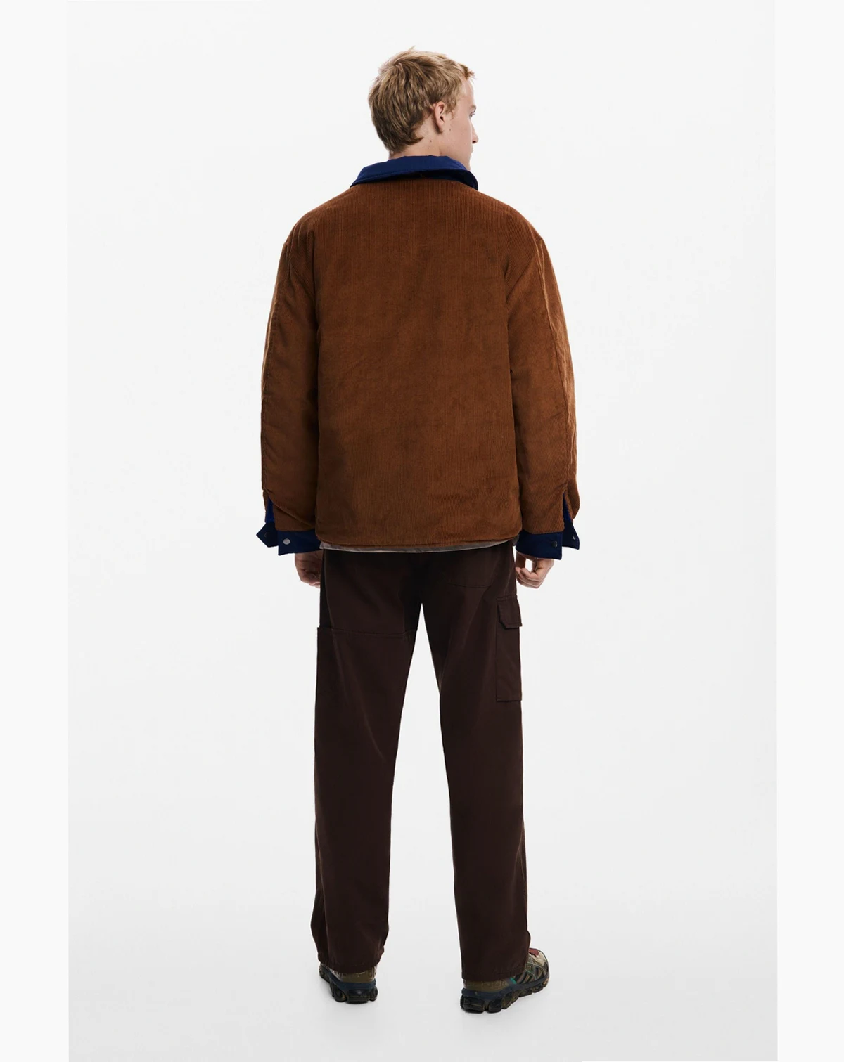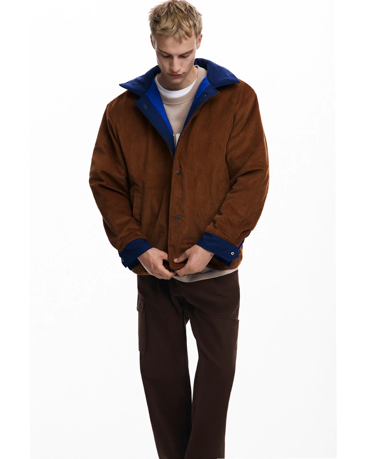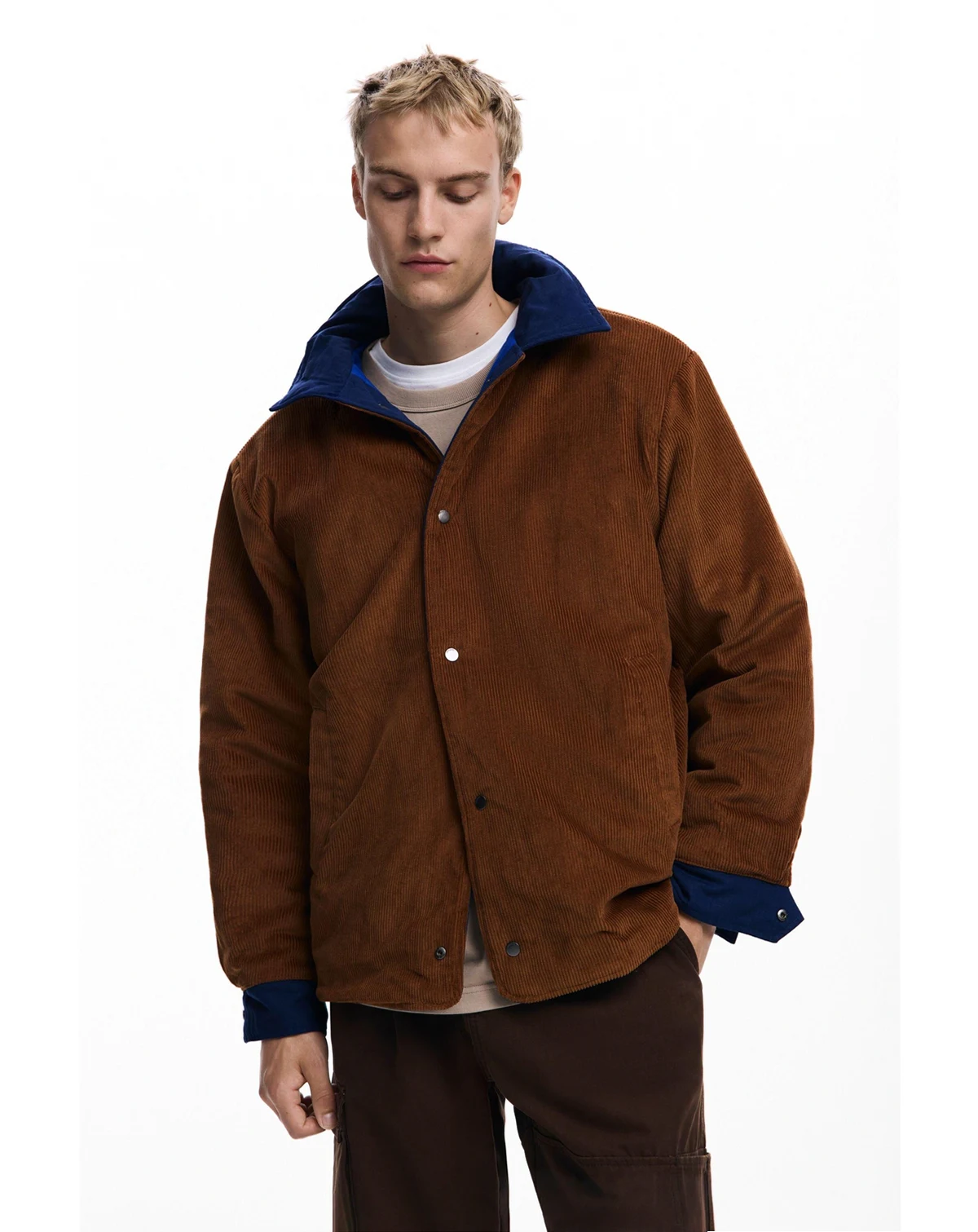 Lightweight reversible padded jacket with shirt-style collar, button closure, and pockets on both sides.