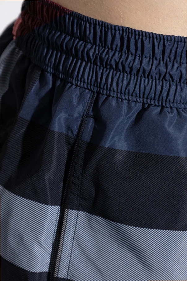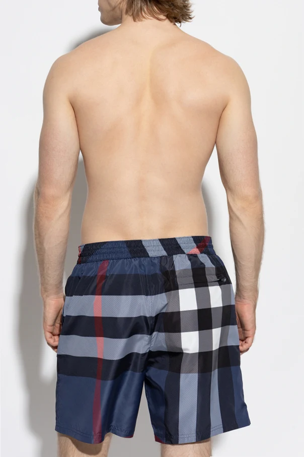Introducing the Check-Pattern Swim Shorts by Burberry — a striking embodiment of effortless sophistication and contemporary design. Rendered in a deep navy blue, these classic swim shorts are tailored in a timeless, straight silhouette that falls just above the knee.