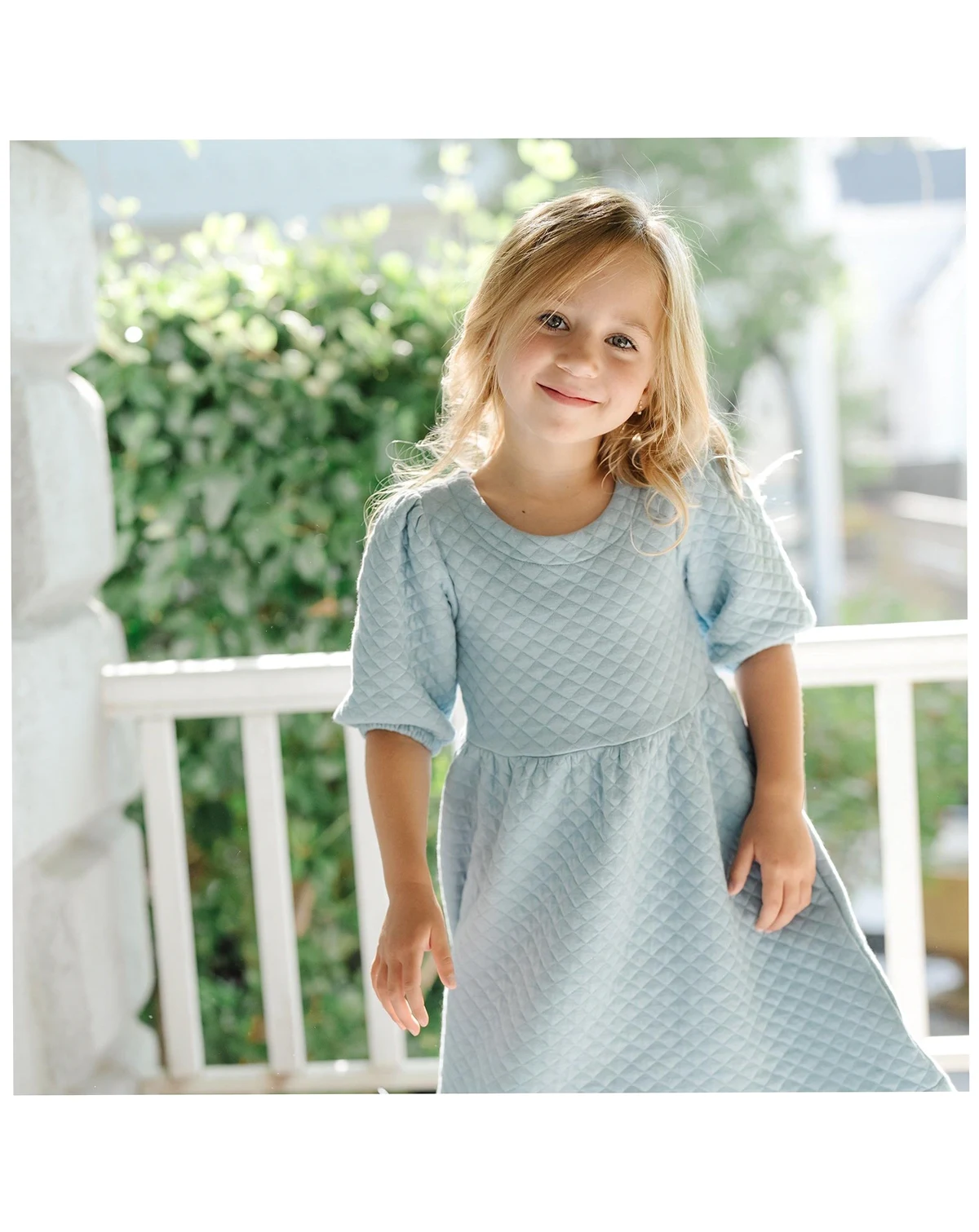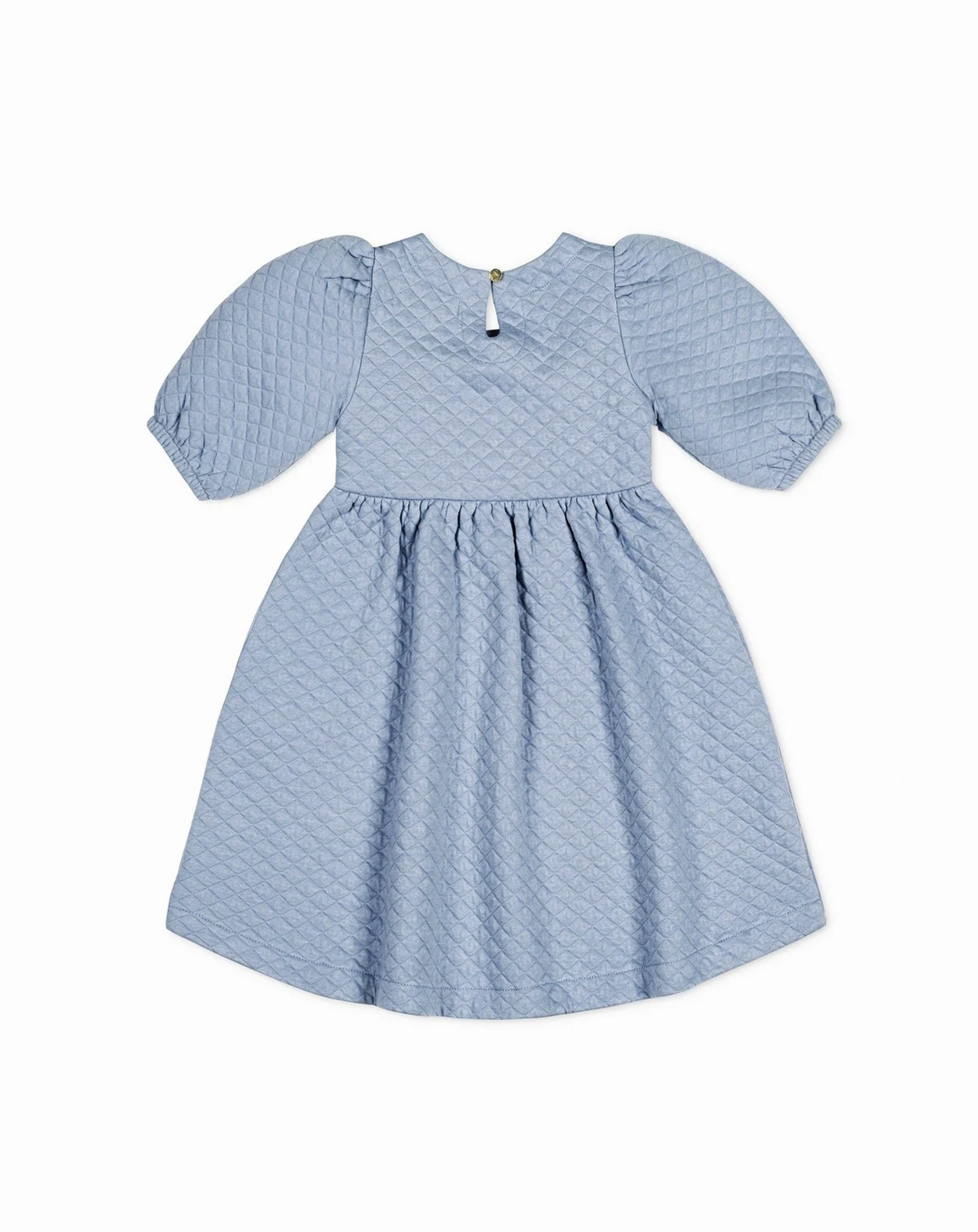 It's all about a dramatic silhouette and soft, subtle texture in our gorgeous quilted organic cotton blend knit dress. Features puff sleeves and a twirly skirt that is easy and comfortable for your girl to wear, while the gold button keyhole closure at the back neck adds a hint of sophistication.