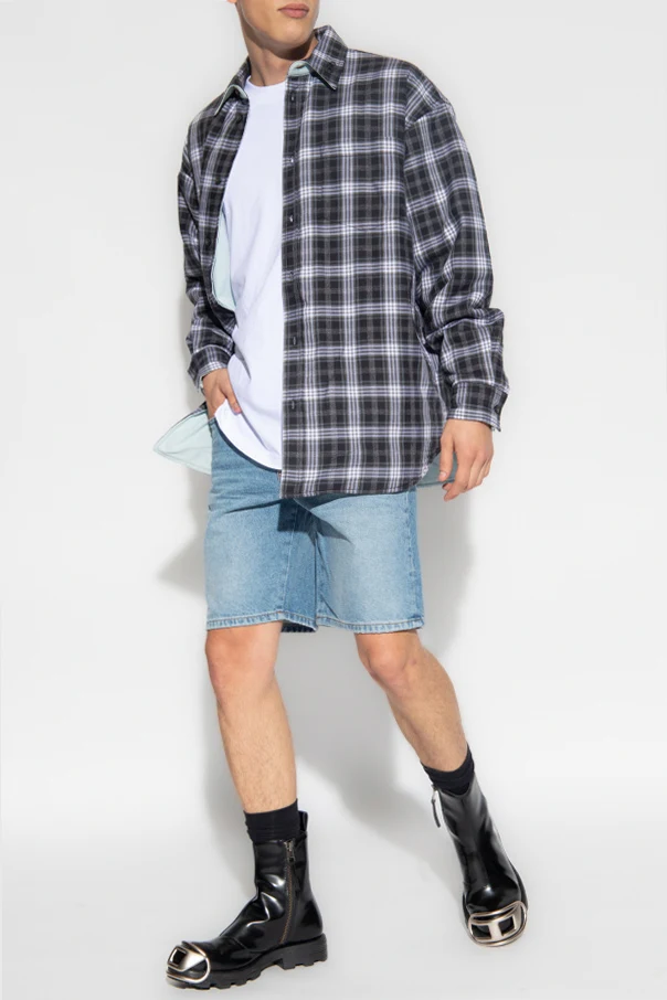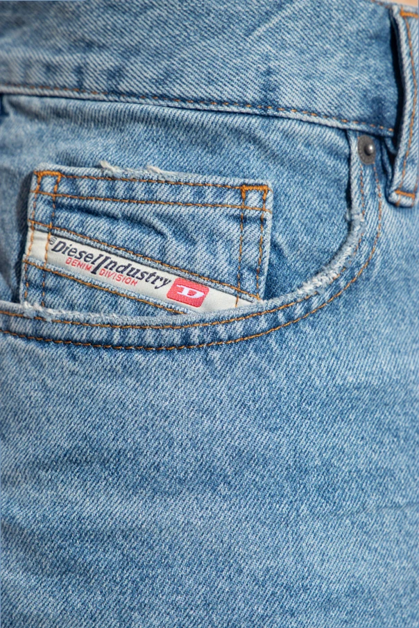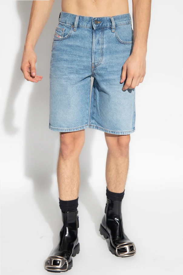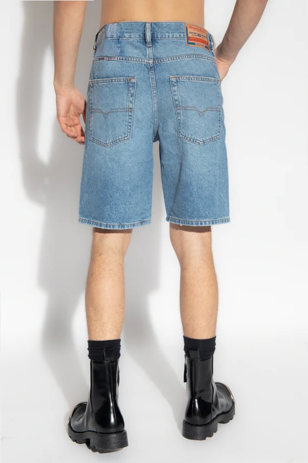 Blue denim shorts from Diesel. Emblazoned with a logo patch, this pair features a zip fly with a button, distressed effects and classic five-jean pockets.