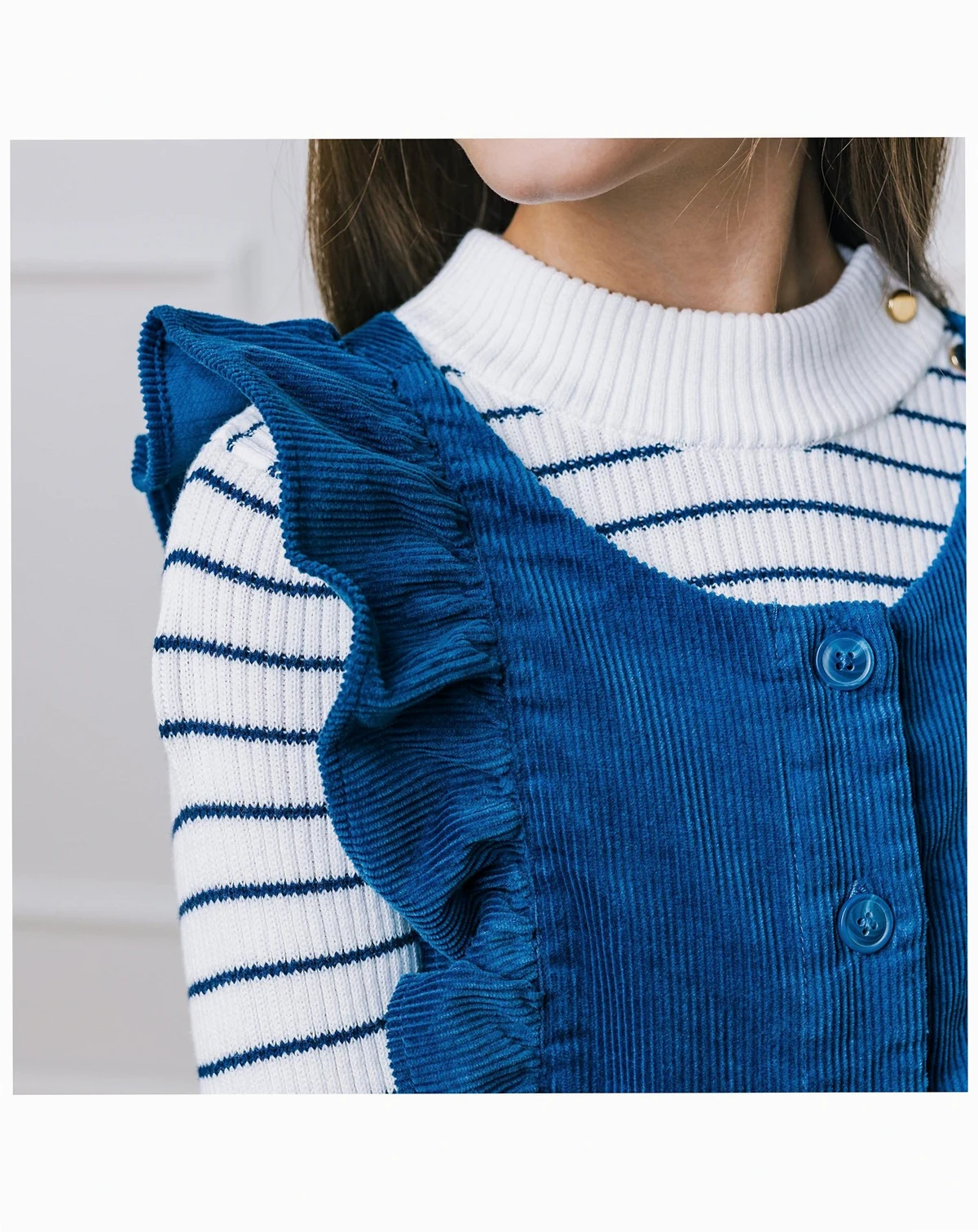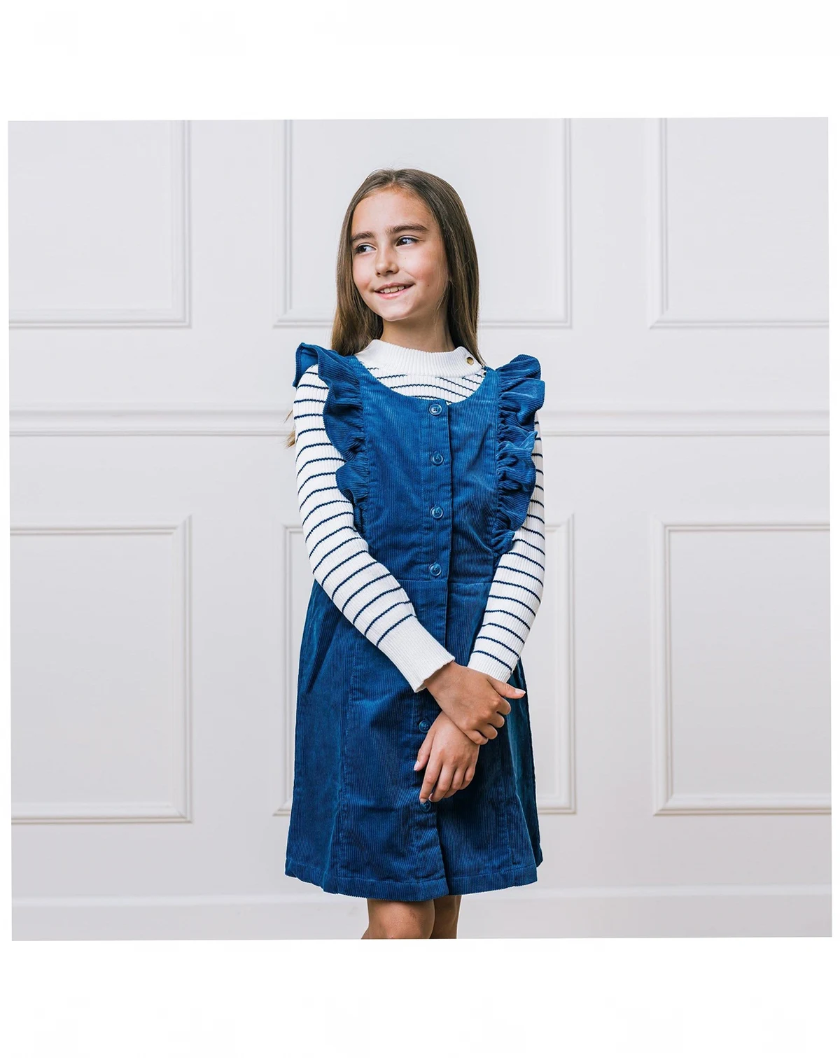 Our pretty pinafore jumper is perfect for transitioning from warm fall days to layering with tops and tights when the temperature drops. Features a sweet jumper silhouette, ruffled sleeves, and a button front closure - all cut in organic cotton corduroy that looks so put together.