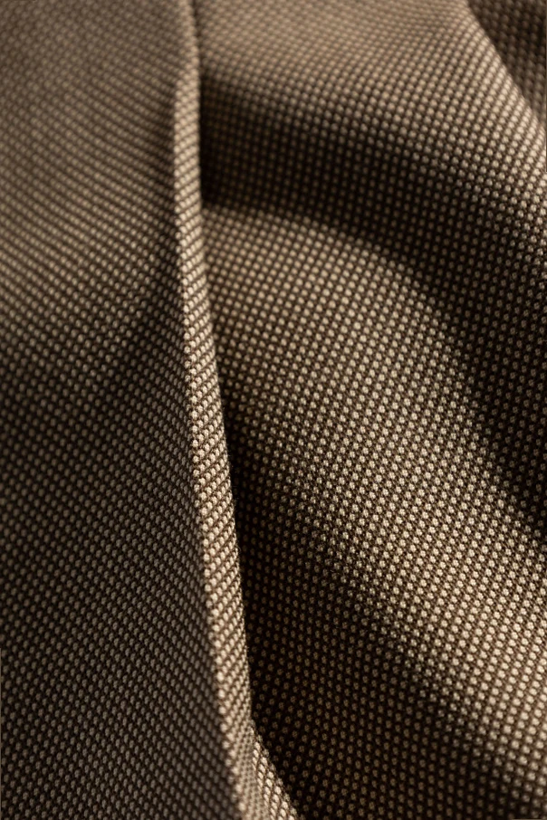 Introducing the epitome of elegance and refinement in menswear - the Pleated Casual Trousers by Saint Laurent . Crafted from an exquisite blend of materials with a dominant herringbone texture , these trousers exude a luxurious appearance reminiscent of premium wool. The rich brown hue and visible fabric texture elevate the garment's exclusive look, making it a staple for any discerning gentleman's wardrobe.