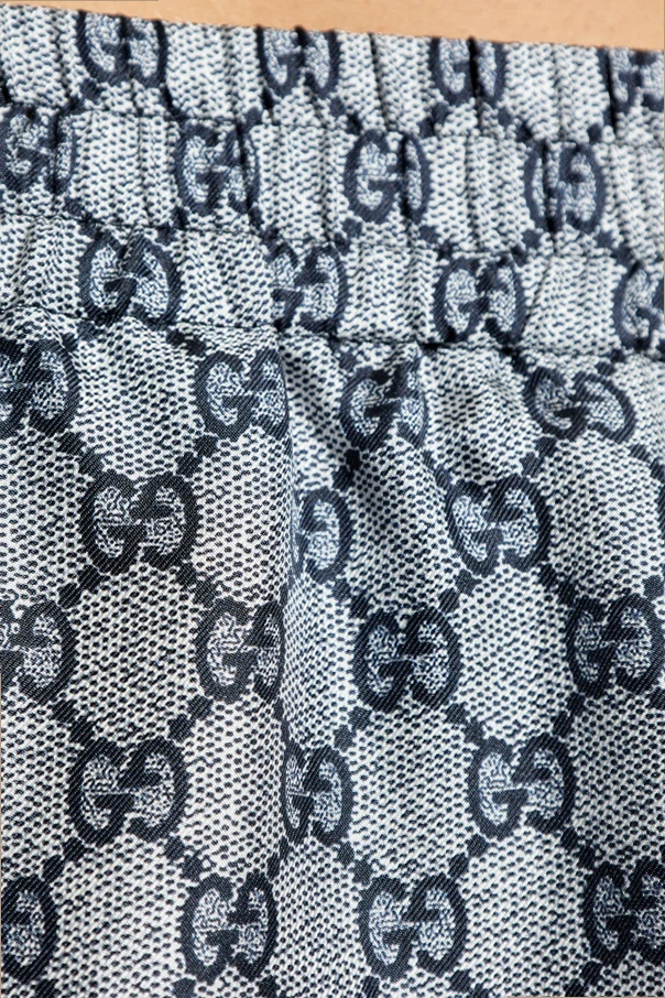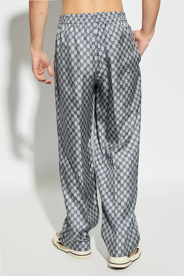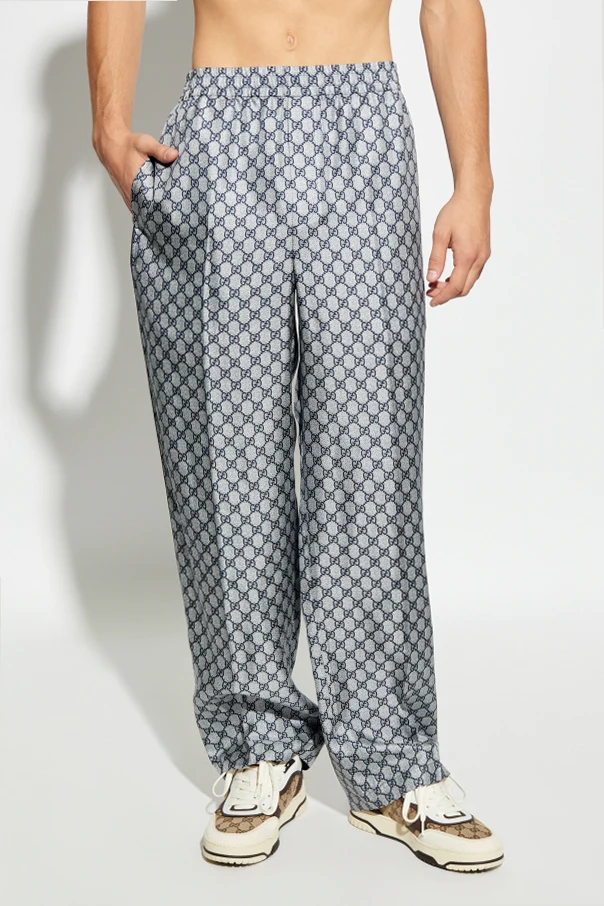 Crafted from the finest silk, these pants exude a sumptuous sheen and luxurious feel. The straight cut with wide legs ensures unparalleled comfort, while the elastic waistband offers a perfect fit. The signature navy blue hue is adorned with a darker shade of the distinguished "GG" monogram pattern, a hallmark of Gucci's timeless elegance.
