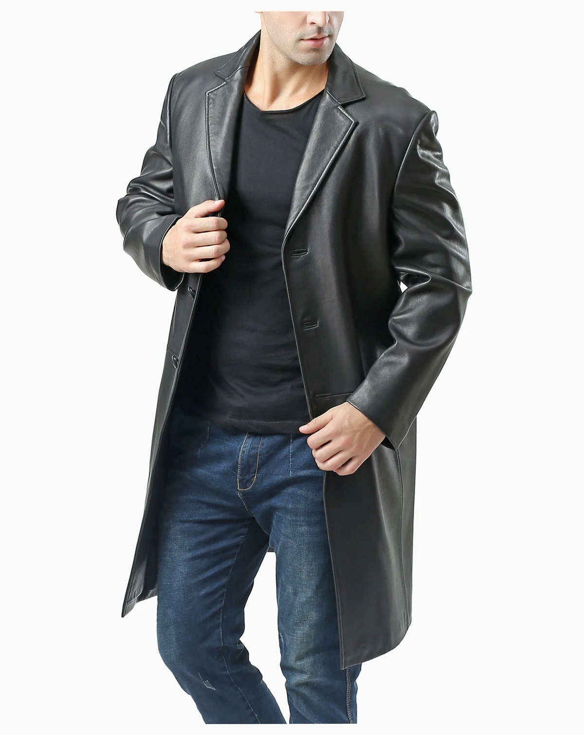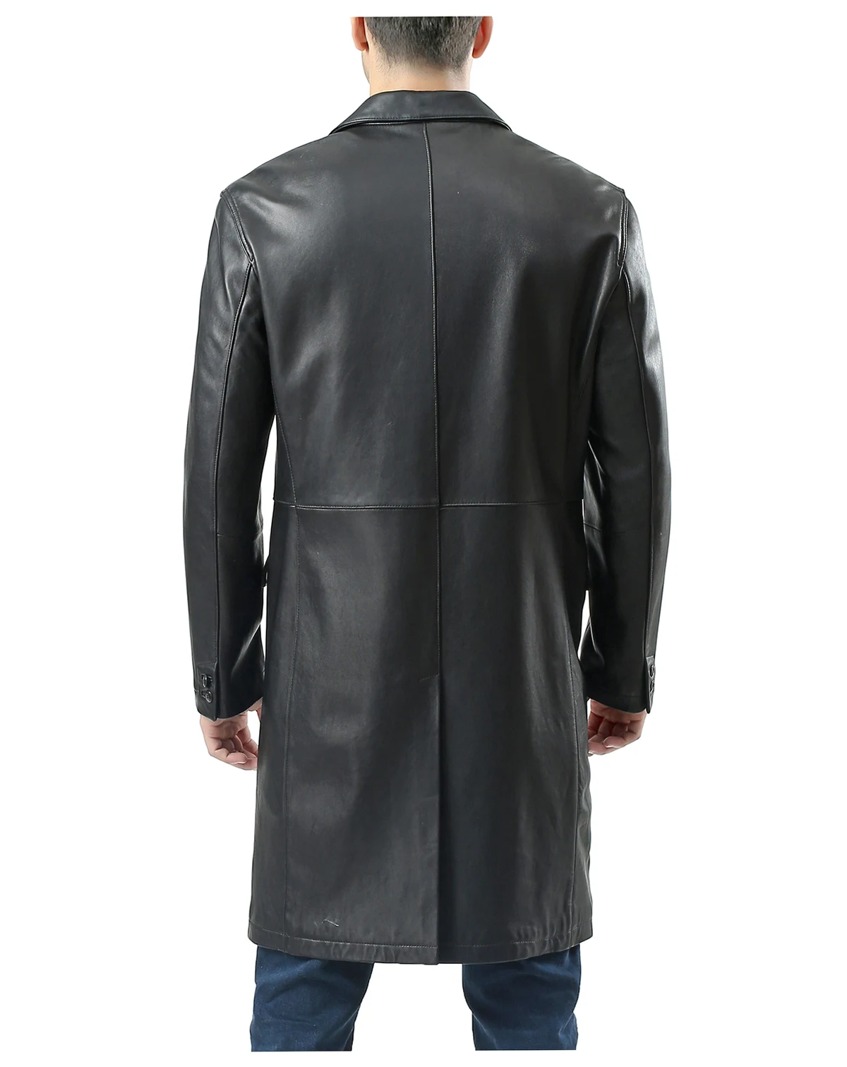 Luxe, single-breasted leather walking coat features notch collar, natural shoulders and flap patch pockets in butter-soft leather.